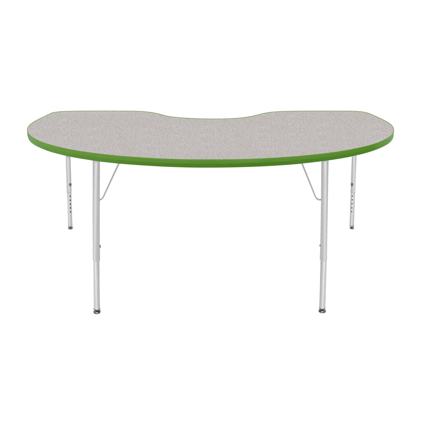 This unique kidney shaped activity table is perfect for your classroom. The bright high pressure laminate surface comes in your choice of seven finishes and your choice of a ball or a self-leveling glide with matching leg uppers in eleven trims. Moisture will not soak through the surface and the laminate is safe, non-toxic, and stain resistant on this classroom furniture table. Gum and other substances are easily removed and the durable rounded edges eliminate sharp corners.