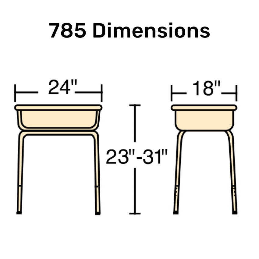 The Virco 785M desk features a hard plastic work surface and an open-front plastic book box. The base is constructed from tubular steel for added durability. These materials are selected for strength, easy maintenance, and classroom readiness, ensuring long-term performance even under heavy student use.
