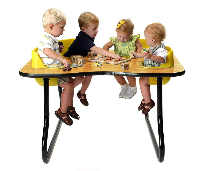 Toddler Tables' Four-Seat Table is a great choice for daycare centers because it allows teachers to interact with and feed up to four children at one time. Toddler Tables come in a variety of sizes to meet all of your childcare needs. Table height is available in 14 or 27 inches and is constructed of high quality, extremely durable 1 1/8th inch laminate top. Each polyethylene seat is easy to clean and supports up to 30 pounds. Seat belts keep your children safe