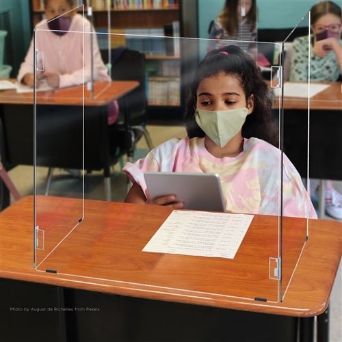 1/8" Acrylic tabletop barrier sneeze guard perfect for schools or smaller spaces. Easily fits on most school desks (compare specs to the size of your desk). Anti-skid rubber feet help with keeping the barrier in place. Choose the "Hinged" side-panel option which allows the side panels to easily open or close and flair out to provide extra elbow room or to fit different shaped desks. The "Fixed" panel option is less expensive but prevents the panels from being opened/closed or adjusted to different widths. Can be customized to size, shape, and options specifications for an additional fee. PPE products are non-returnable.