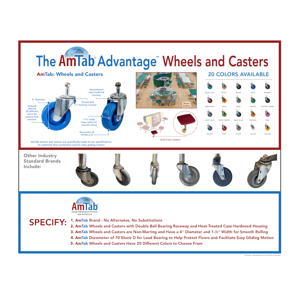 AmTab's Mobile Bench Cafeteria Table folds up easily for storage when you need to free up floor space. It opens and closes smoothly with the assist of a gas cylinder stabilizer. An EZ auto-lock keeps each cafeteria table securely folded during storage. The reinforced 14-gauge steel frame rolls smoothly on four heavy-duty casters that automatically lift off the floor when the table is in use. The tabletop is constructed of solid particleboard with a durable vinyl edging to protect against chipping and peeling. AmTab's Mobile Bench Cafeteria Table is available in several top, frame and edging color options. Made in the U.S.A.