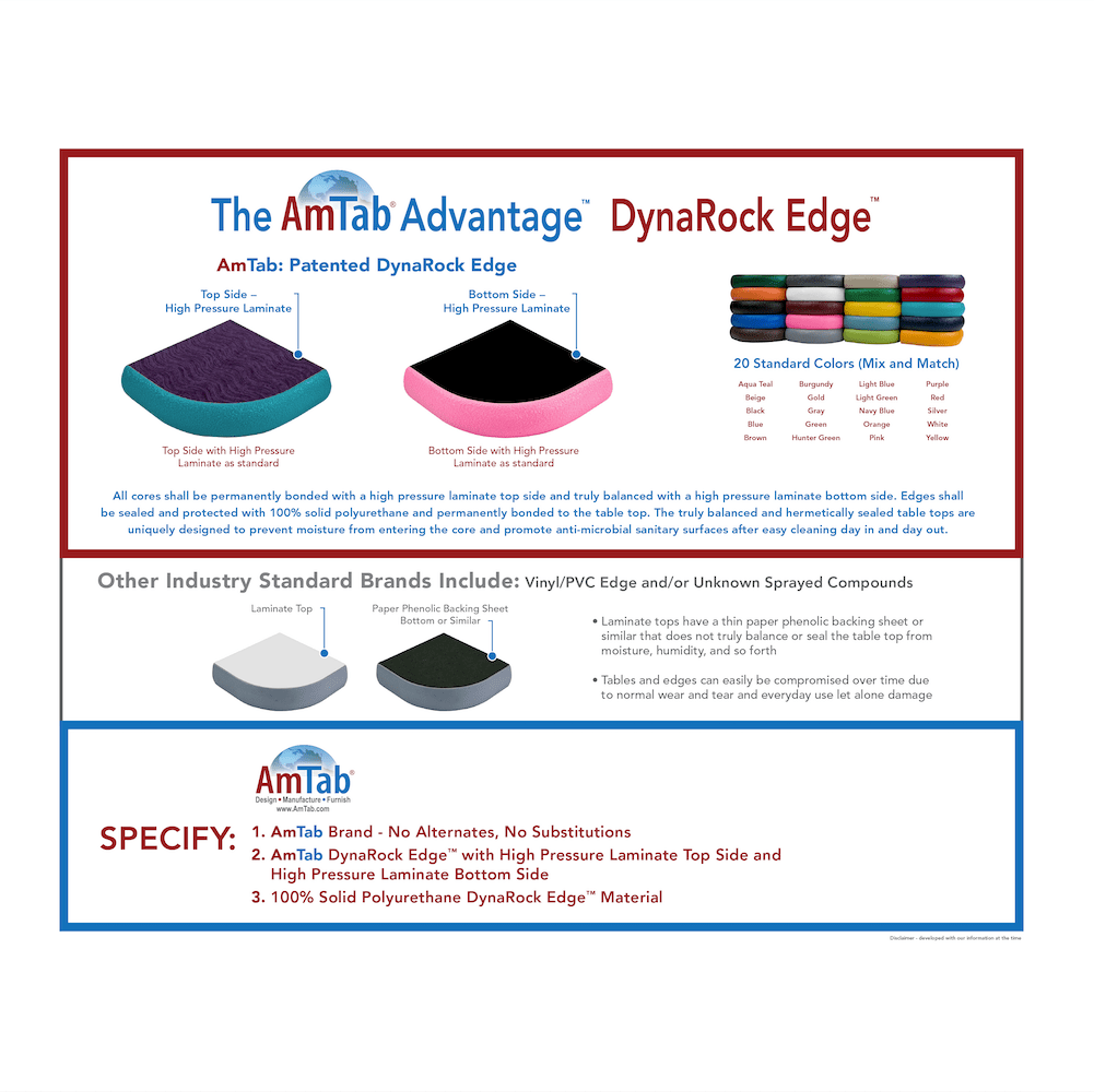 Built with a heavy-duty frame and high-pressure laminate top, the AmTab table is designed to withstand daily wear and tear in busy environments.