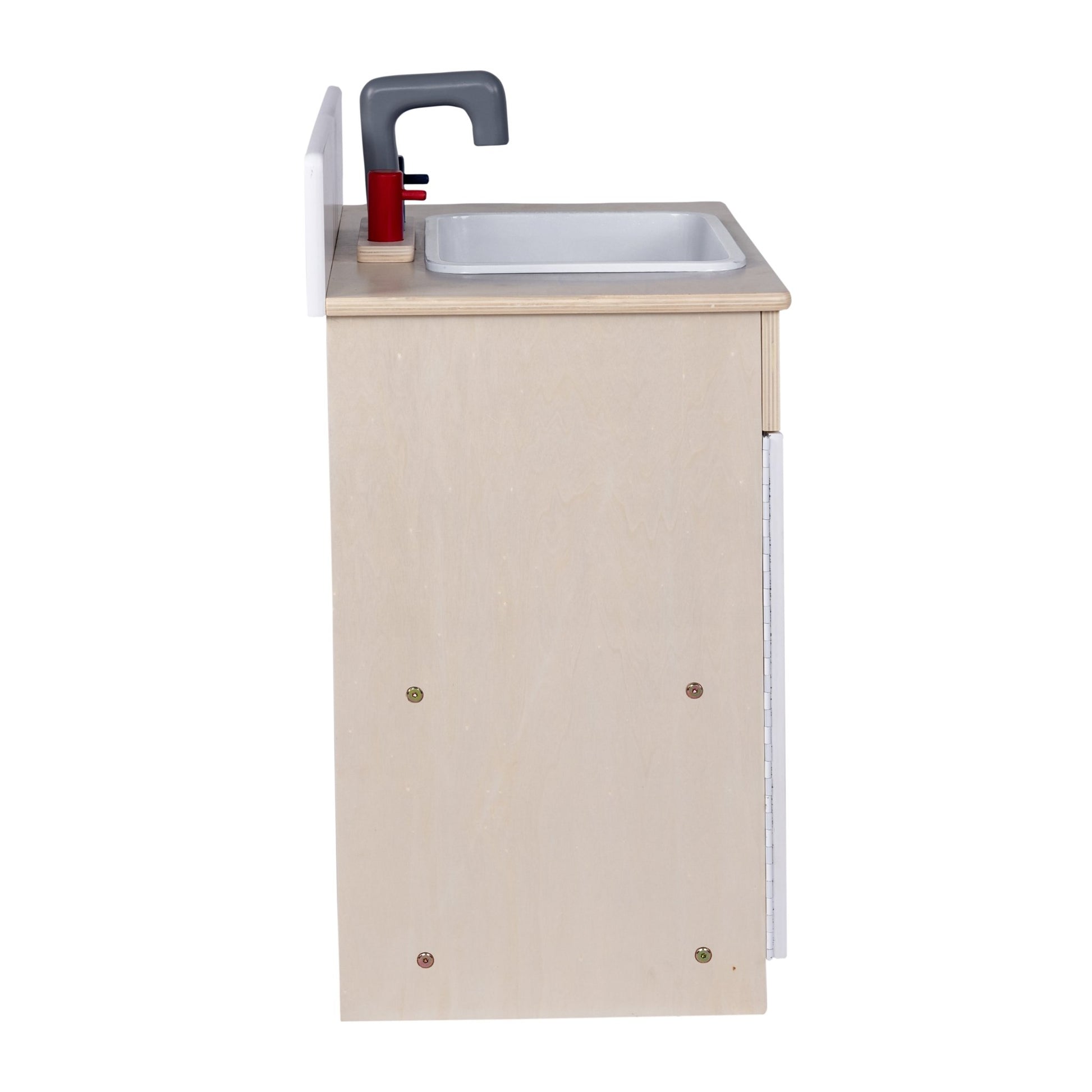 - Realistic Design: Our kitchen sink has white cabinet doors for a modern look. Just enough details are included to encourage kids to get started with hours of dramatic play. The sink features a realistic faucet, control knobs, and a backsplash.