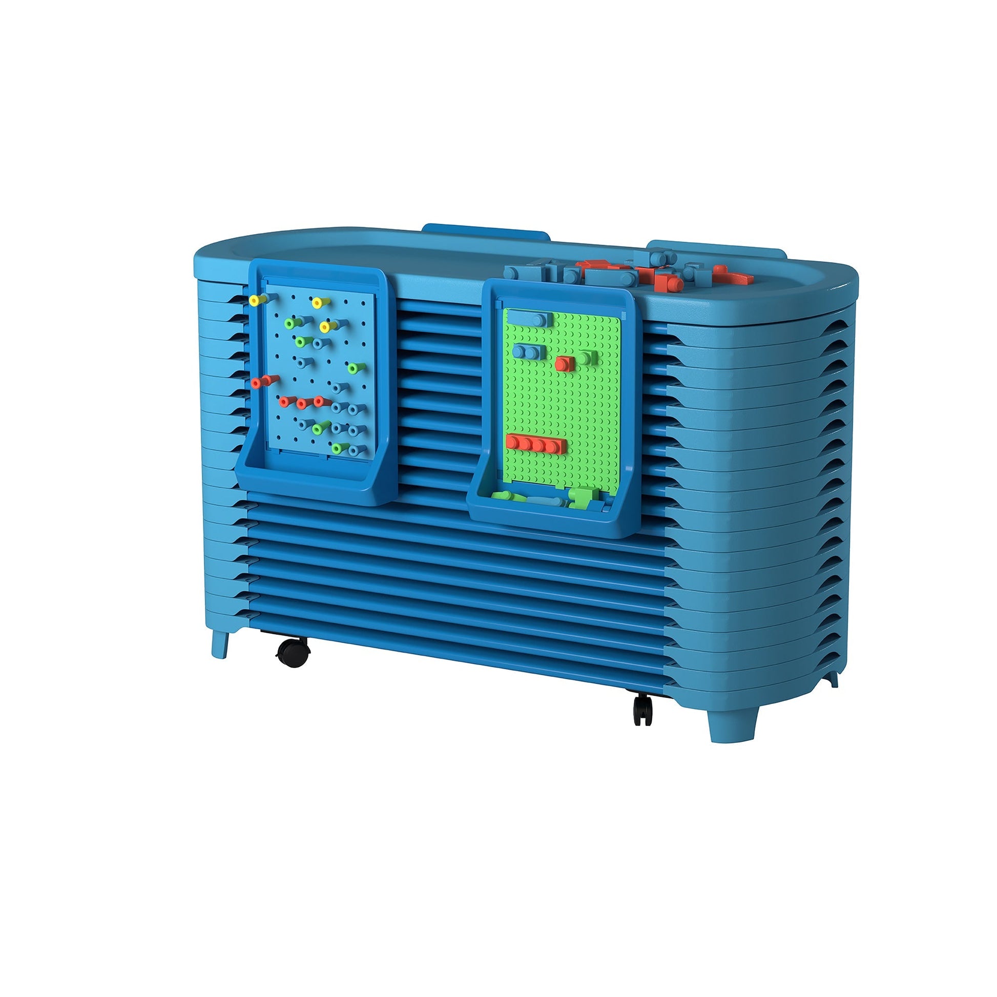 SpaceLine® Activity Center with Space line® Cots includes 20 standard SpaceLine® cots, 1 cot carrier, 1 flannel activity panel with 30 flannel shapes, 1 pegboard activity panel with 25 pegs, 1 magnetic write-and-wipe activity panel with 30 magnetic letters, 1 preschool brick-compatible activity panel with 36 MEGA® Blocks and 1 activity top.