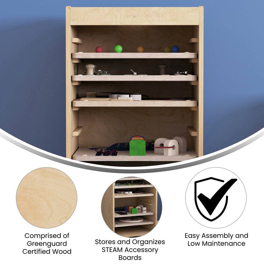 STEAM wall activity boards are great fun for students but what to do with them when you need the wall space for other activities? This mobile storage cart, specifically designed for these accessory boards, gives you a dedicated space to hold up to 8 boards and keeps them tidily out of the way until they are needed again. When it's time to play again, this storage unit can be wheeled right up to the wall while the locking caster wheels ensure the cart stays in place for safety. Beautifully designed with a glossy natural finish, this classroom cart is a space saving must-have for busy environments. Comprised of Greenguard Certified engineered birch plywood that resists stains, yellowing, and scratches, this cart promotes a healthier indoor environment. The kid-friendly design boasts reachable surfaces, a thickened bottom design, and rounded edges that prevent abrasions if bumped and the unit holds up to 300 lbs. static weight. This wooden storage shelf assembles in under 40 minutes and wipes clean with a damp cloth. Purchase other items from our early education collection to create custom configurations for much needed additional storage.