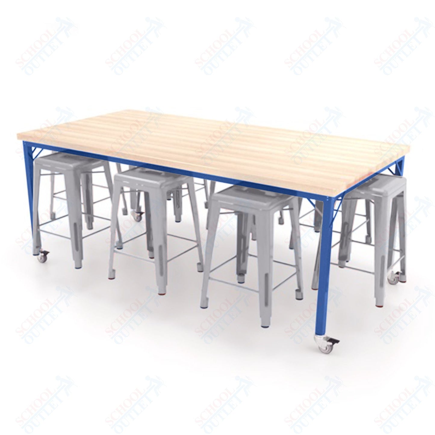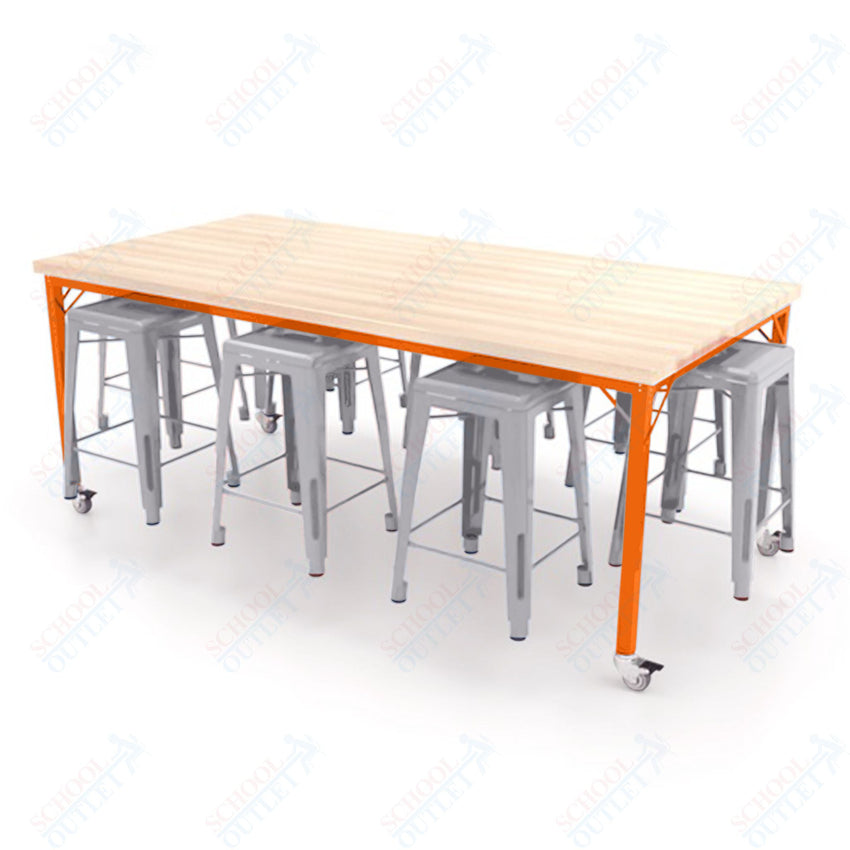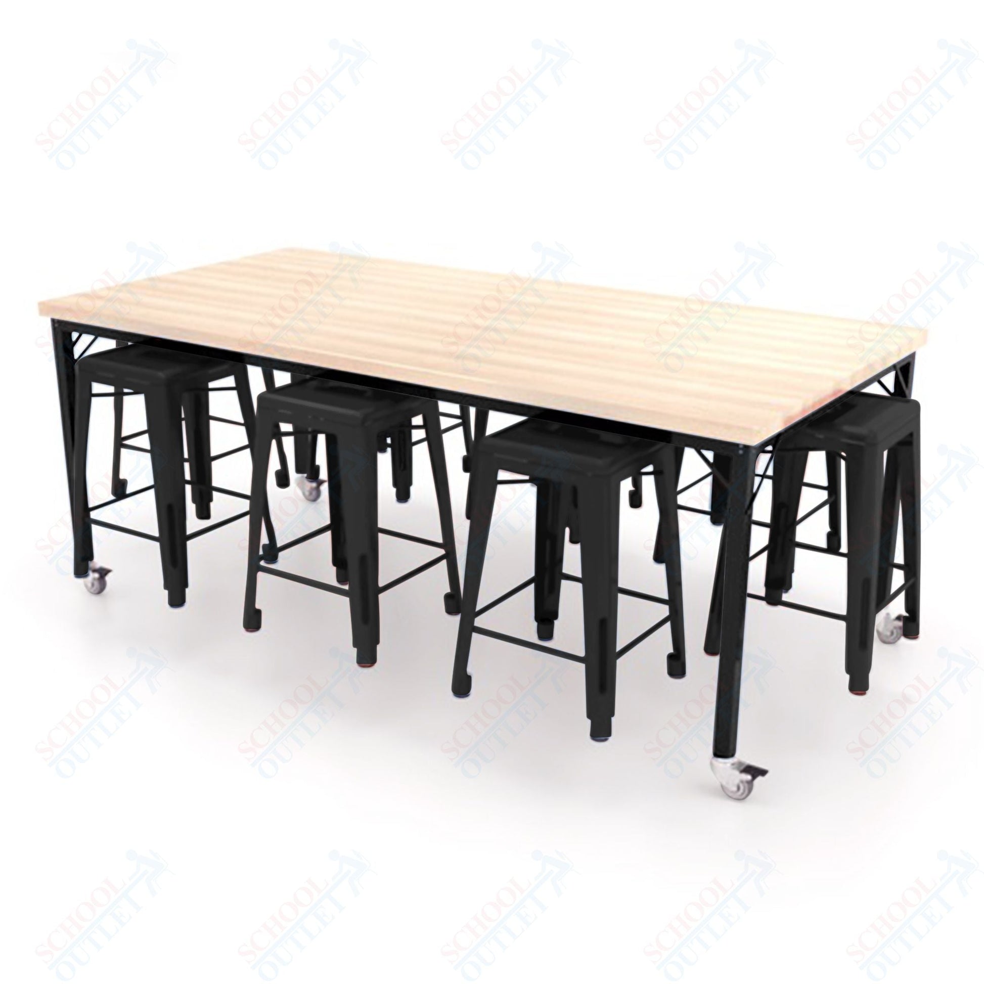 CEF Brainstorm Workbench 34"H with Butcher Block Top and Steel Frame, 8 Magnetic Metal Stools Included, for 3rd Grade and Up ADA Compliant