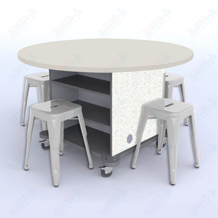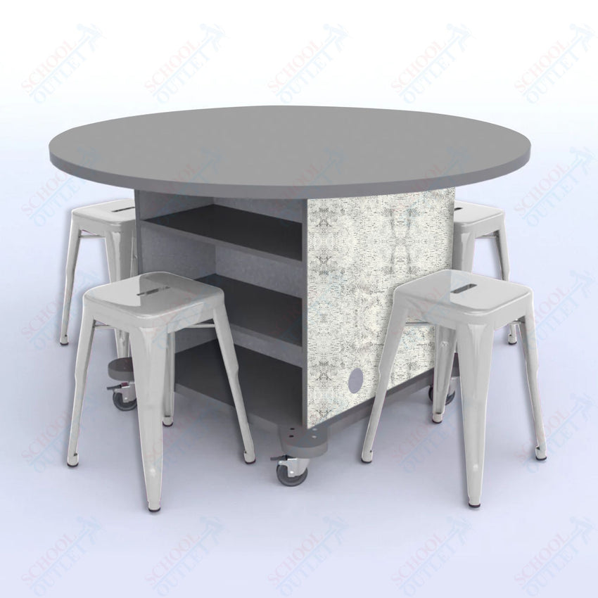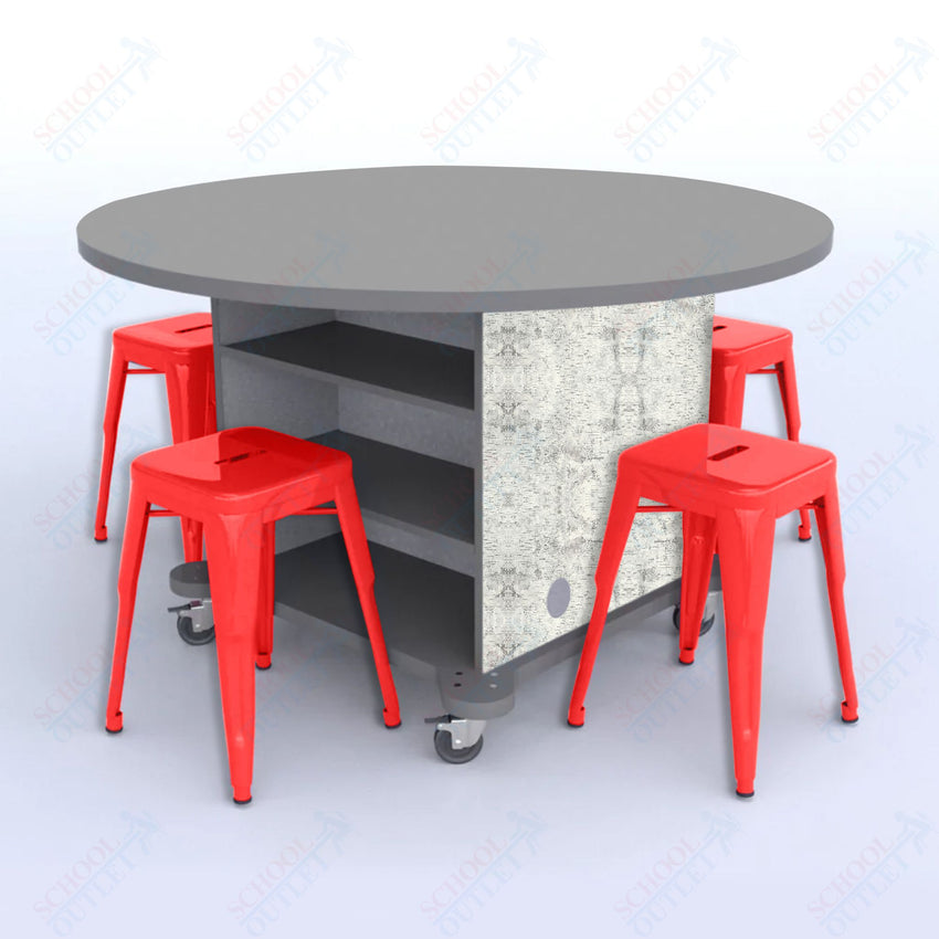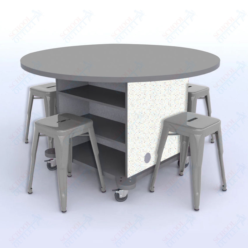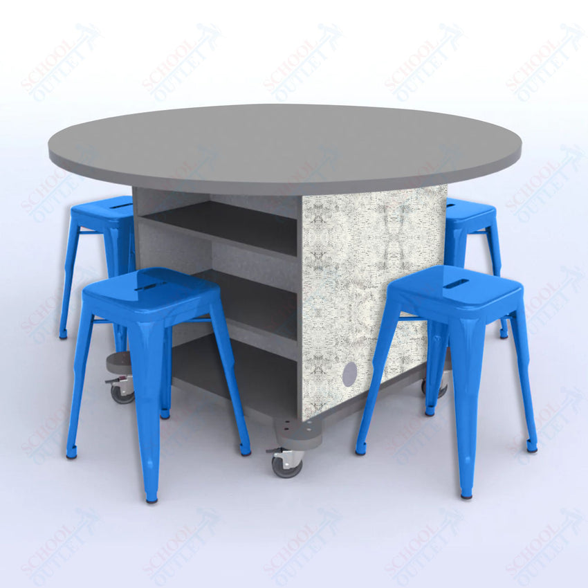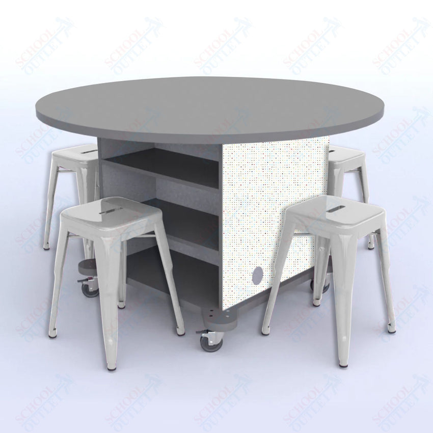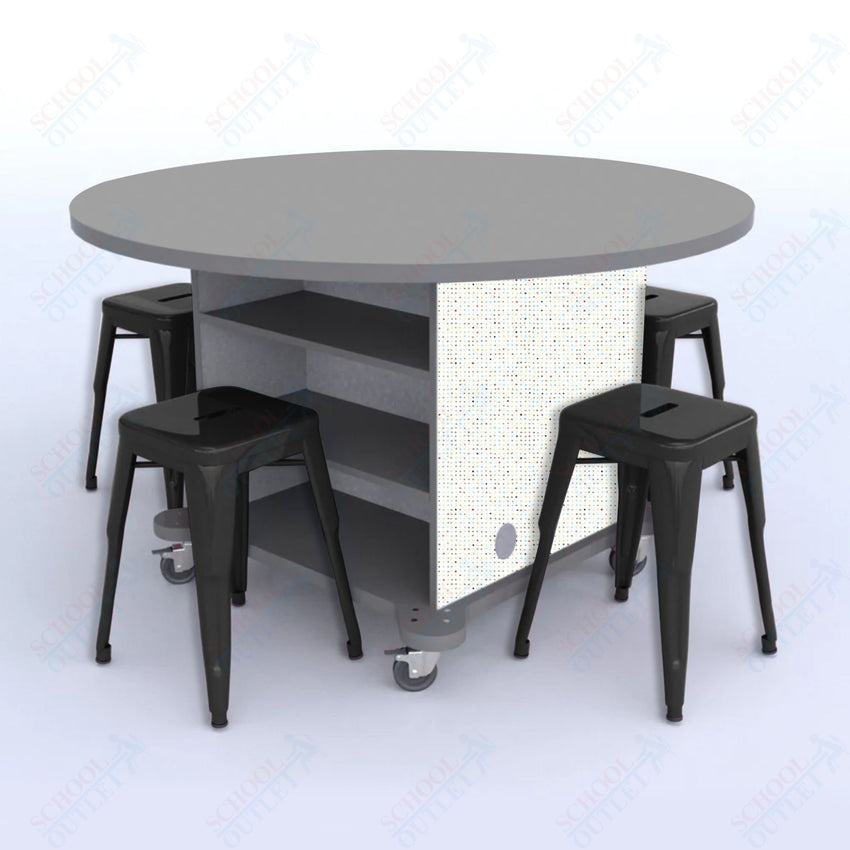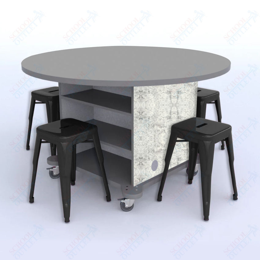 CEF Creation Cube Double-Sided Storage Table - 30"H, High-Pressure Laminate Base and Round Top - 4 Metal Stools Included