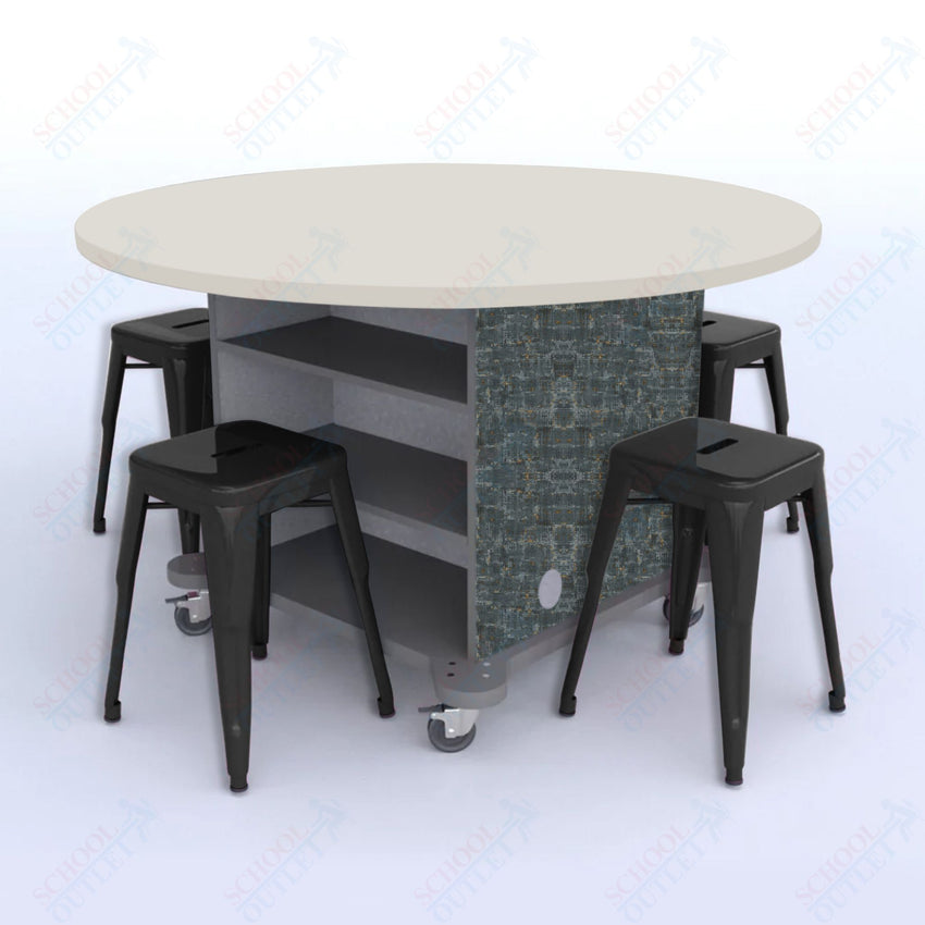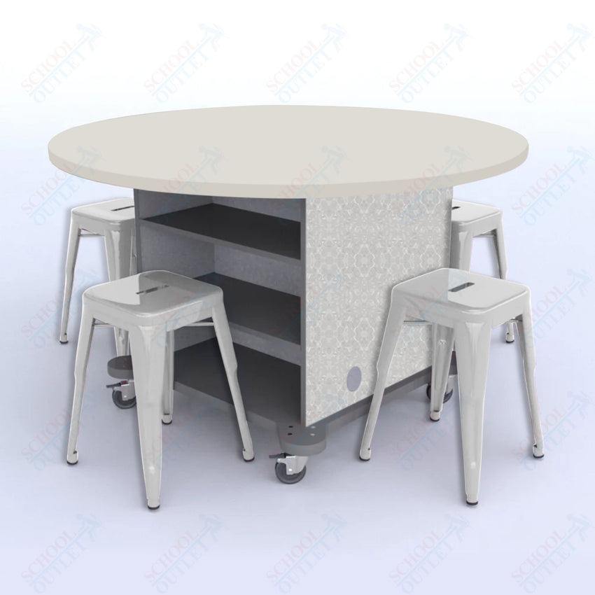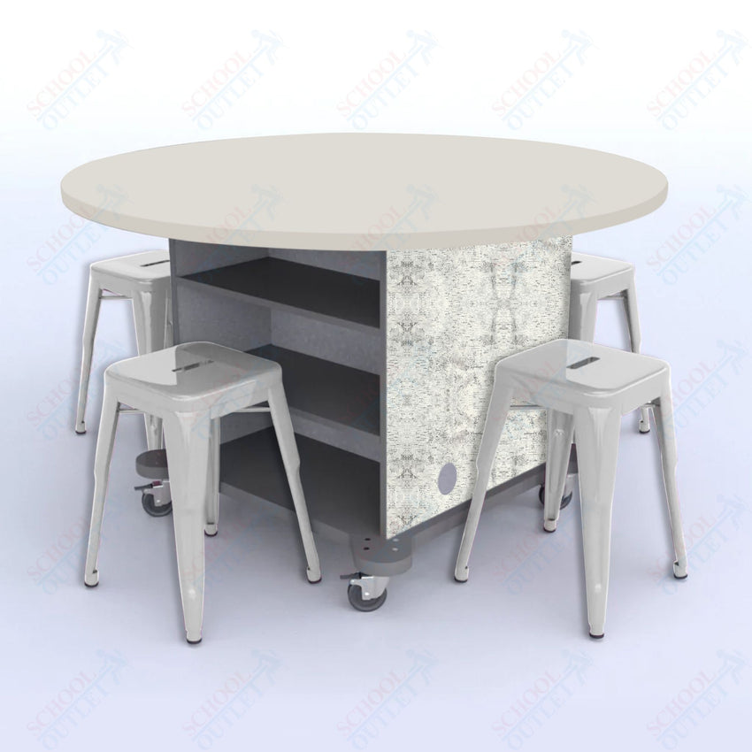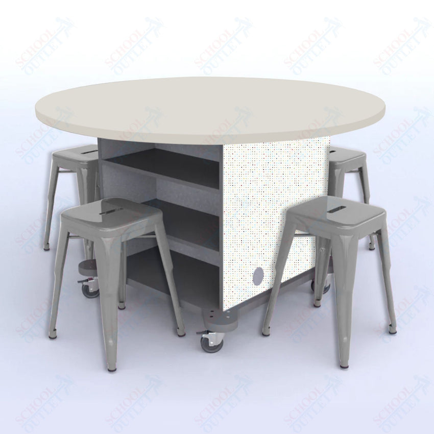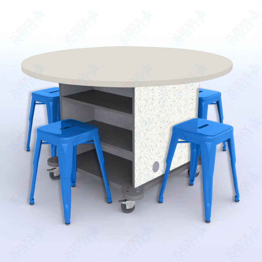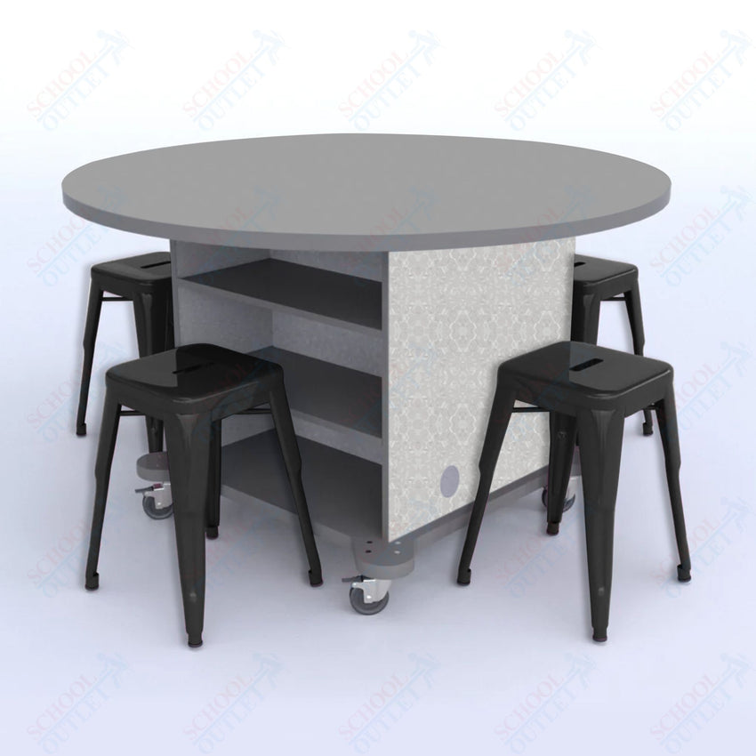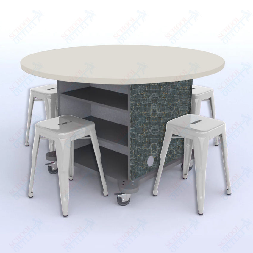 CEF Creation Cube Double-Sided Storage Table - 30"H, High-Pressure Laminate Base and Round Top - 4 Metal Stools Included