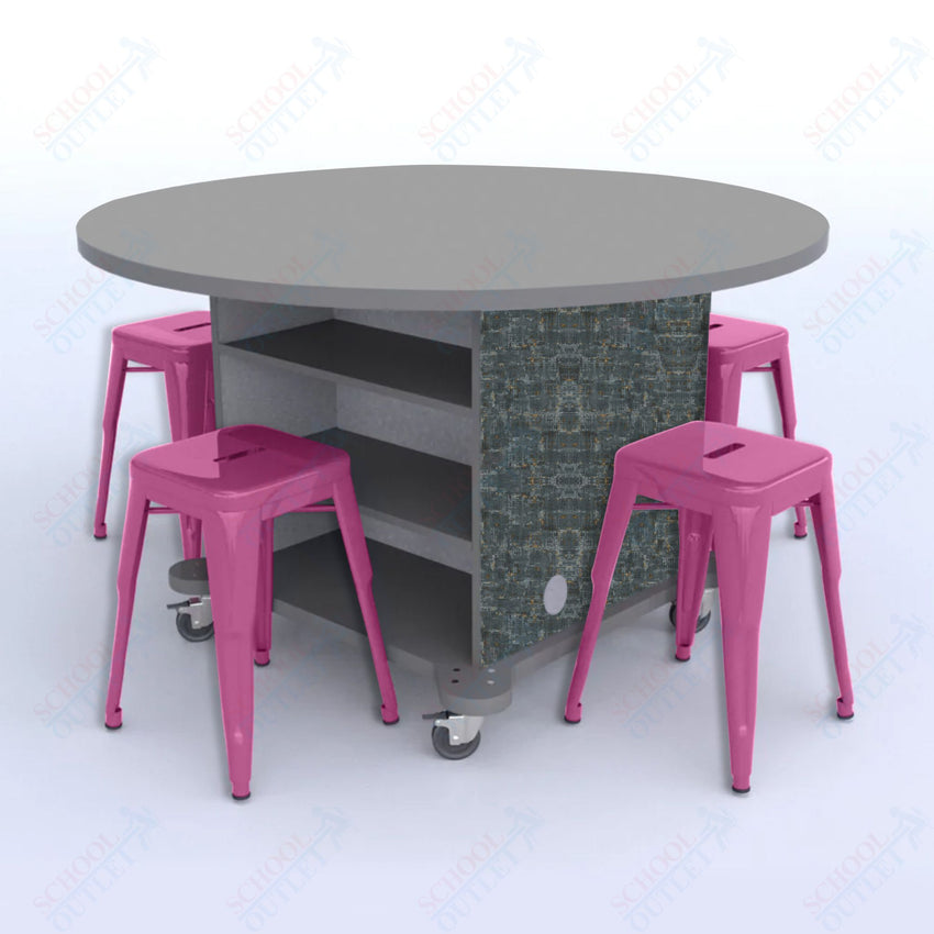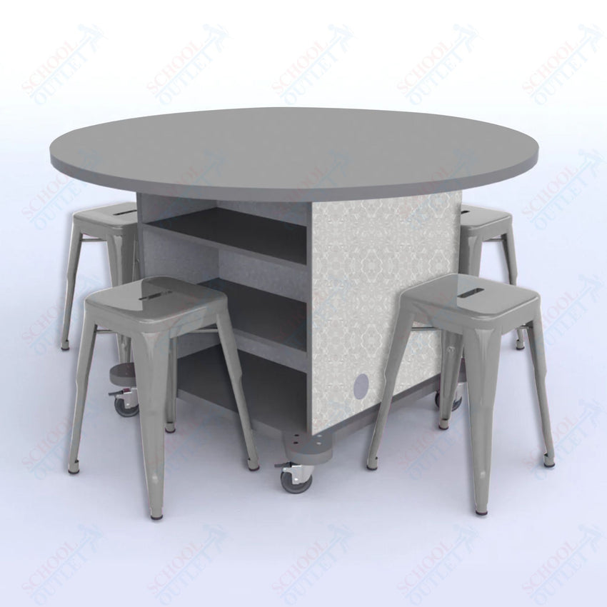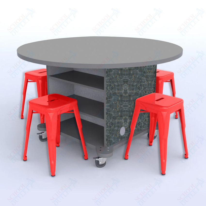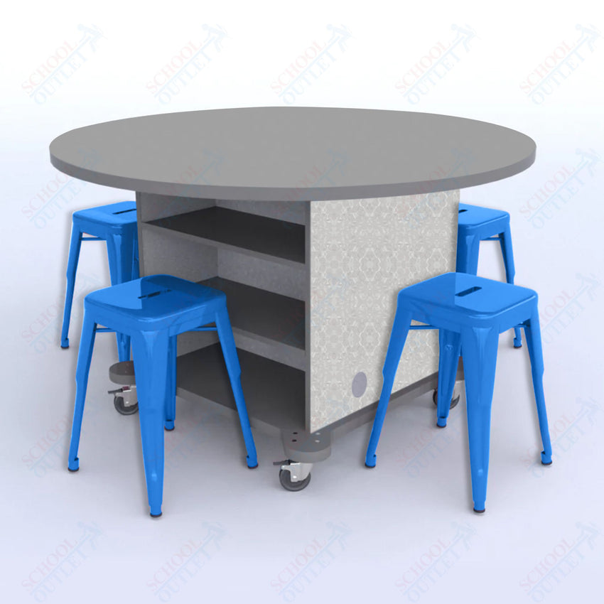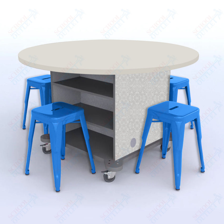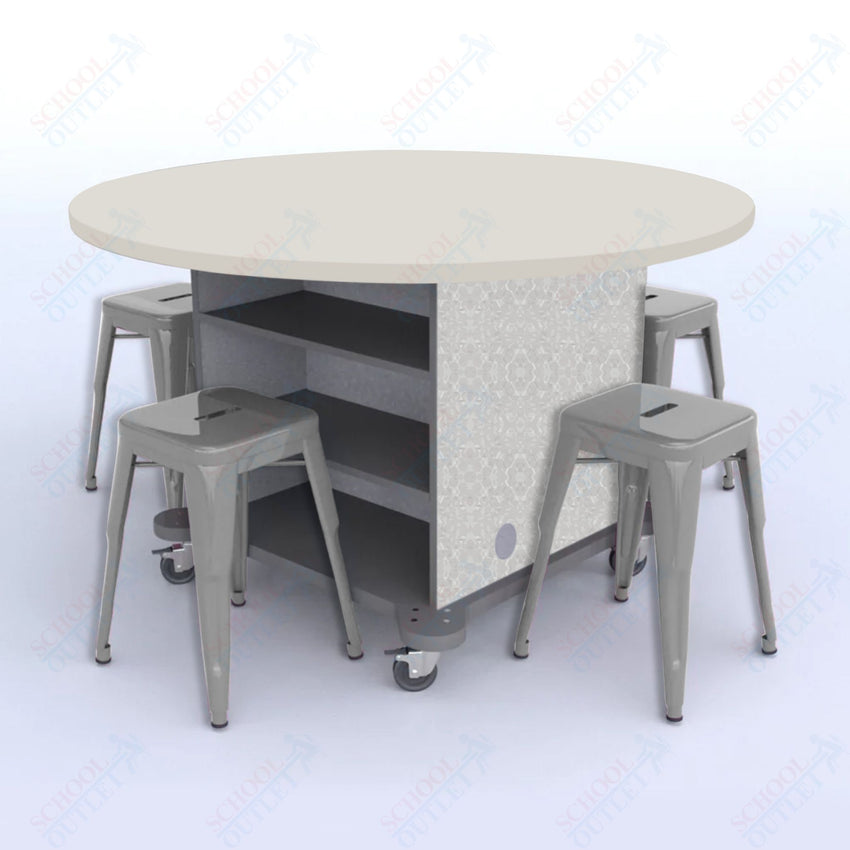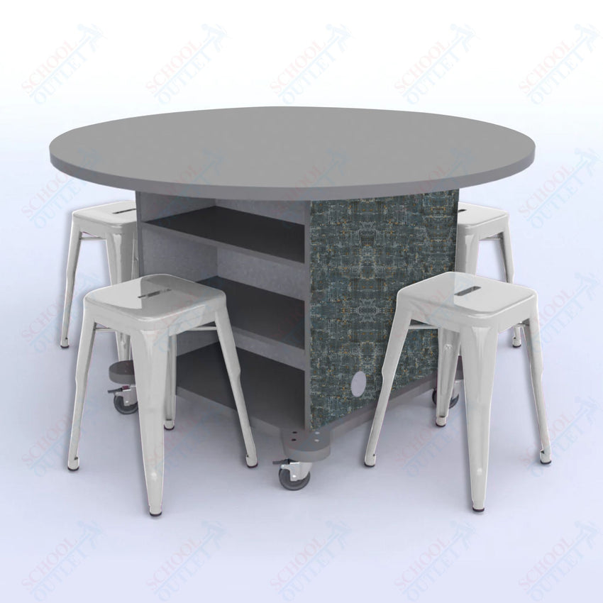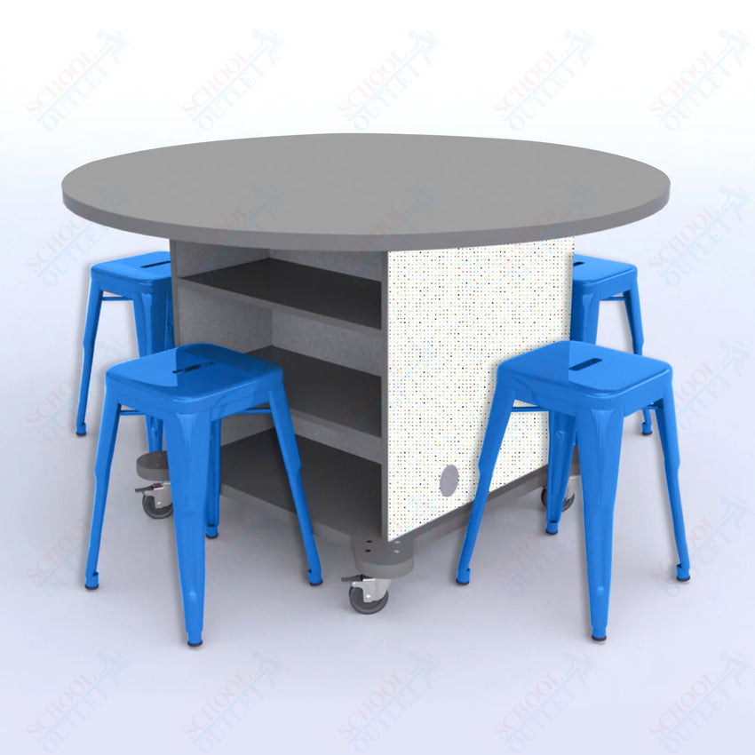 CEF Creation Cube Double-Sided Storage Table - 30"H, High-Pressure Laminate Base and Round Top - 4 Metal Stools Included