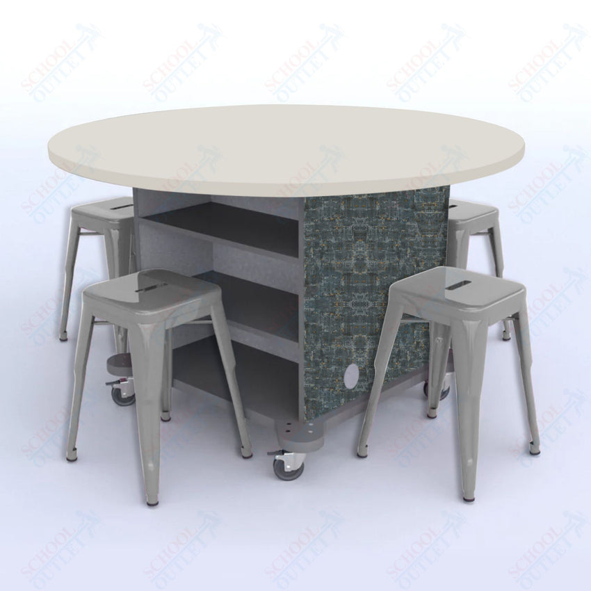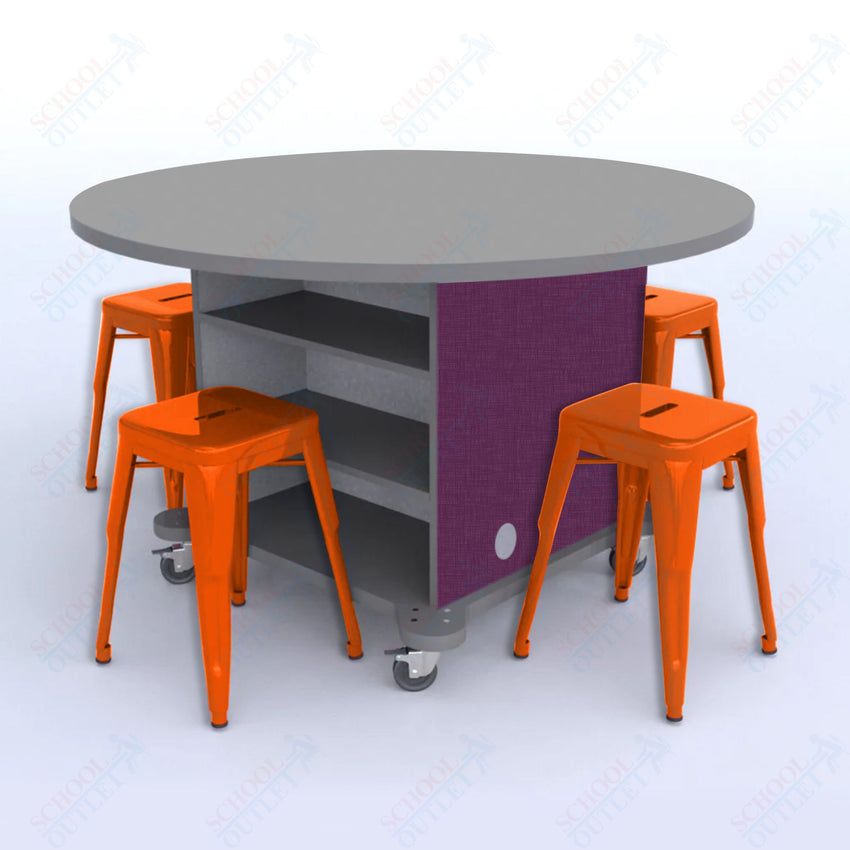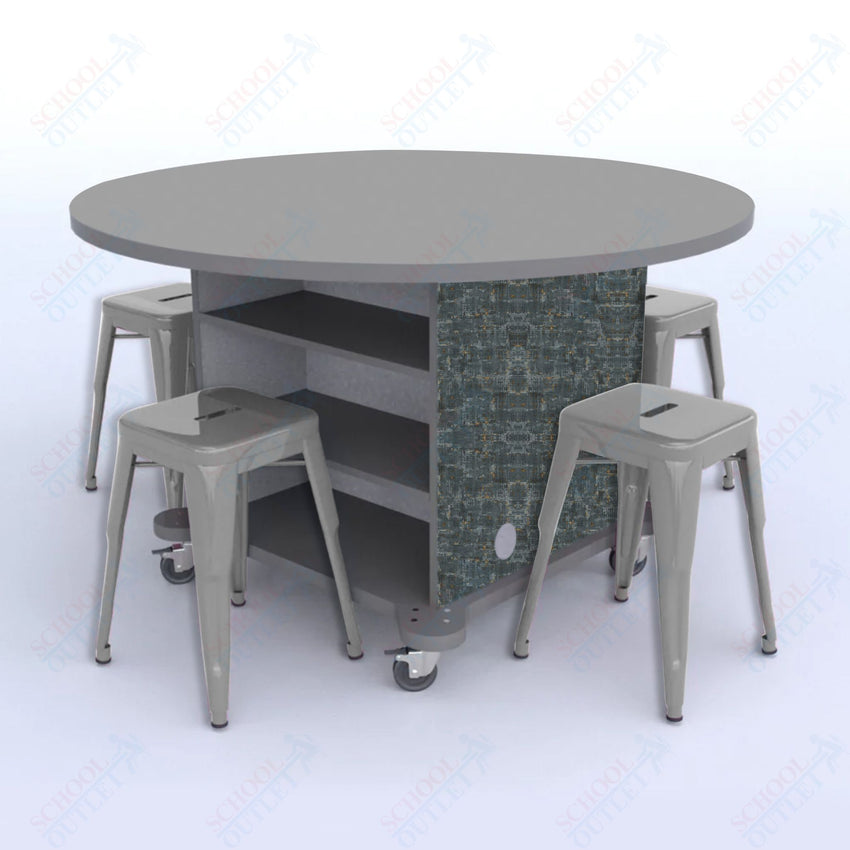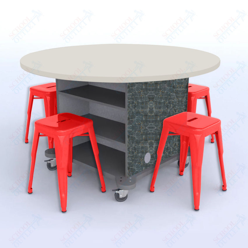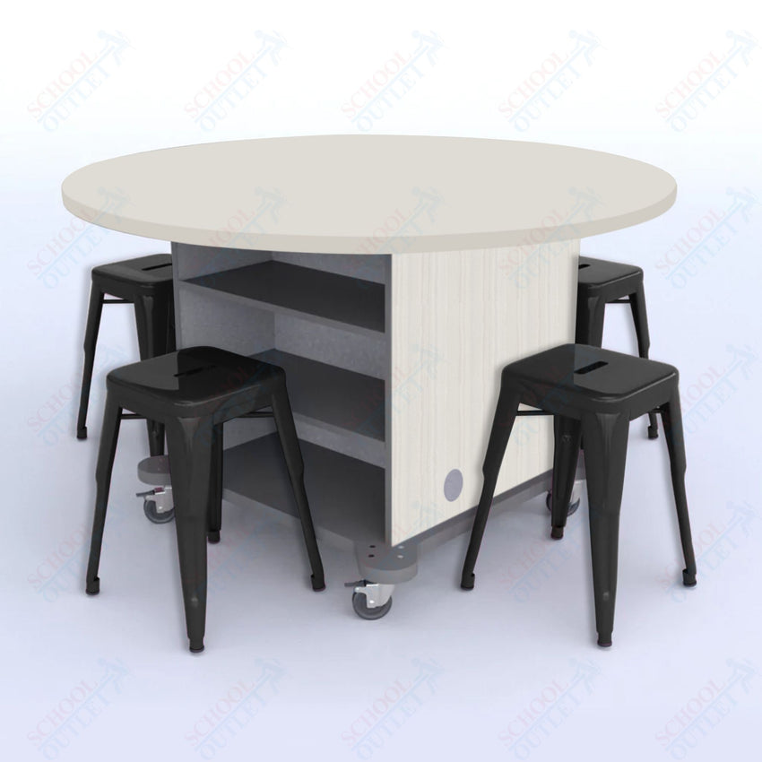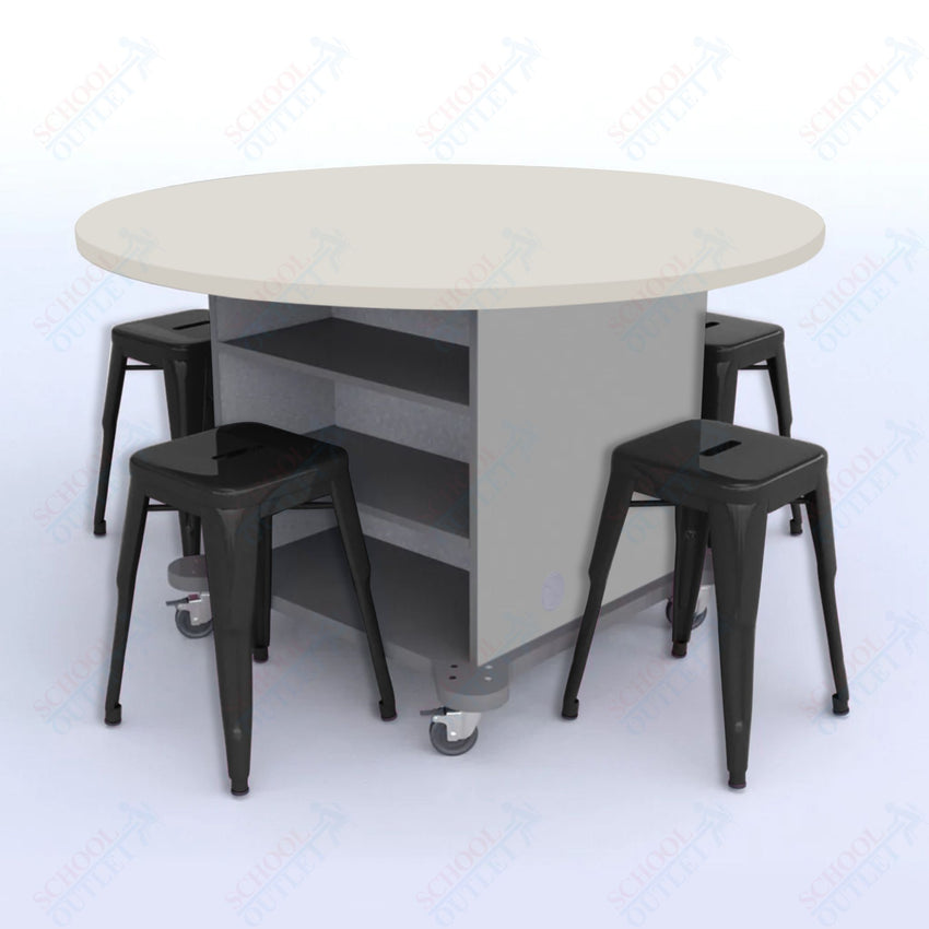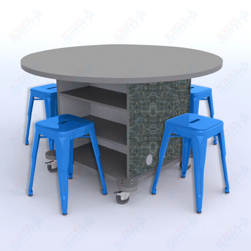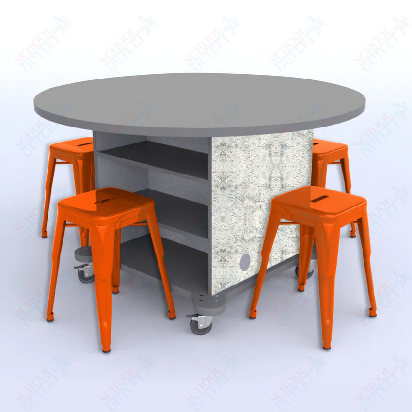 CEF Creation Cube Double-Sided Storage Table - 30"H, High-Pressure Laminate Base and Round Top - 4 Metal Stools Included