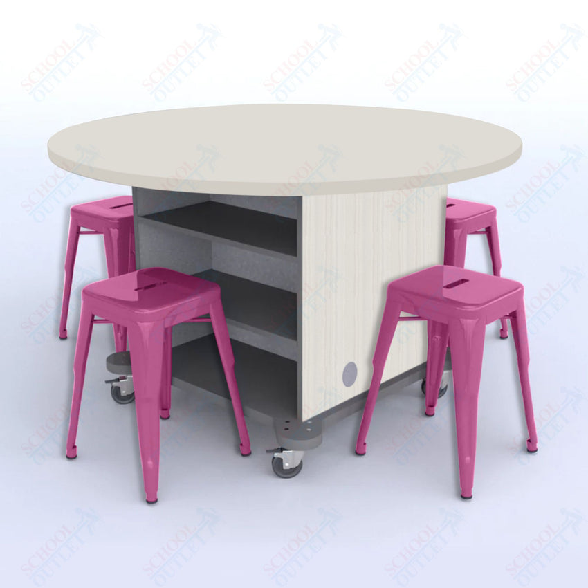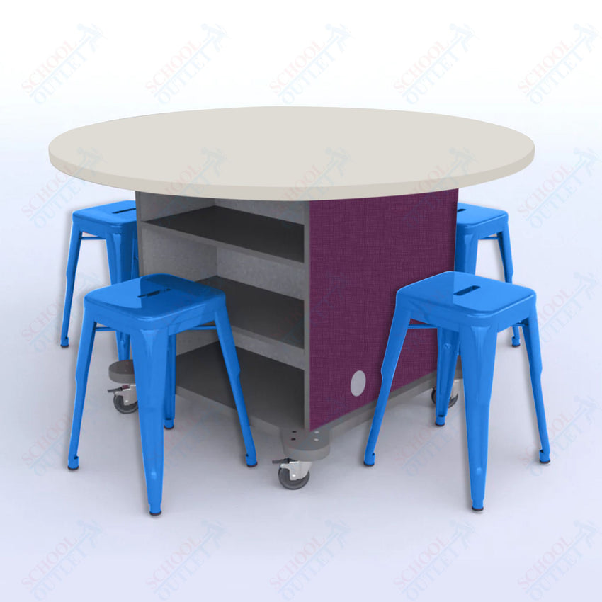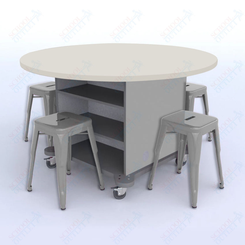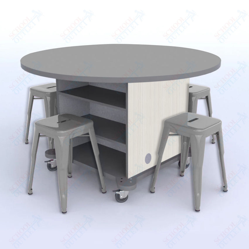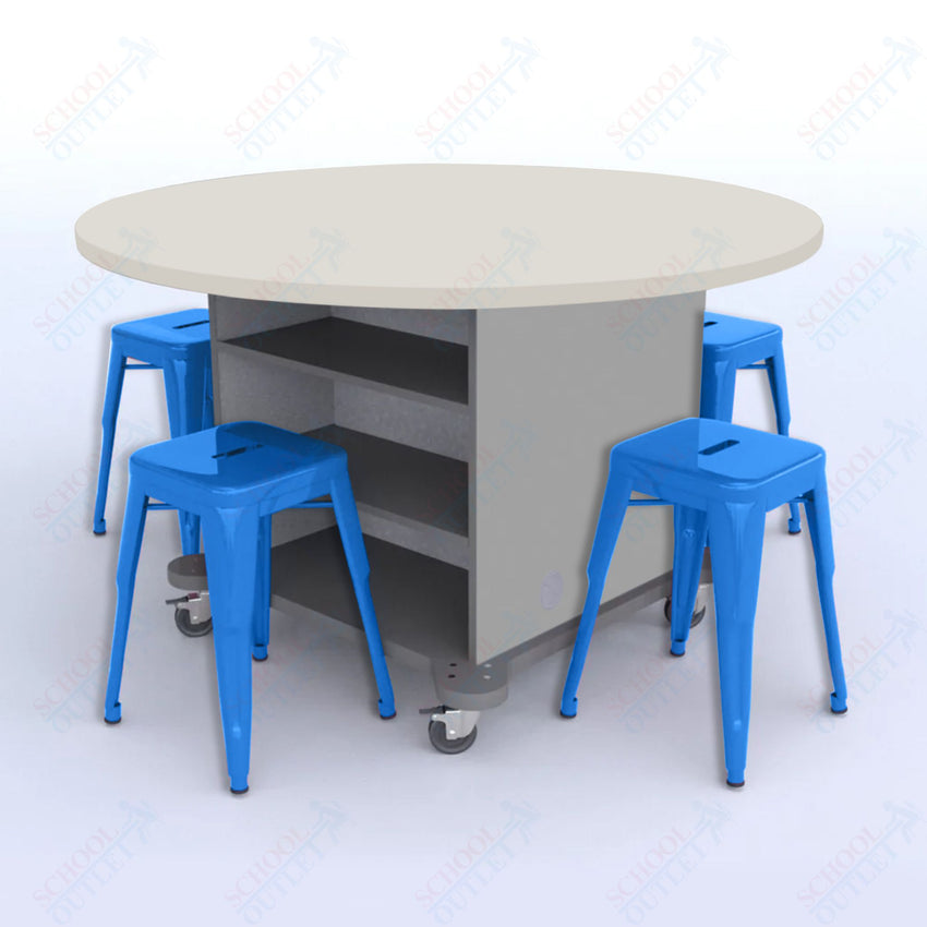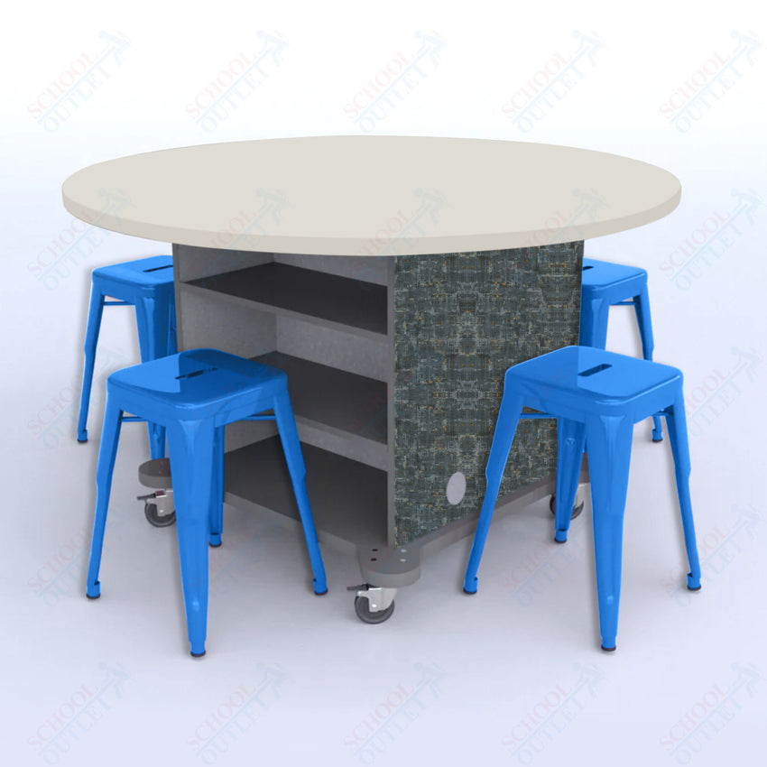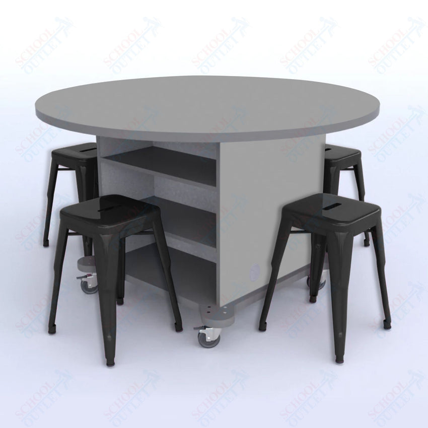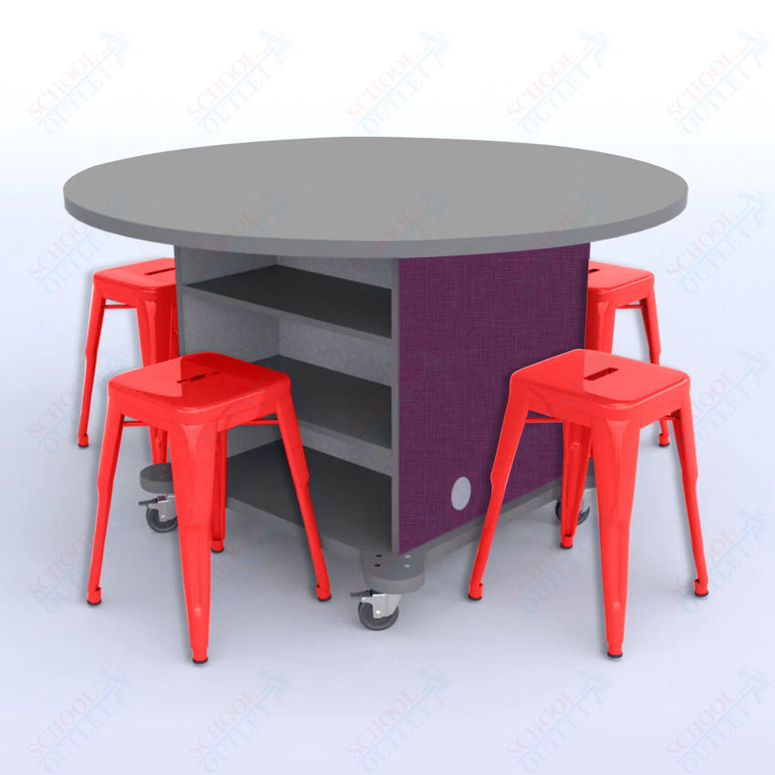 CEF Creation Cube Double-Sided Storage Table - 30"H, High-Pressure Laminate Base and Round Top - 4 Metal Stools Included