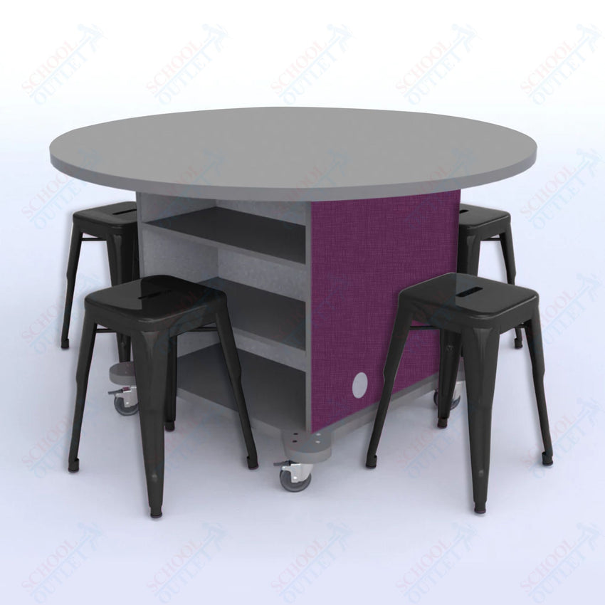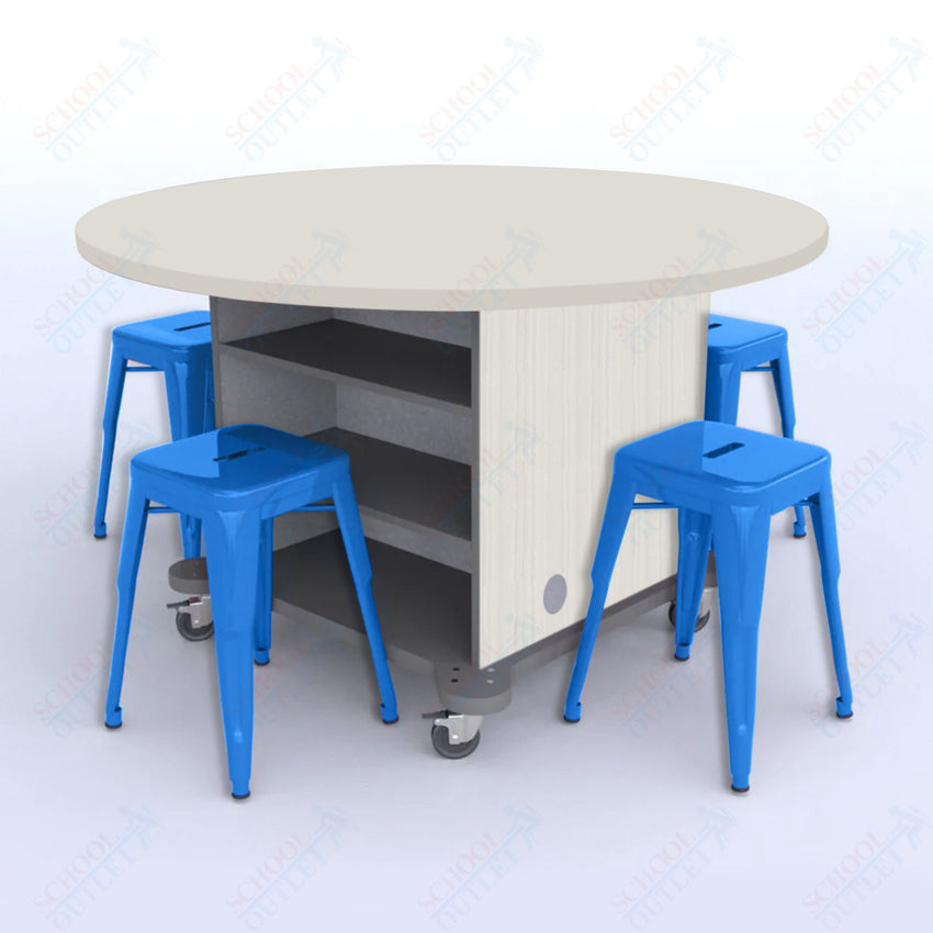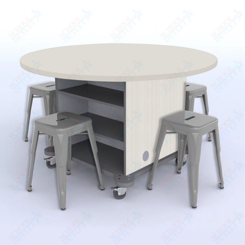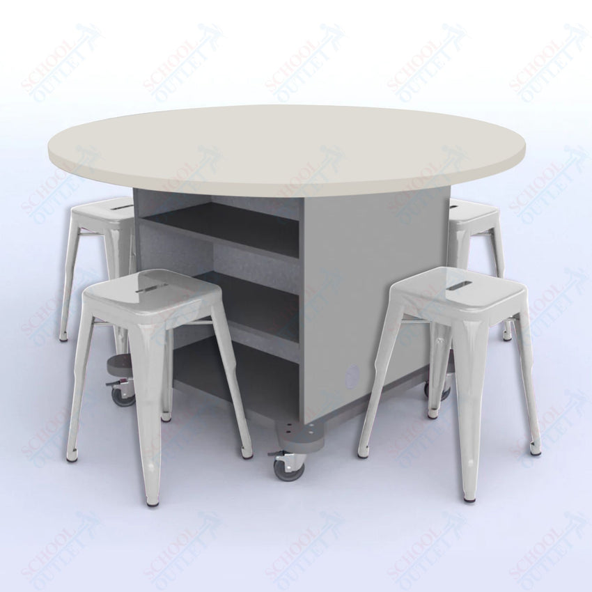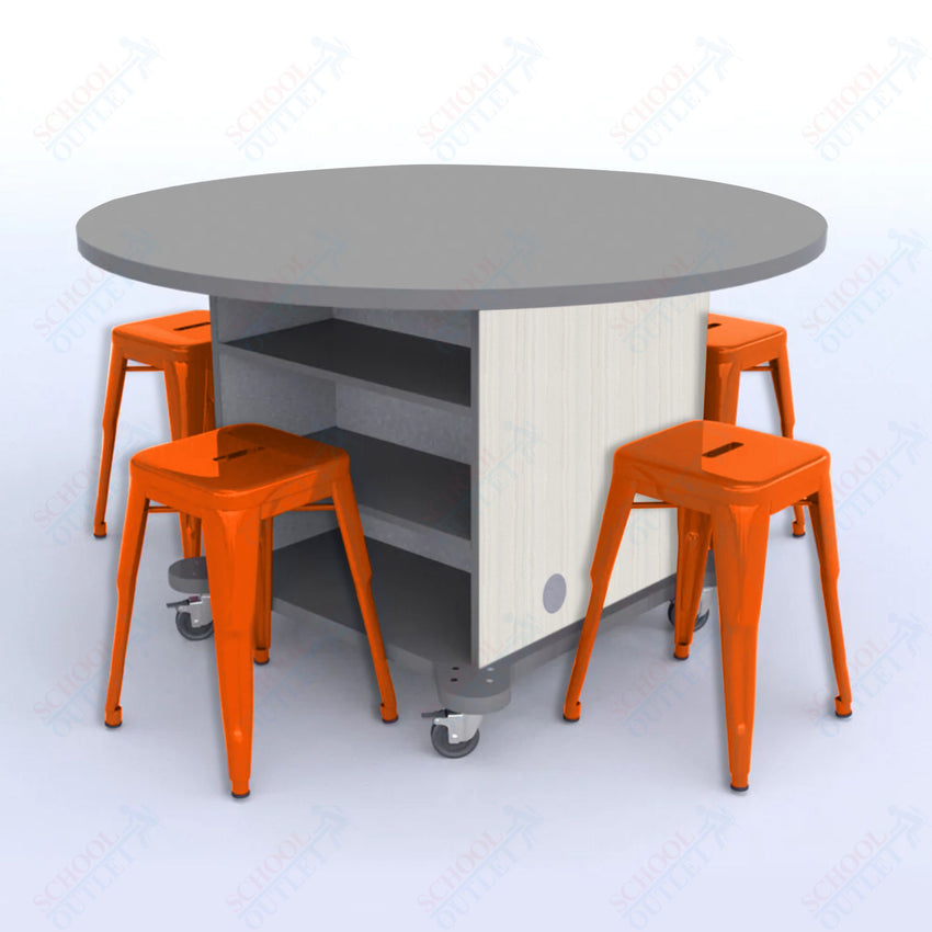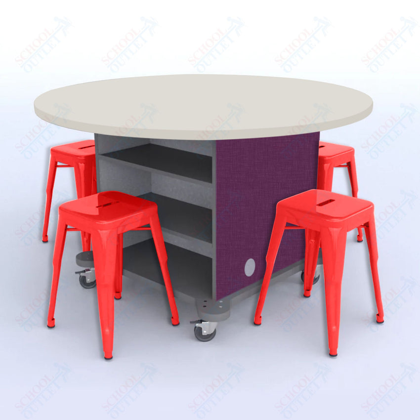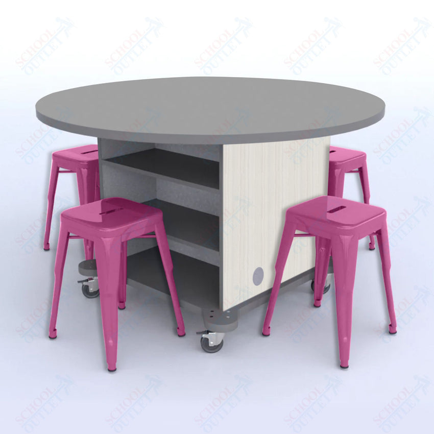 CEF Creation Cube Double-Sided Storage Table - 30"H, High-Pressure Laminate Base and Round Top - 4 Metal Stools Included