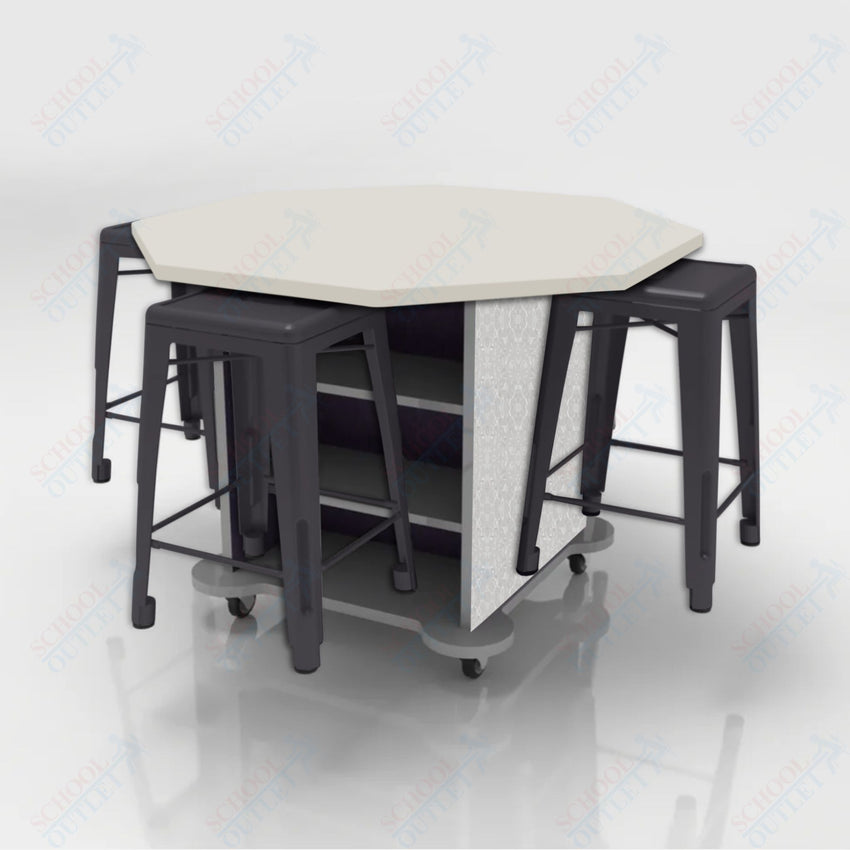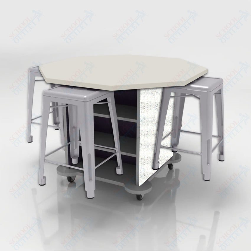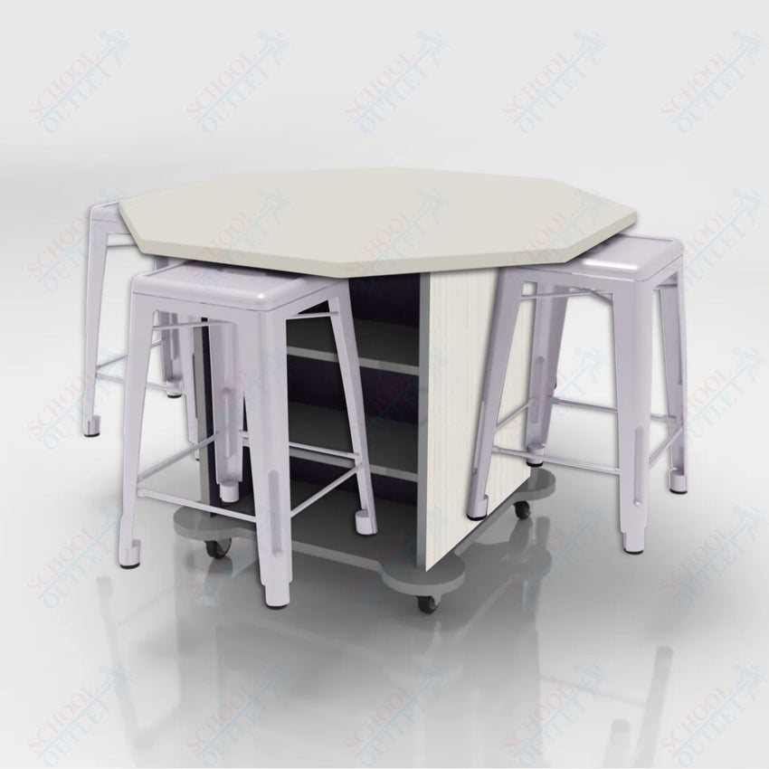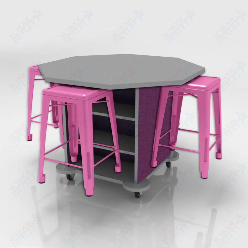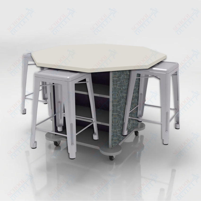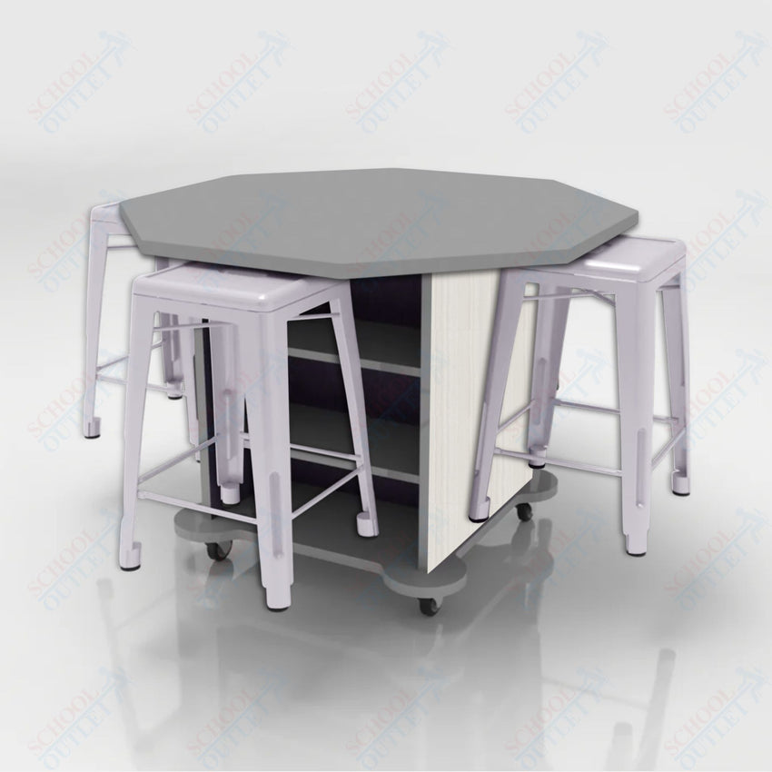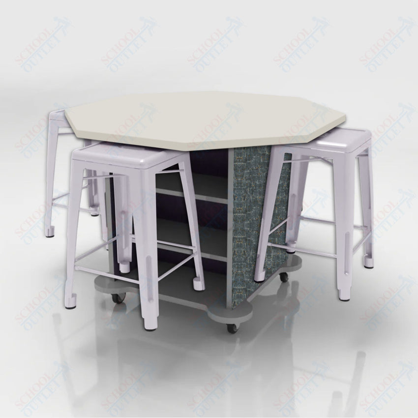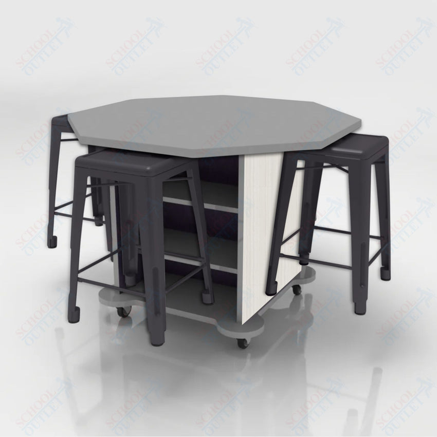 CEF Creation Cube Double-Sided Storage Table - 34"H, High-Pressure Laminate Base and Octagon Top - 4 Metal Stools Included