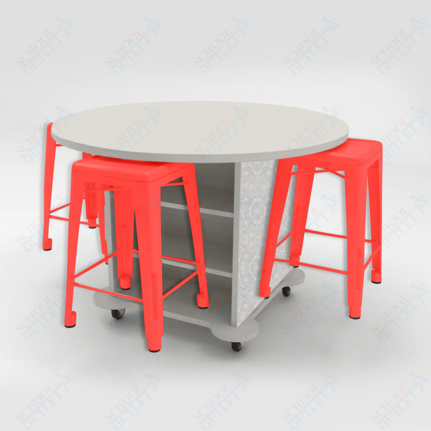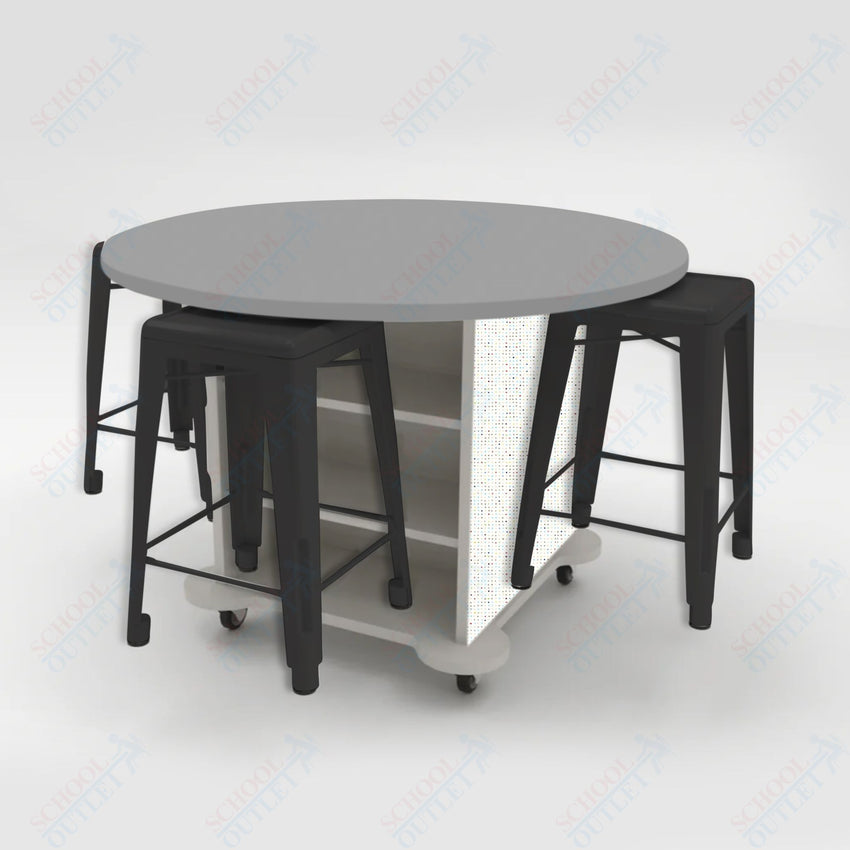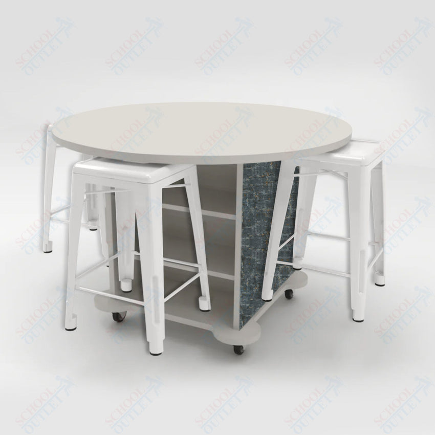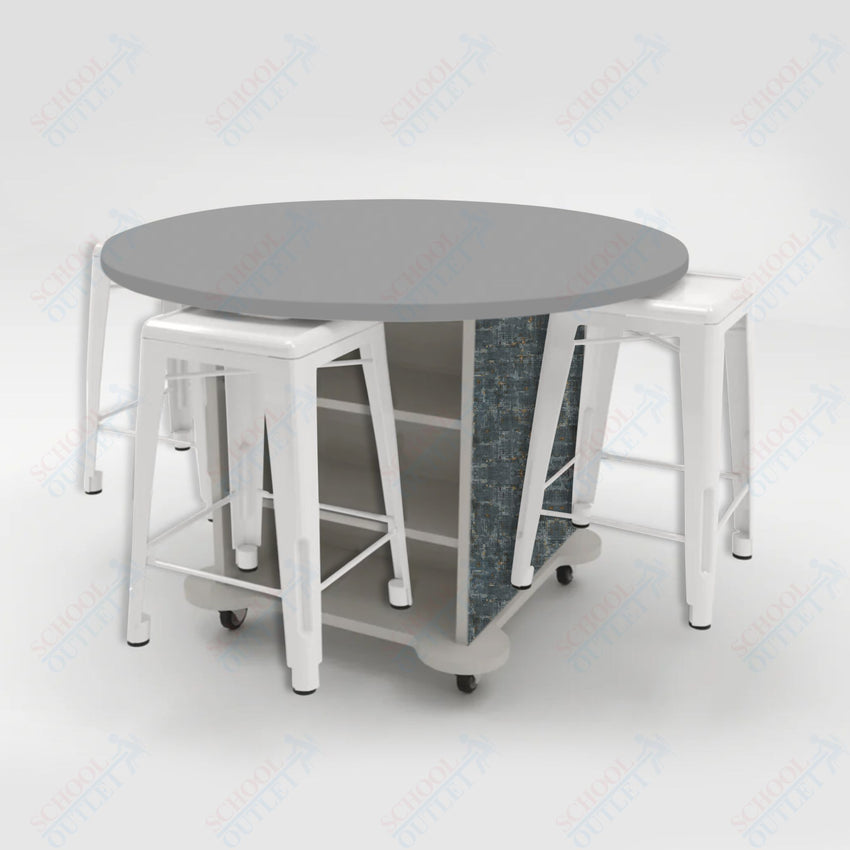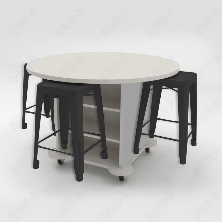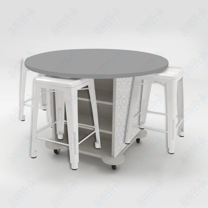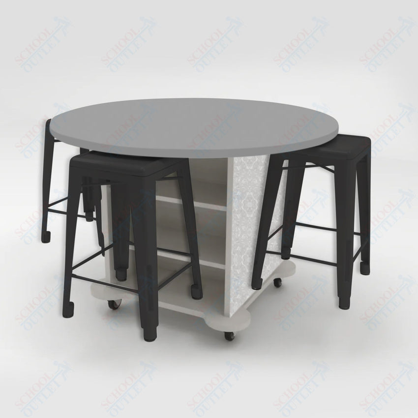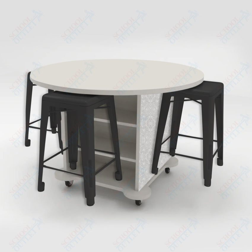 CEF Creation Cube Double-Sided Storage Table - 34"H, High-Pressure Laminate Base and Round Top - 4 Metal Stools Included