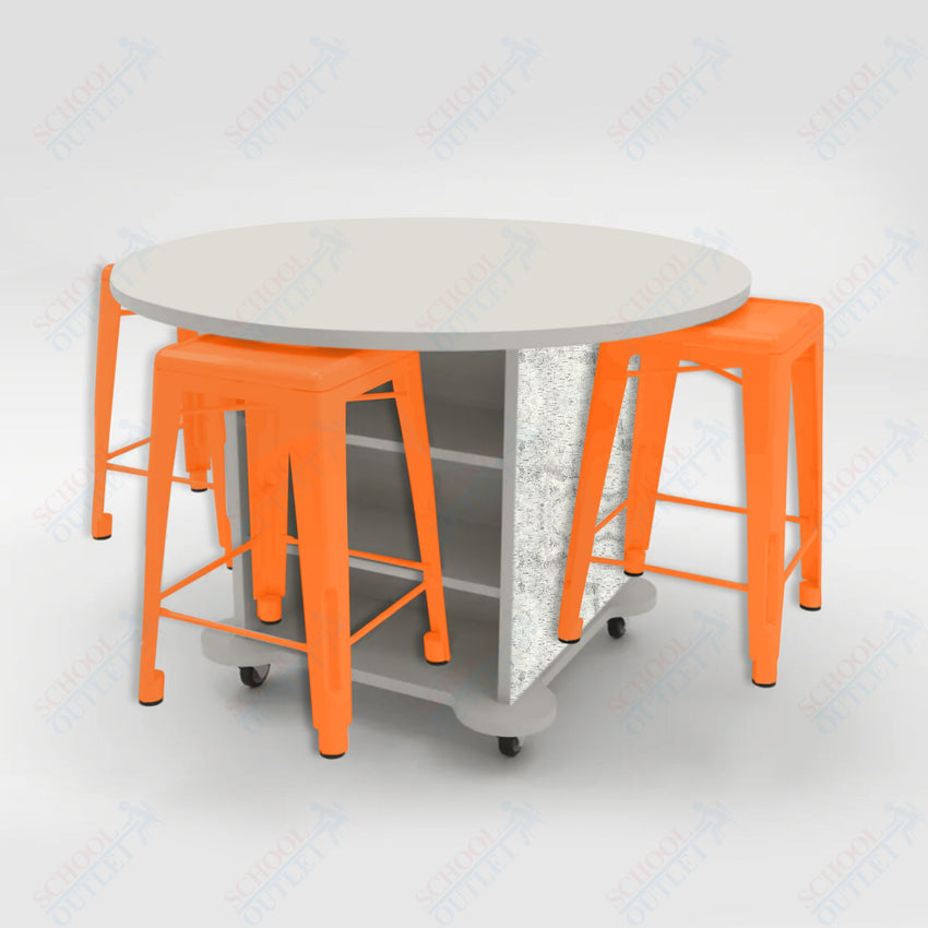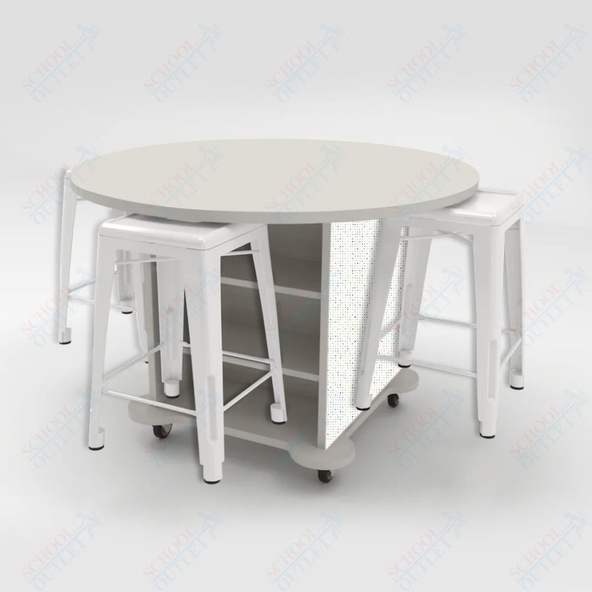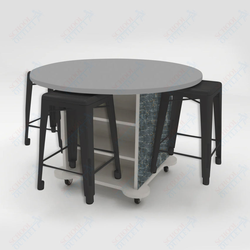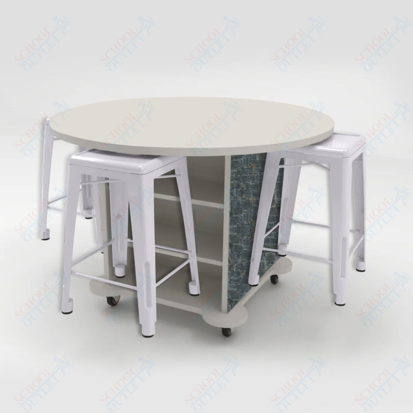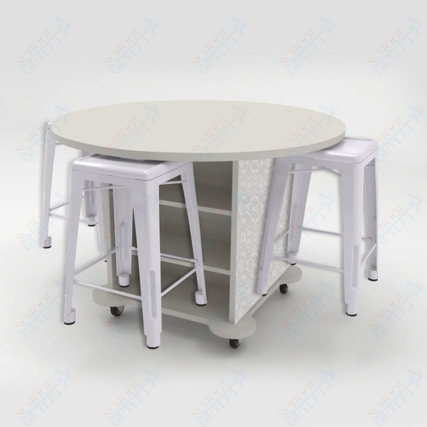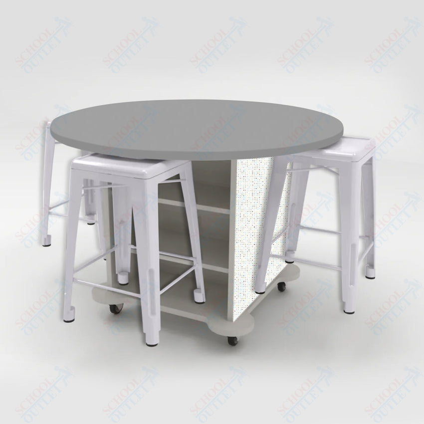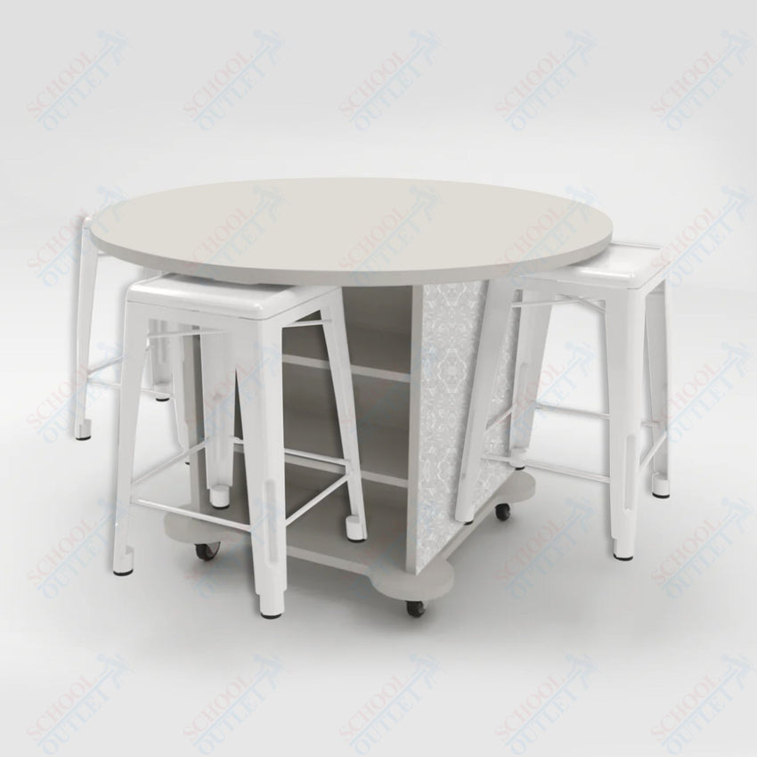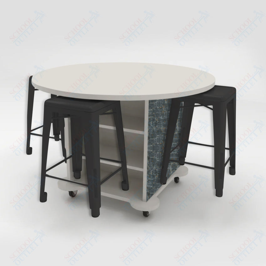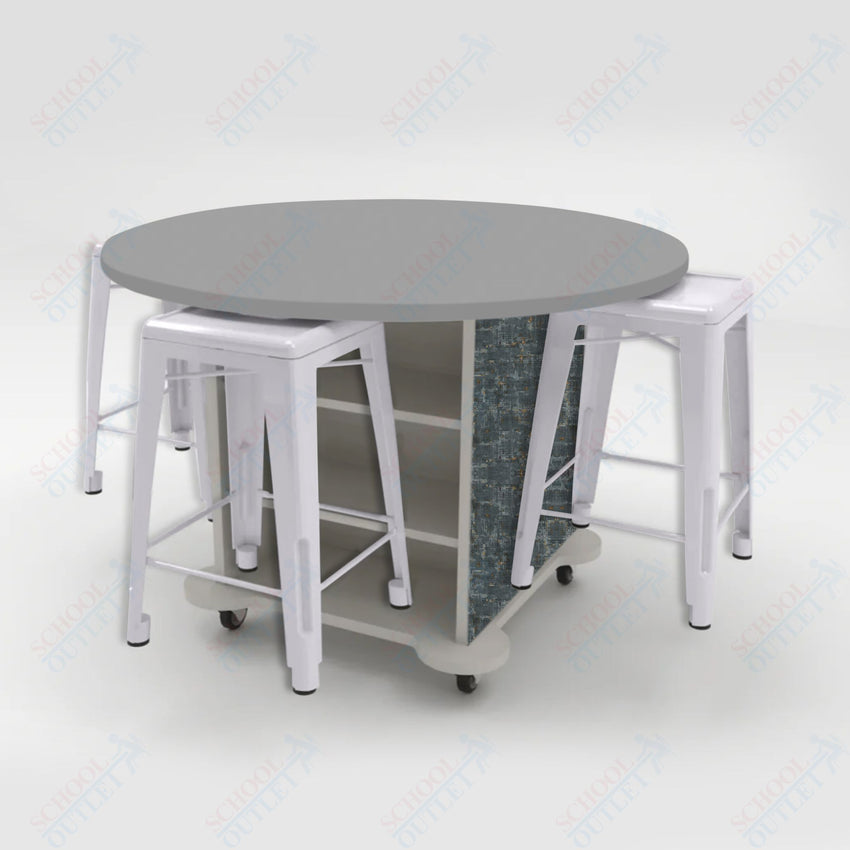CEF Creation Cube Double-Sided Storage Table - 34"H, High-Pressure Laminate Base and Round Top - 4 Metal Stools Included