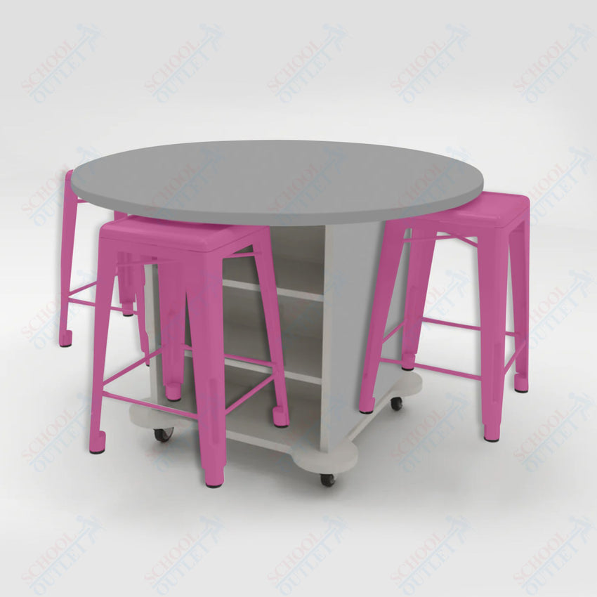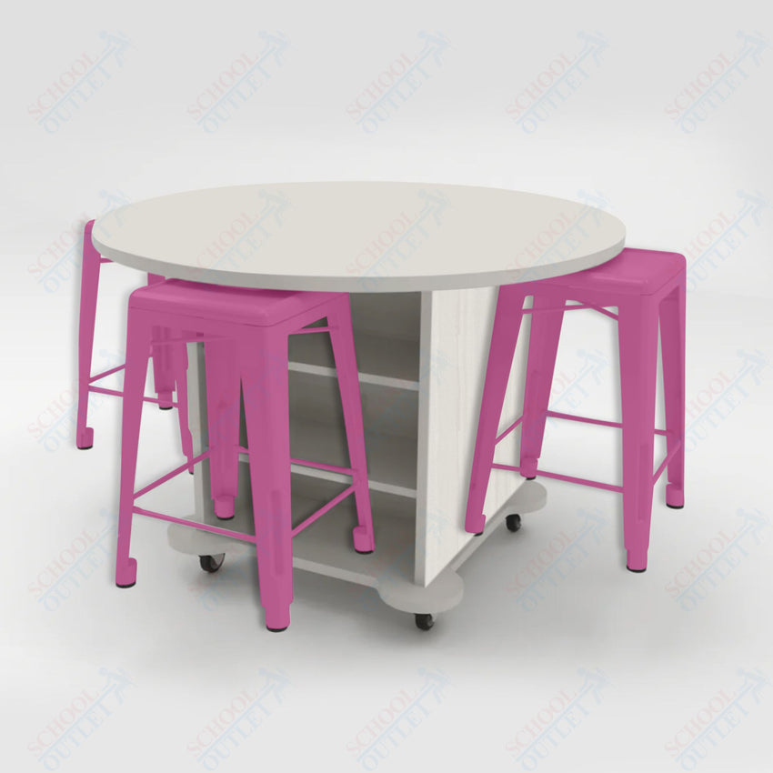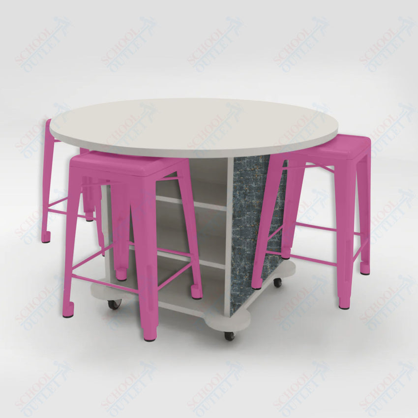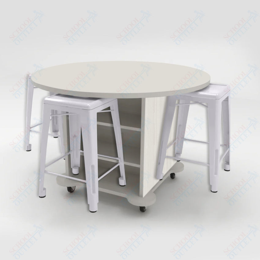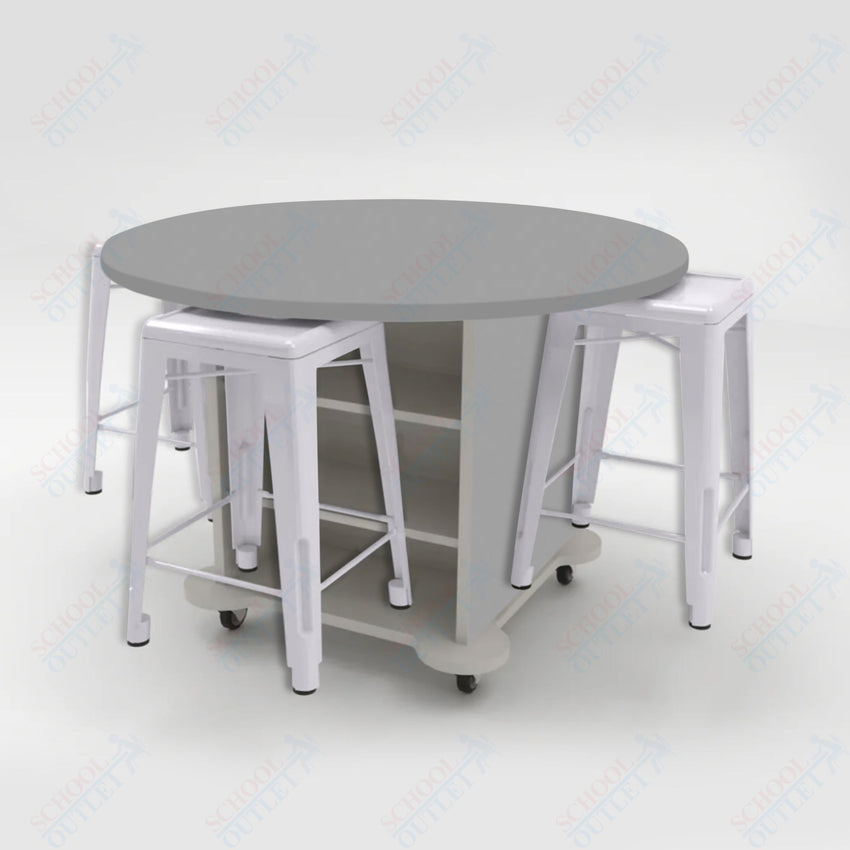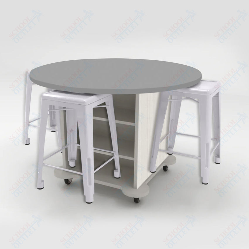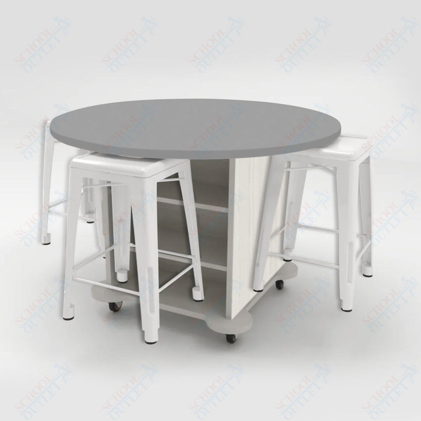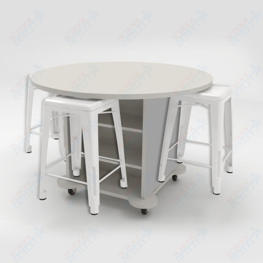 CEF Creation Cube Double-Sided Storage Table - 34"H, High-Pressure Laminate Base and Round Top - 4 Metal Stools Included