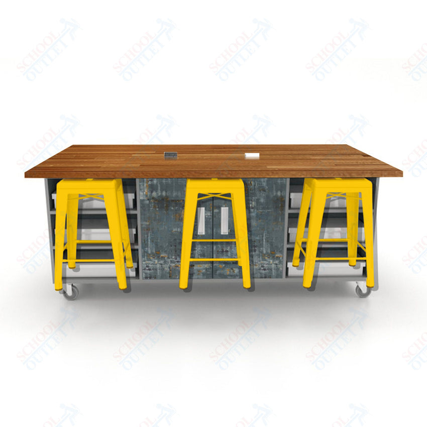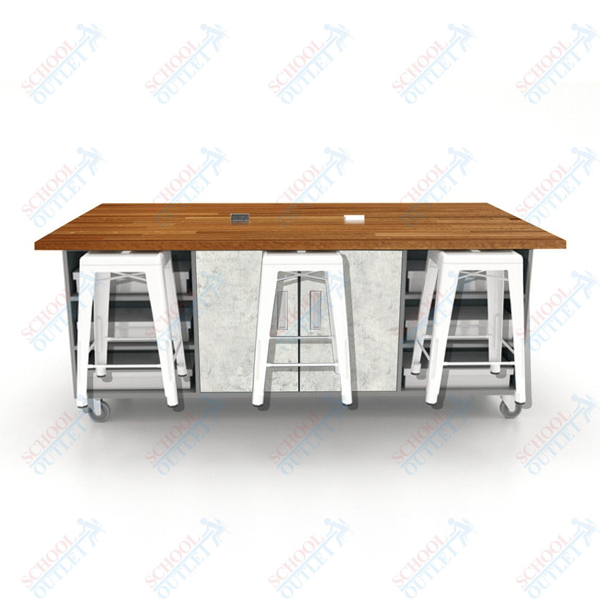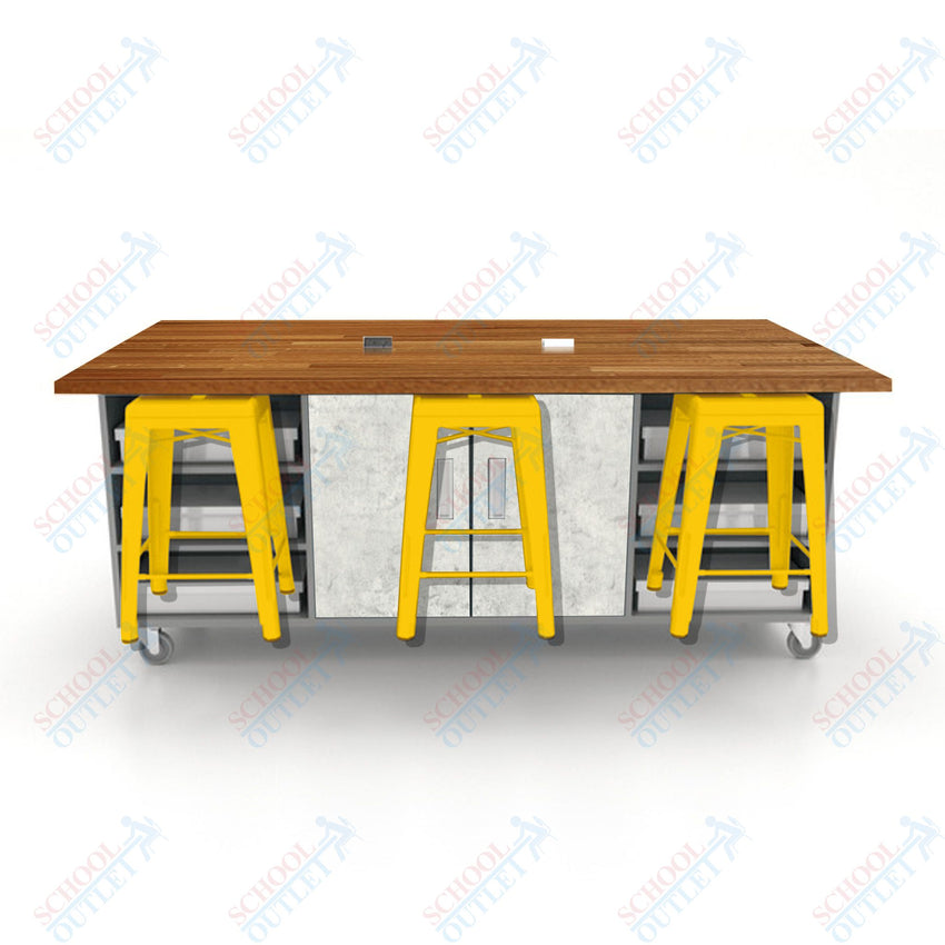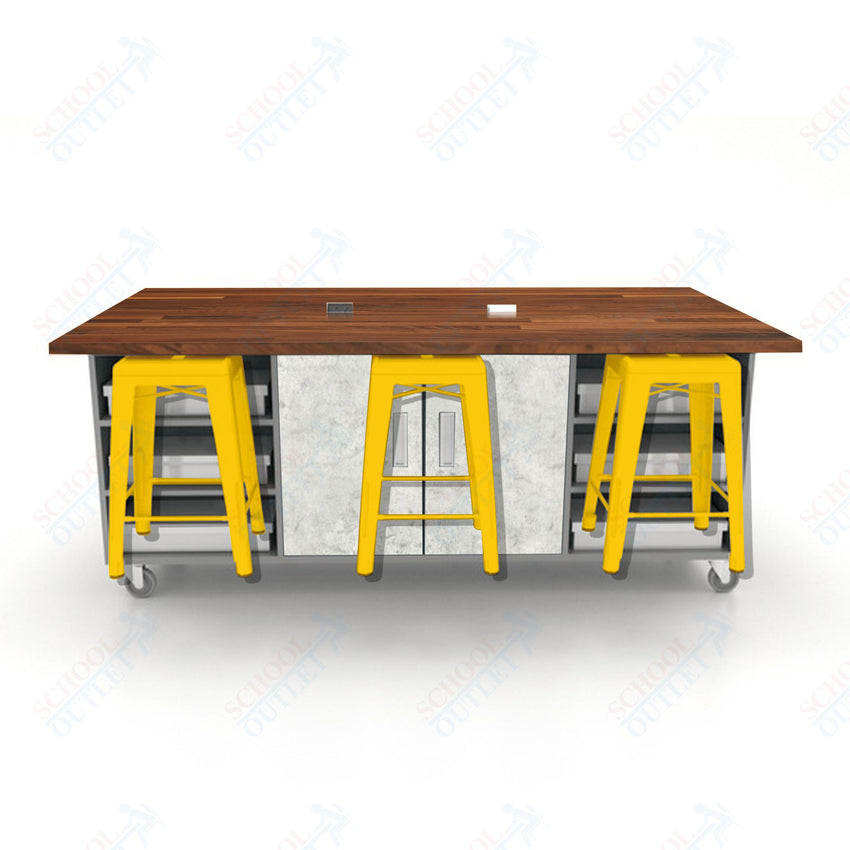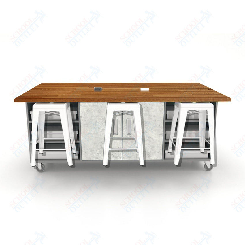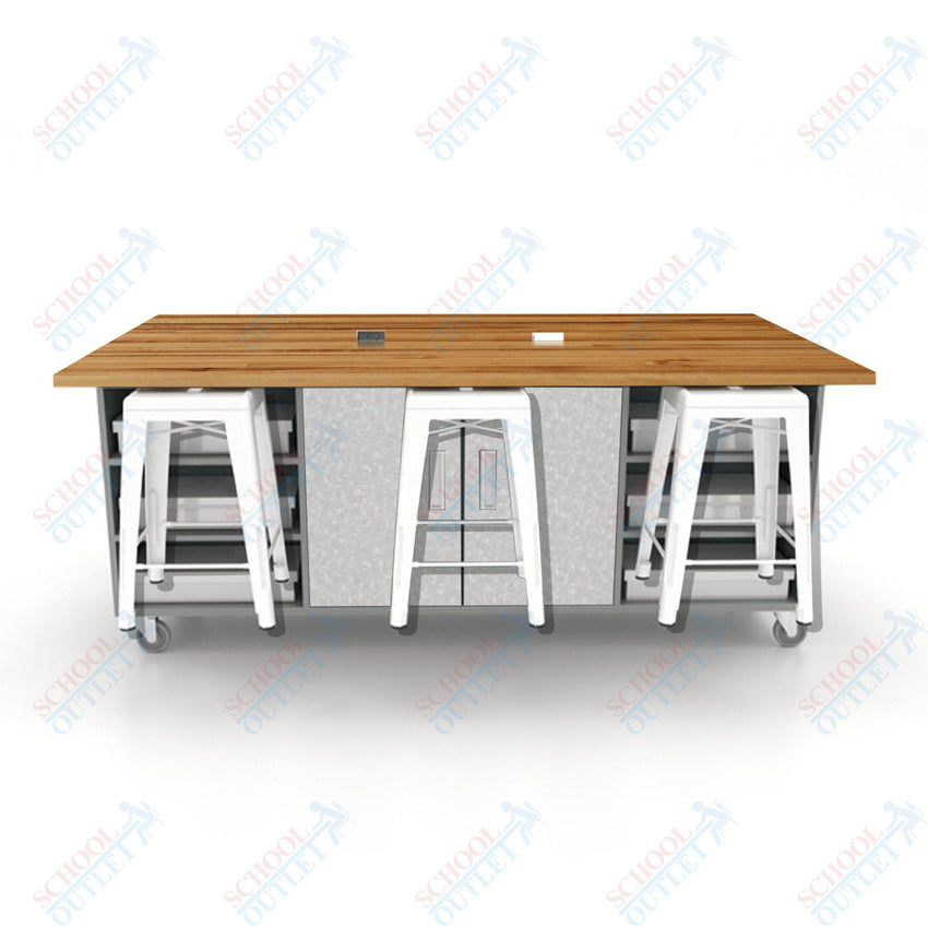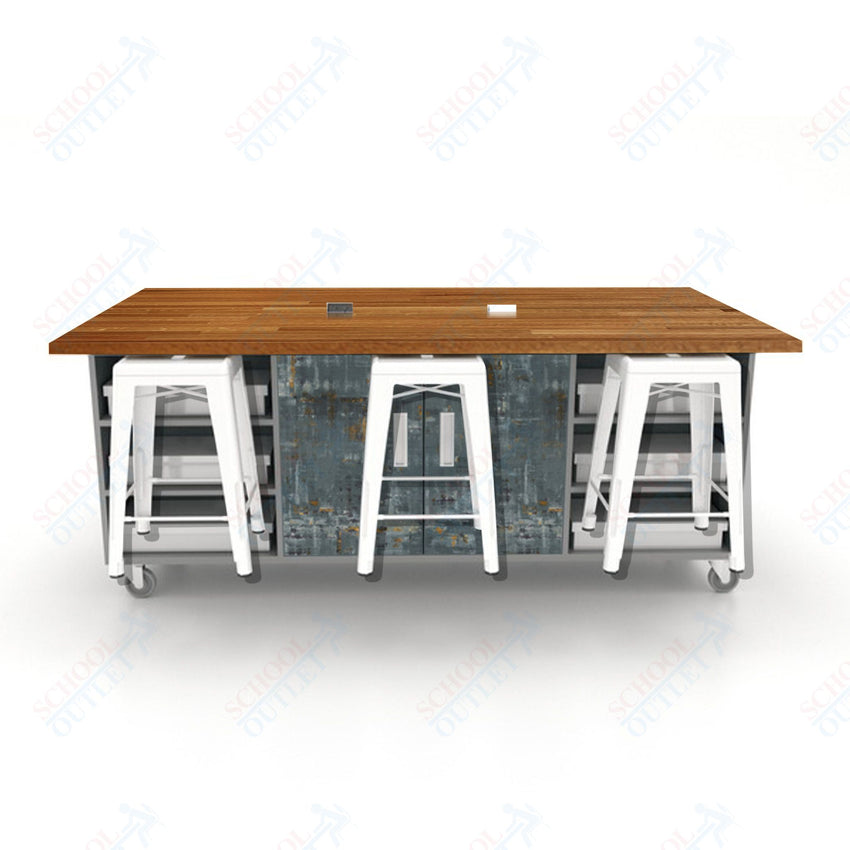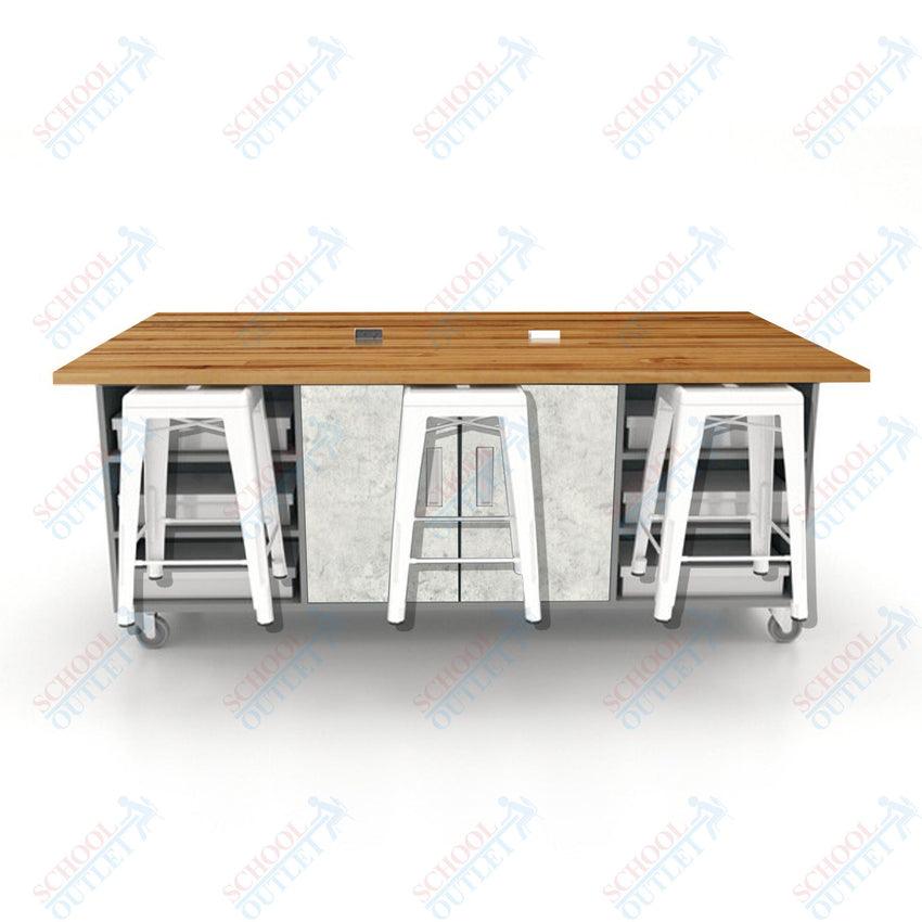 CEF ED Double Table 36"H Butcher Block Top, Laminate Base with 6 Stools, Storage bins, and Electrical Outlets Included.