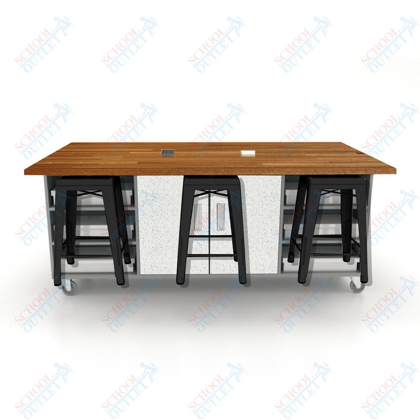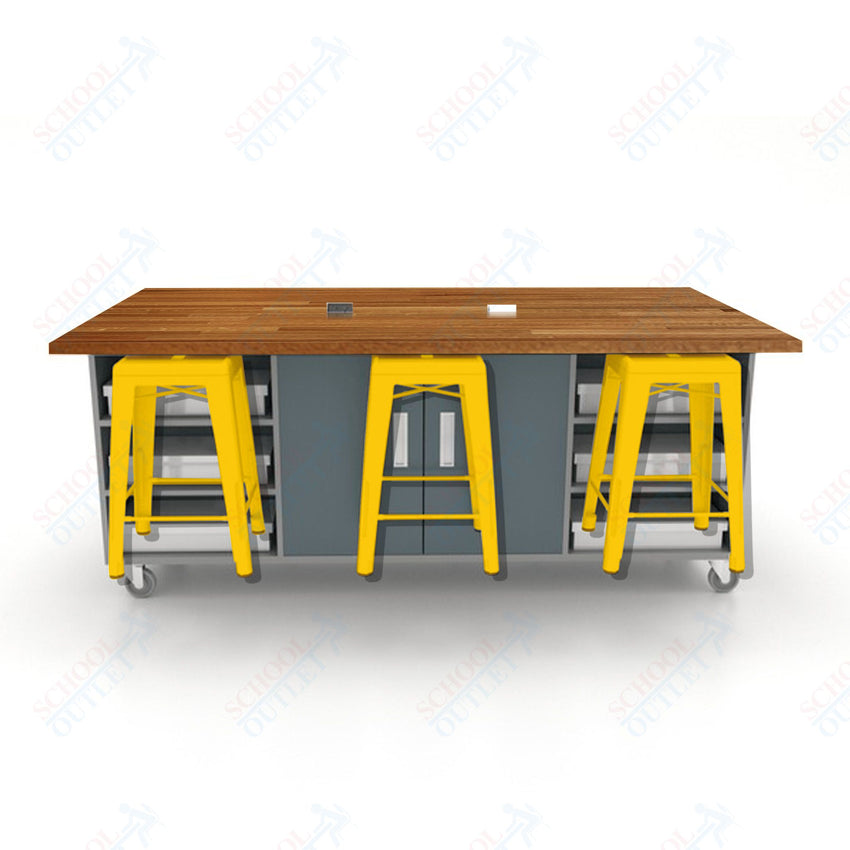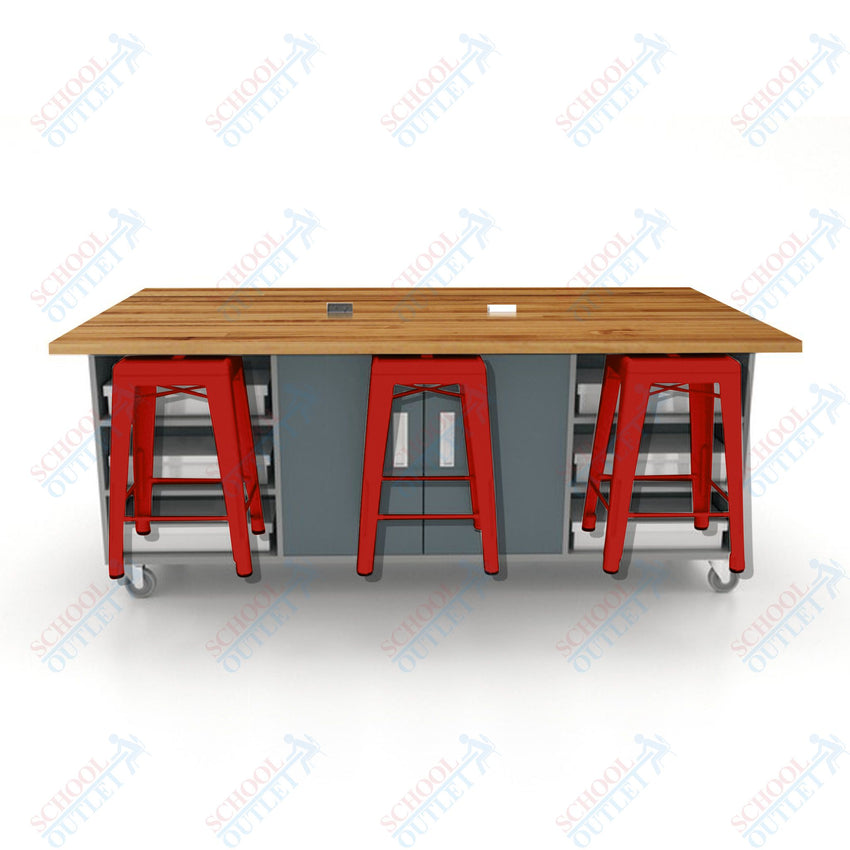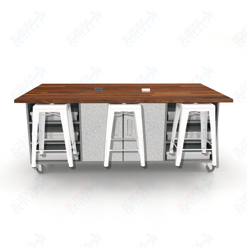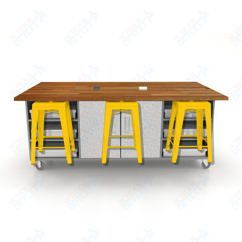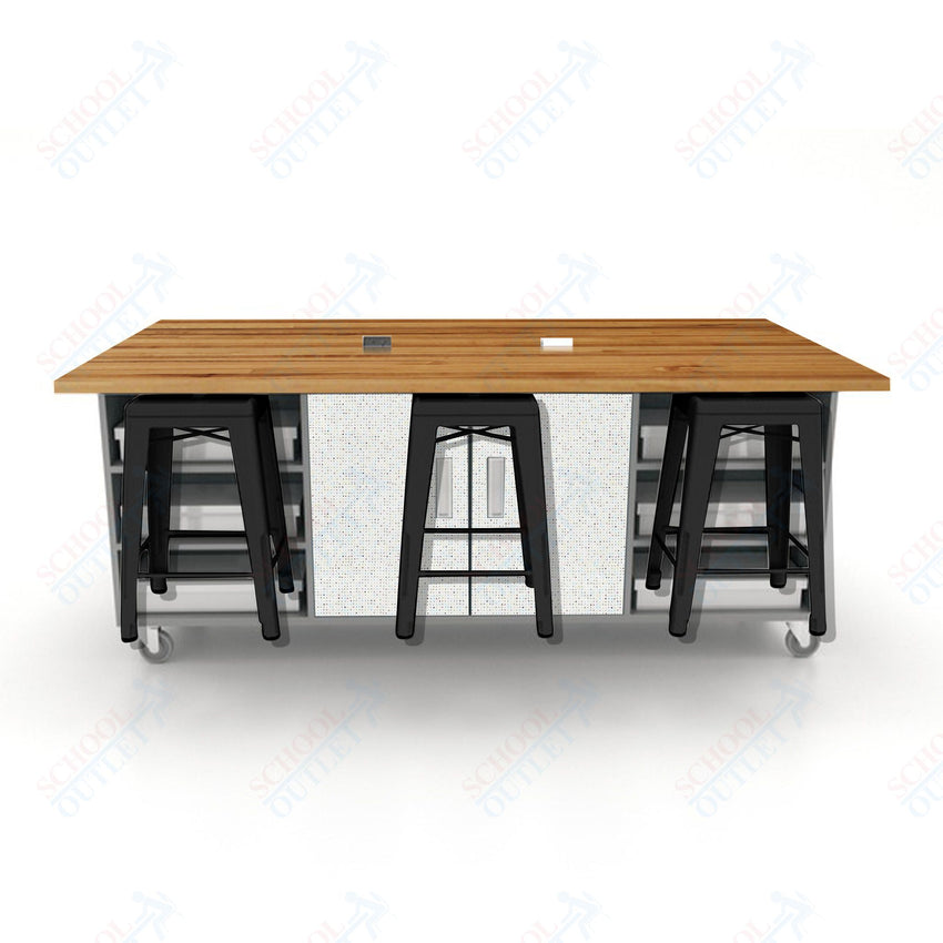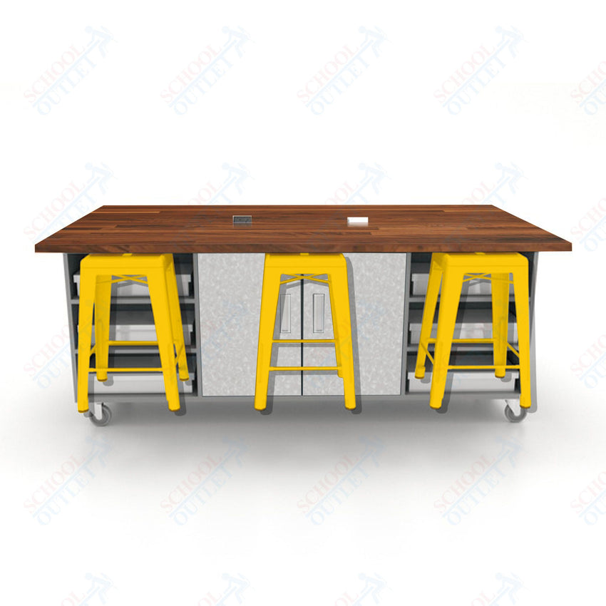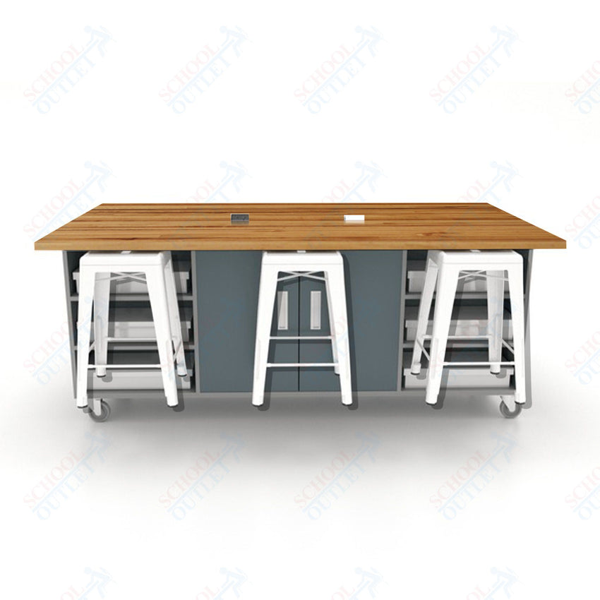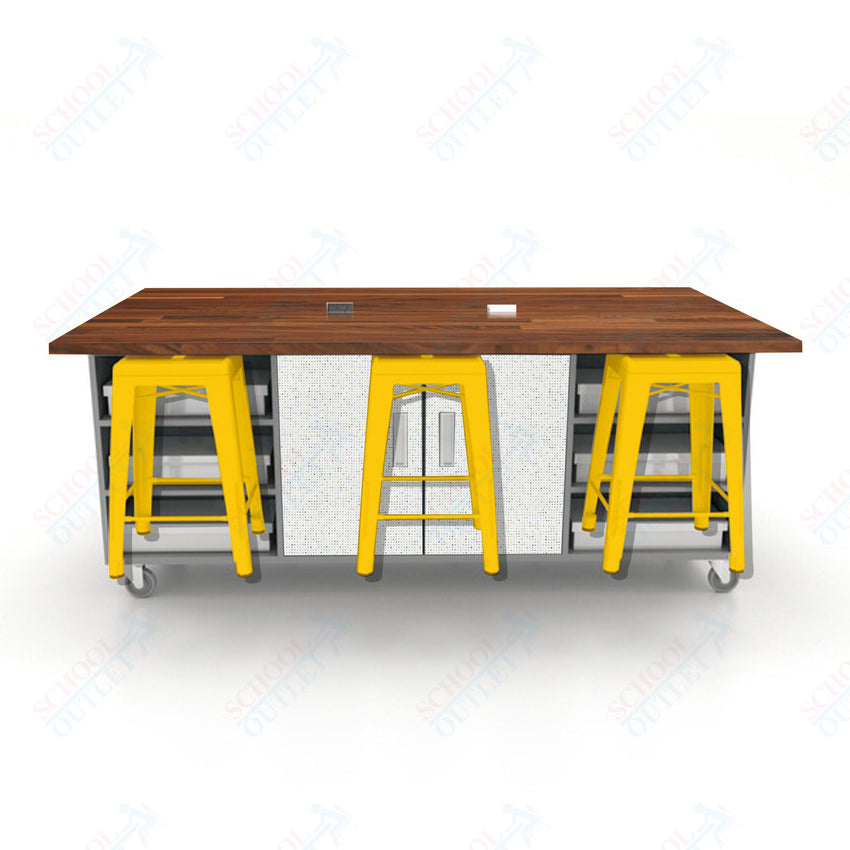 CEF ED Double Table 36"H Butcher Block Top, Laminate Base with 6 Stools, Storage bins, and Electrical Outlets Included.