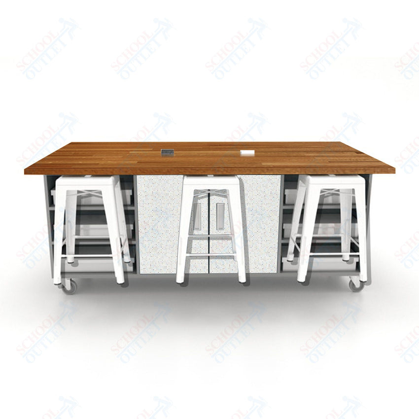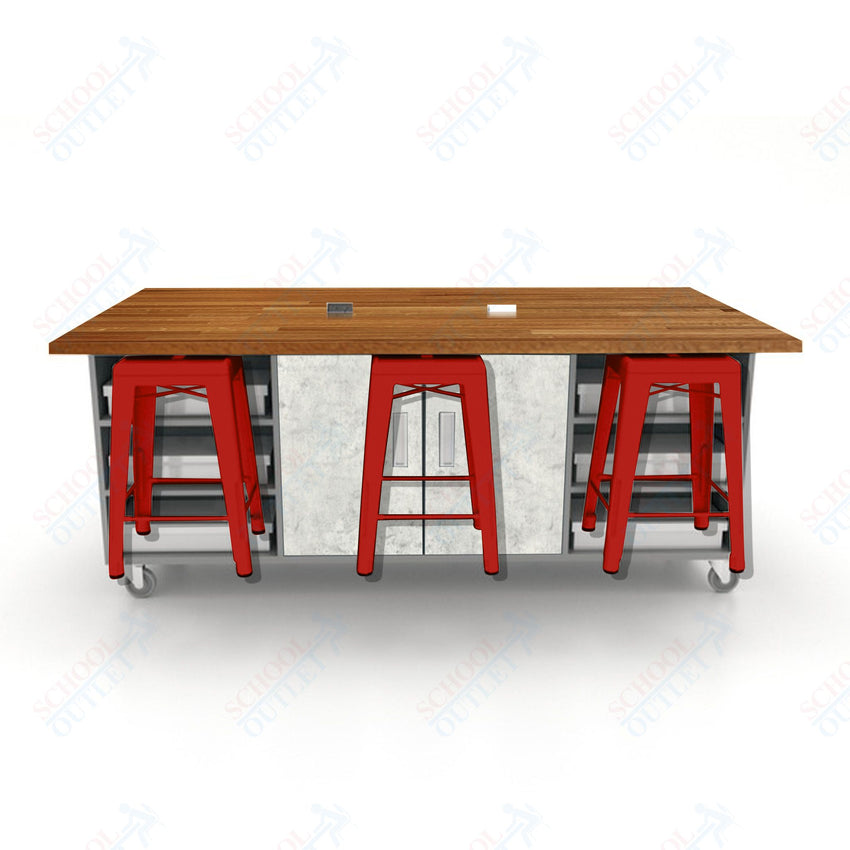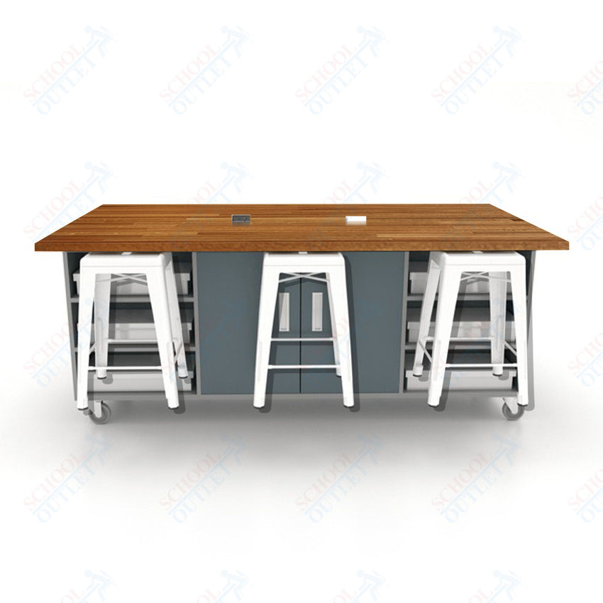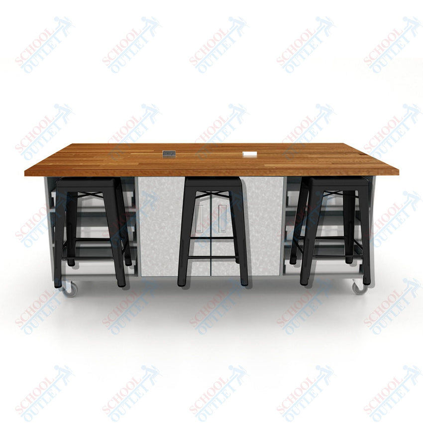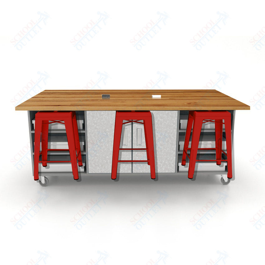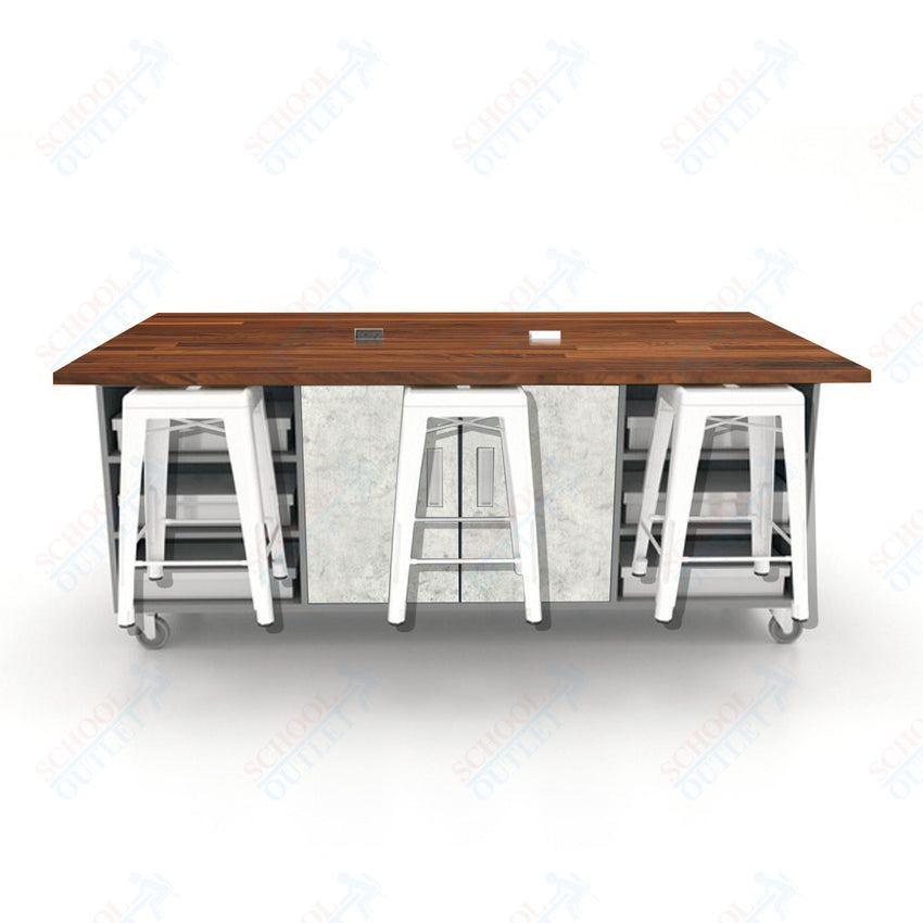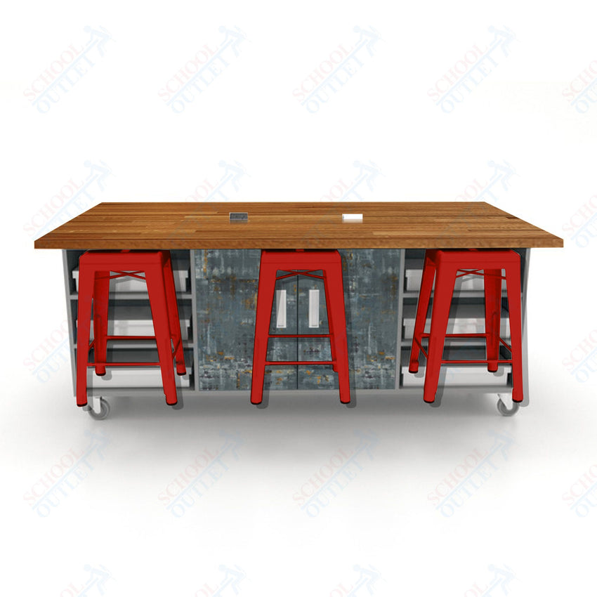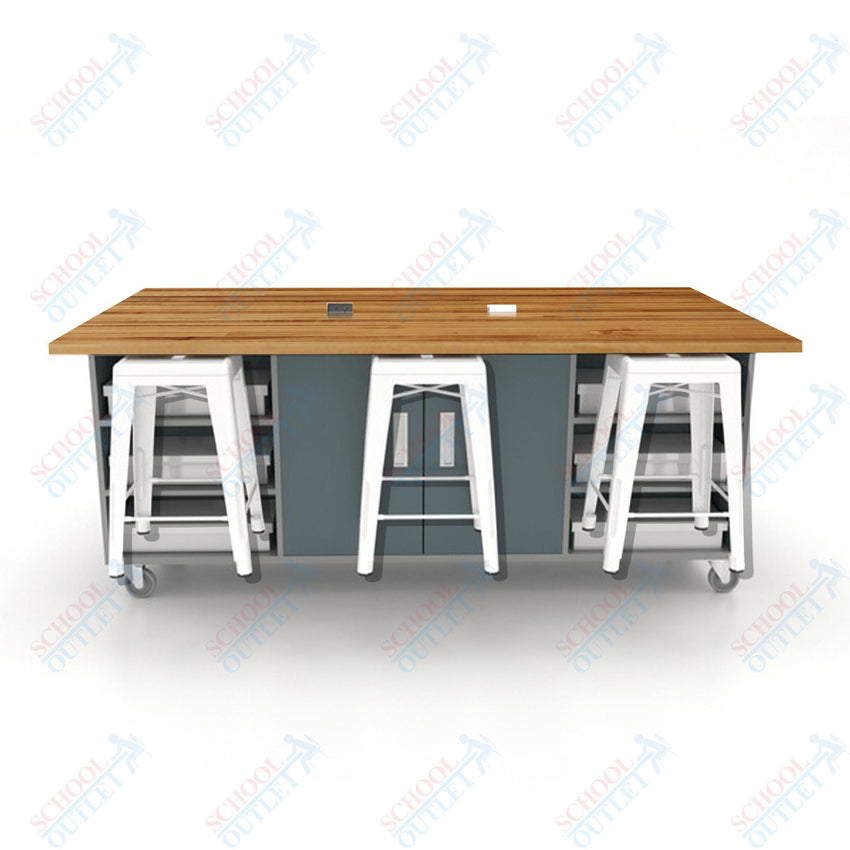 CEF ED Double Table 36"H Butcher Block Top, Laminate Base with 6 Stools, Storage bins, and Electrical Outlets Included.