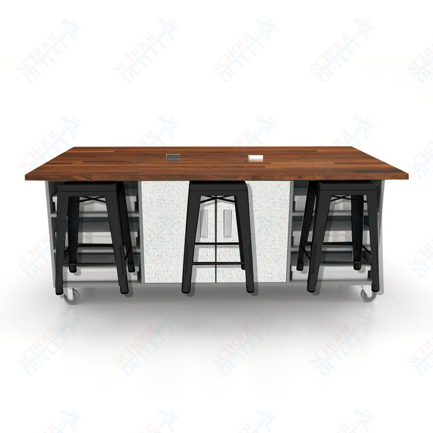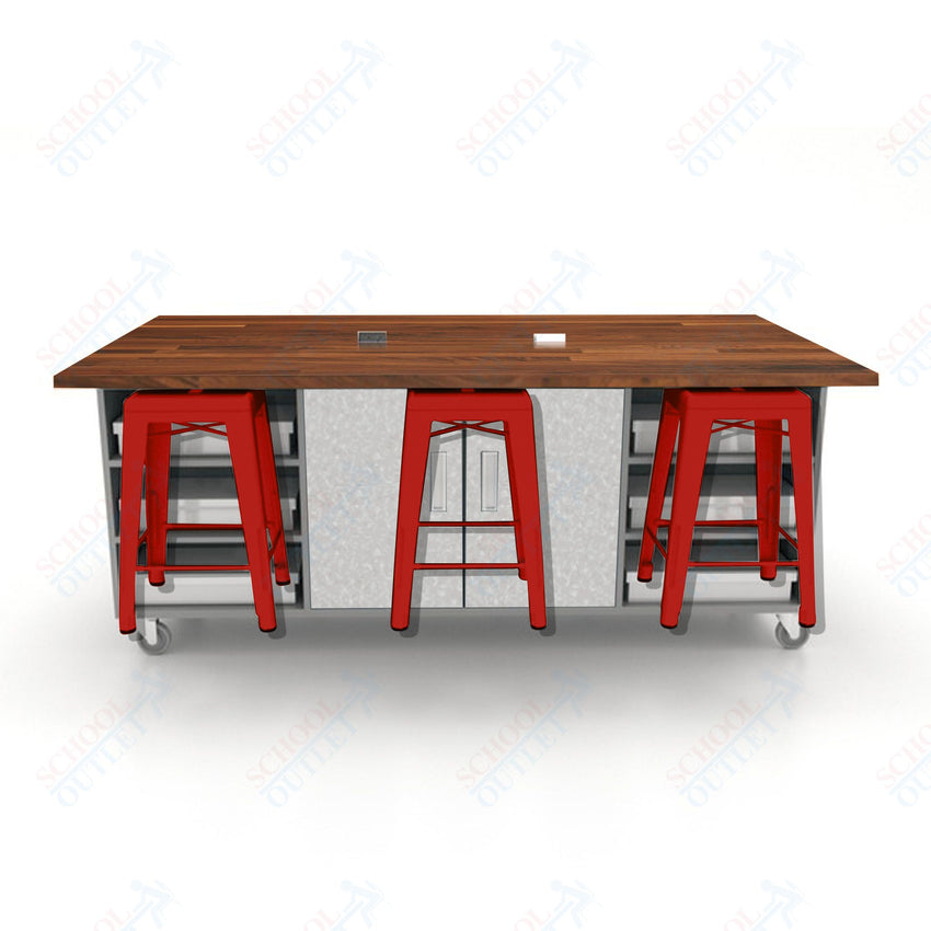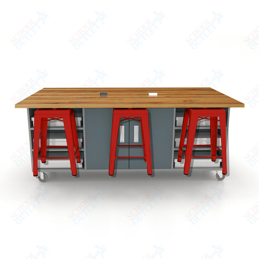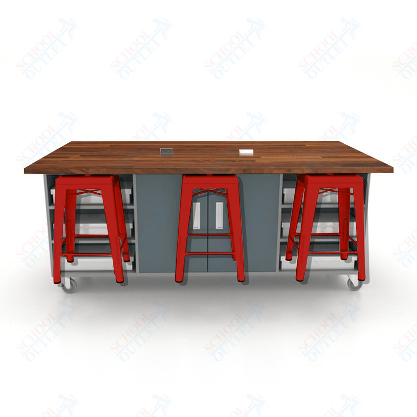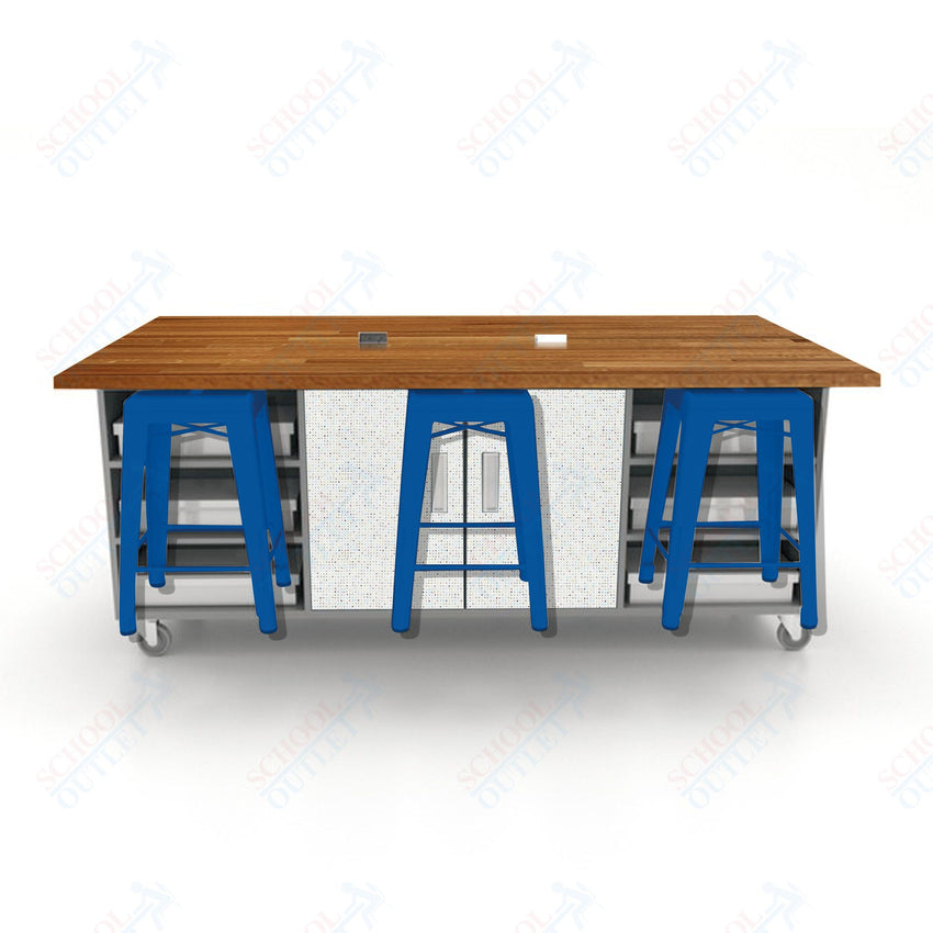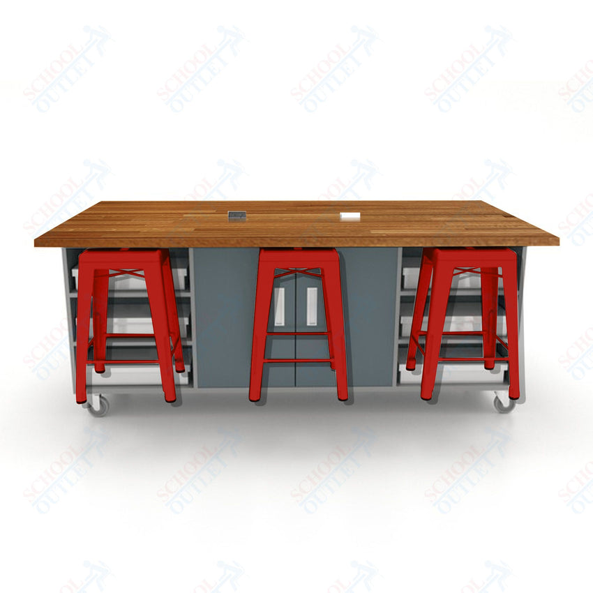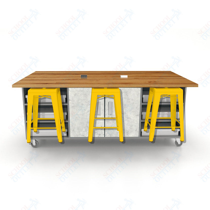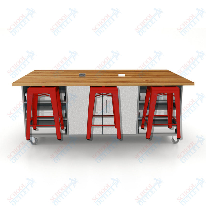 CEF ED Double Table 36"H Butcher Block Top, Laminate Base with 6 Stools, Storage bins, and Electrical Outlets Included.