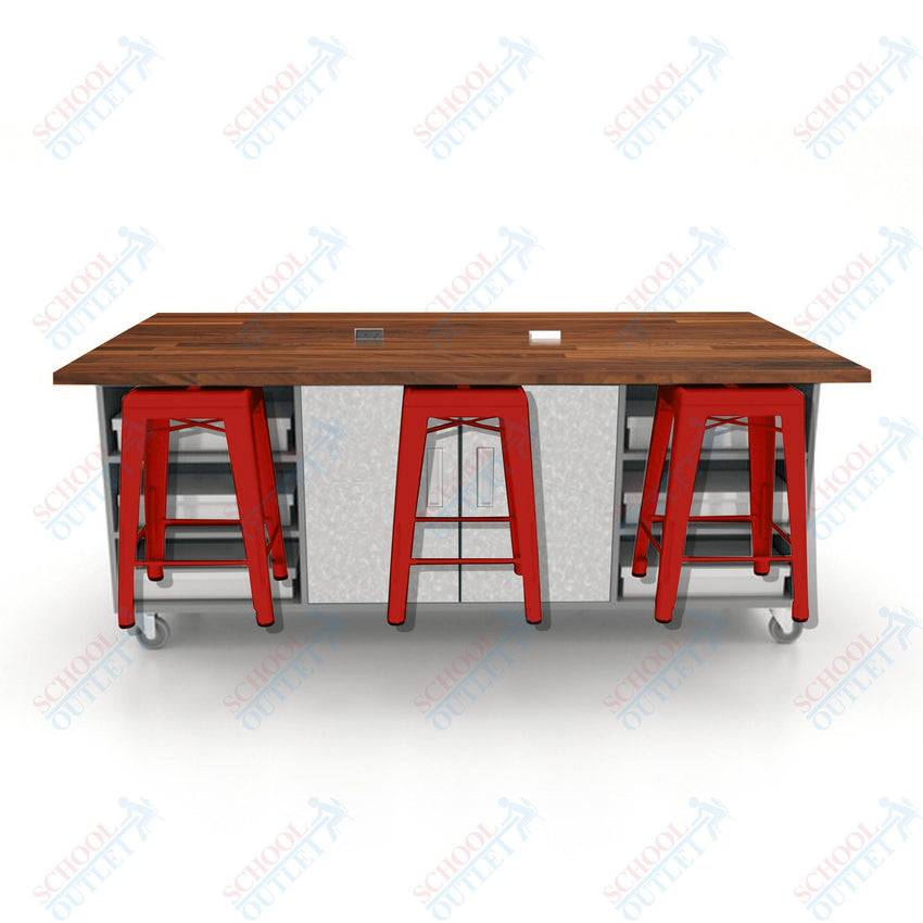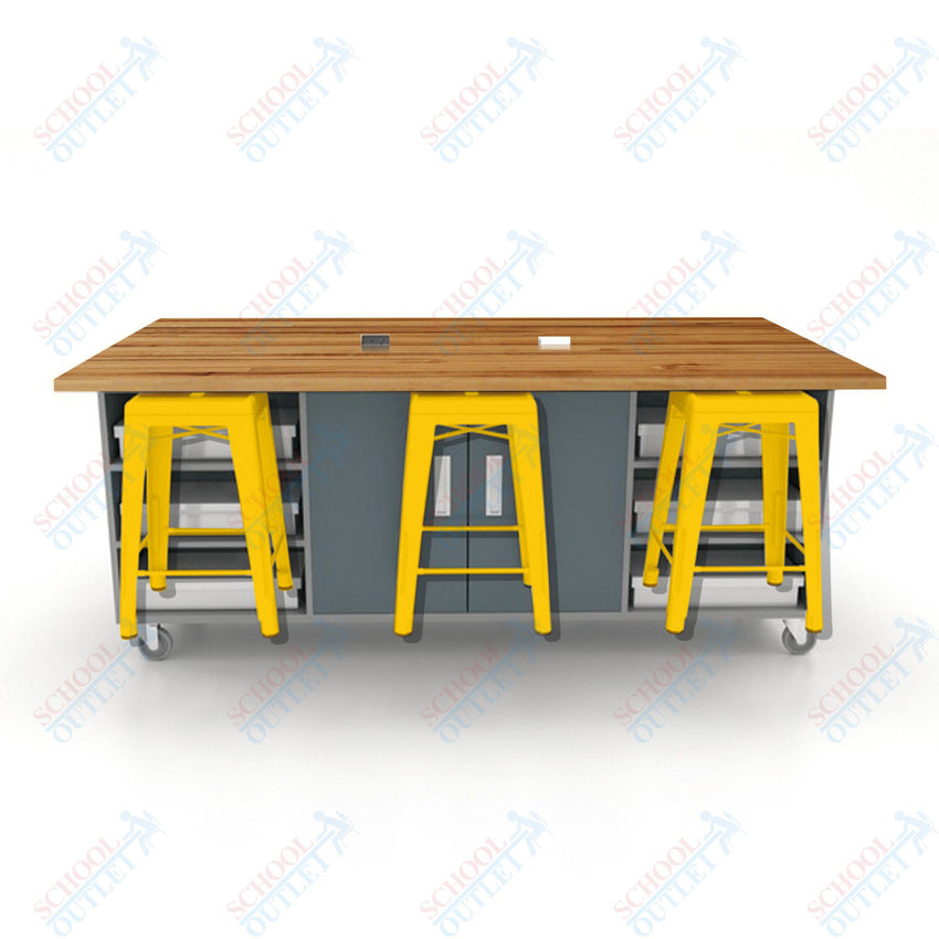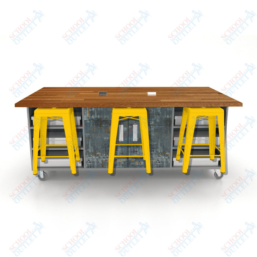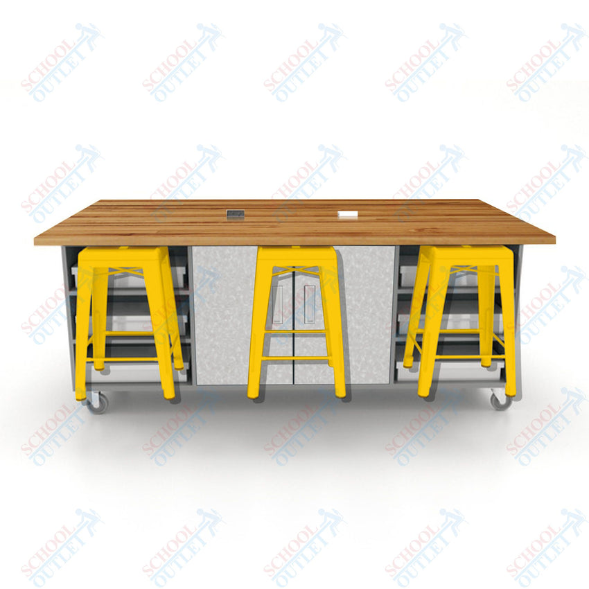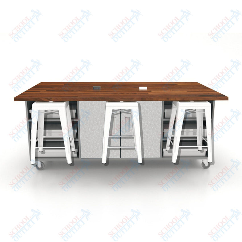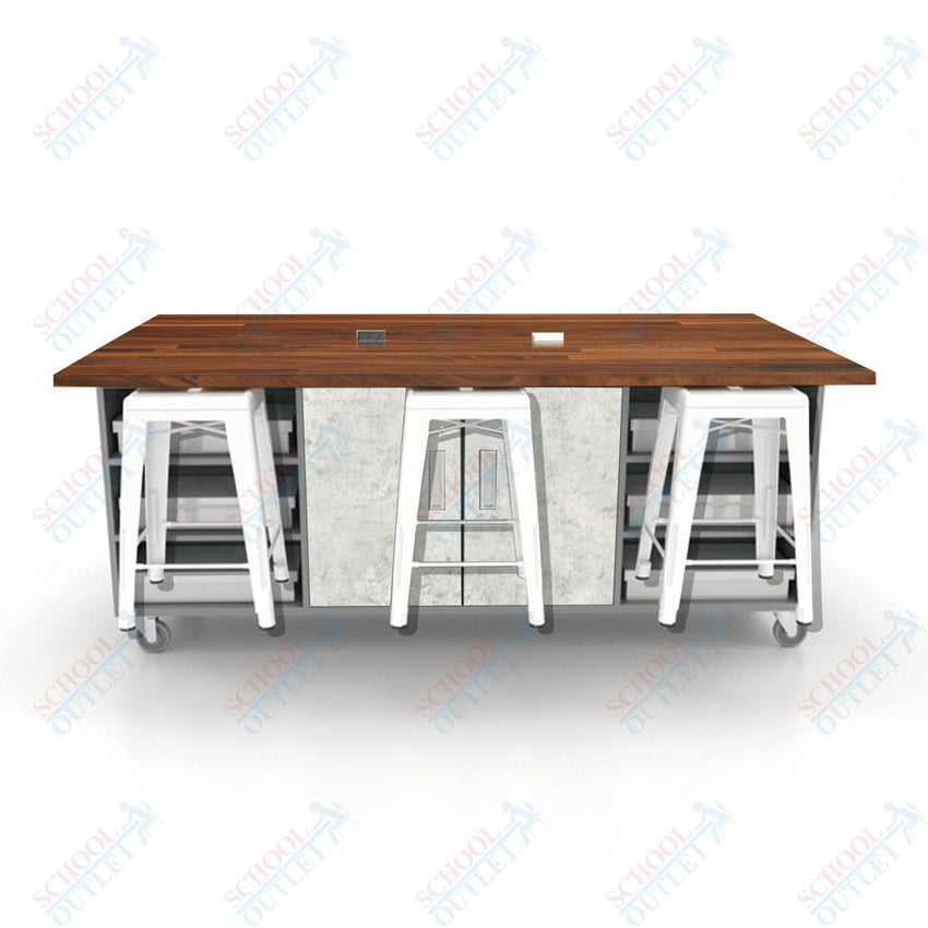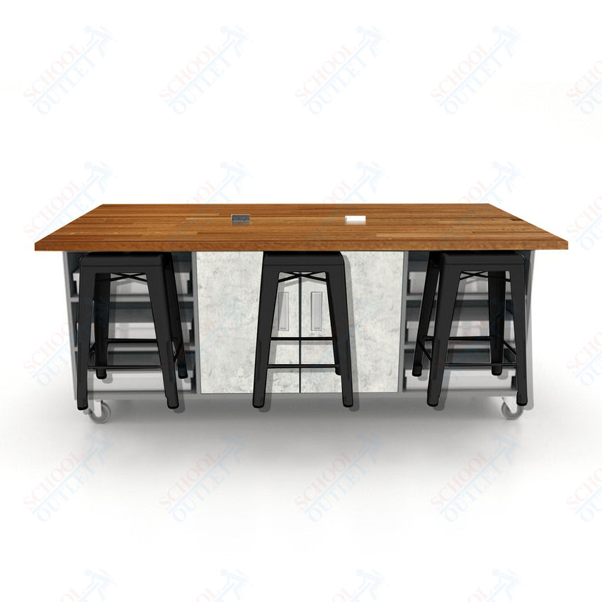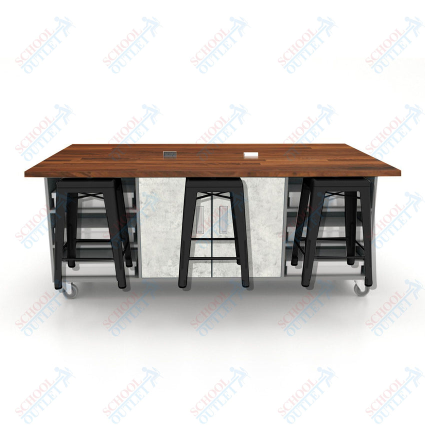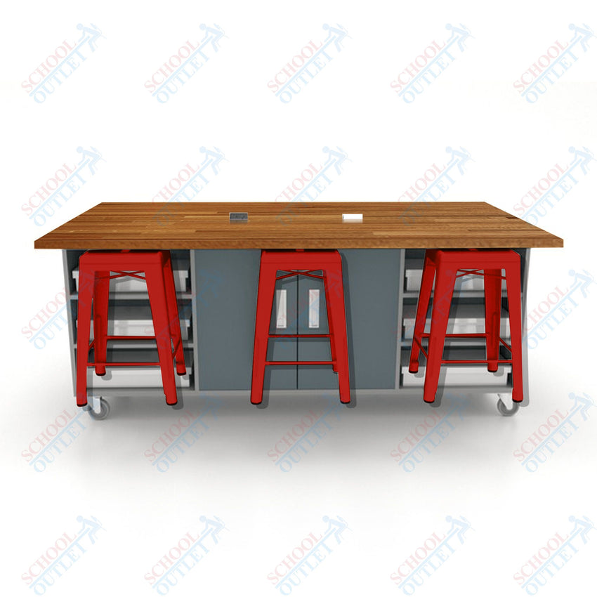 CEF ED Double Table 36"H Butcher Block Top, Laminate Base with 6 Stools, Storage bins, and Electrical Outlets Included.