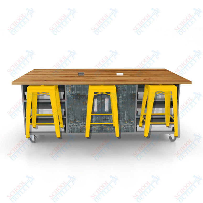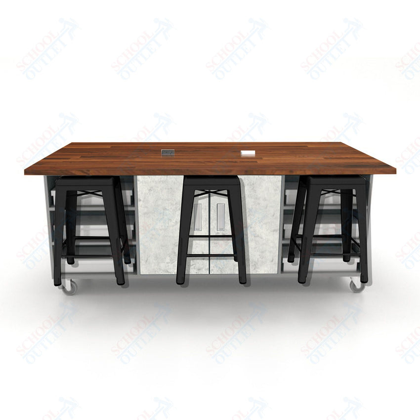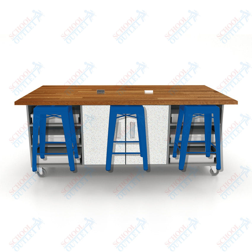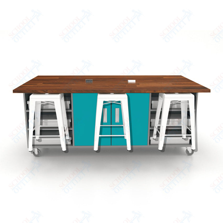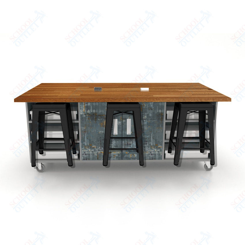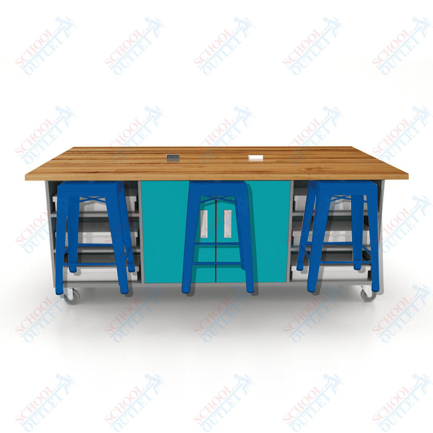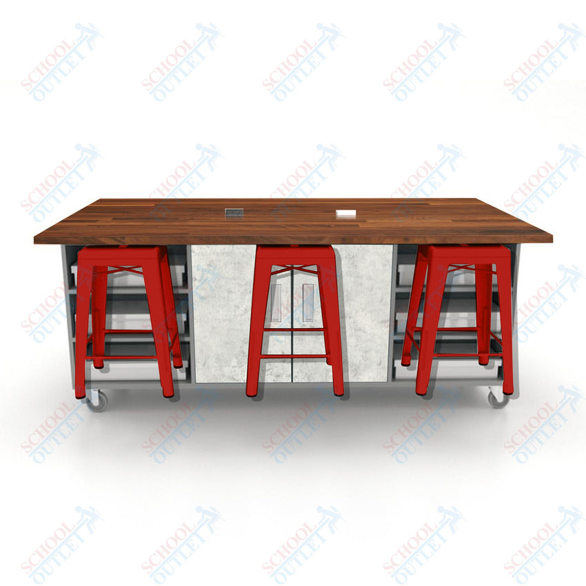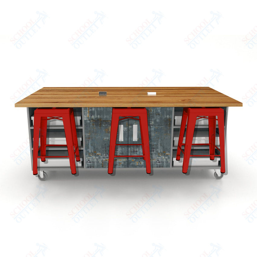 CEF ED Double Table 36"H Butcher Block Top, Laminate Base with 6 Stools, Storage bins, and Electrical Outlets Included.