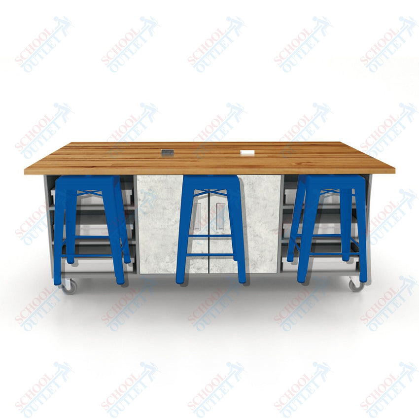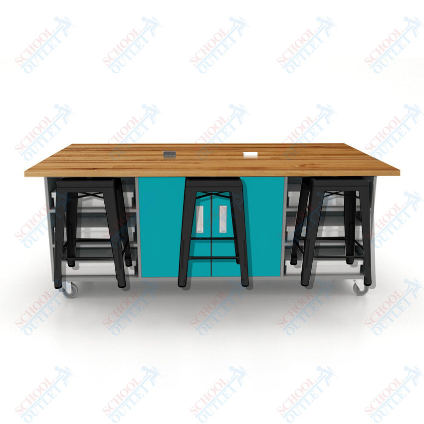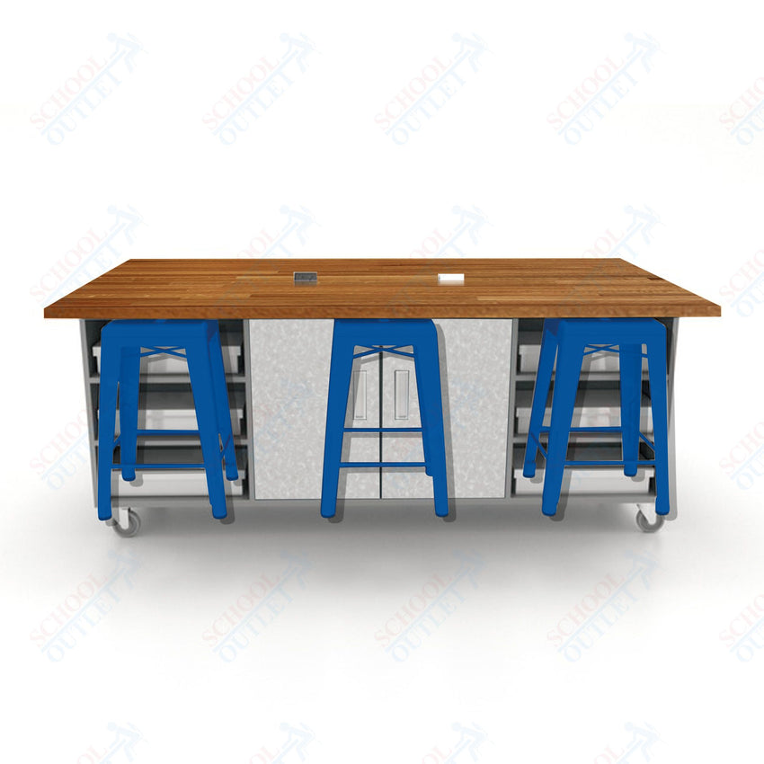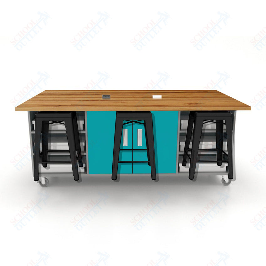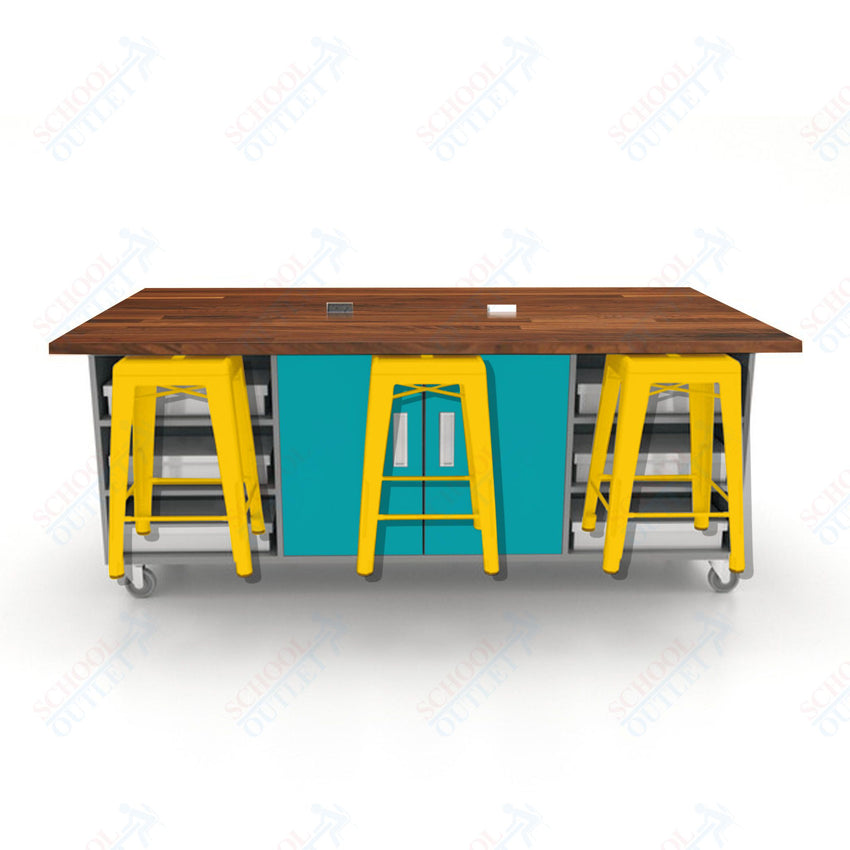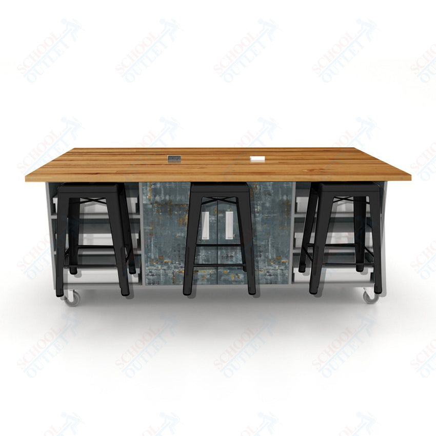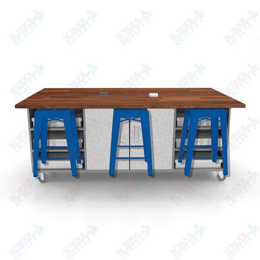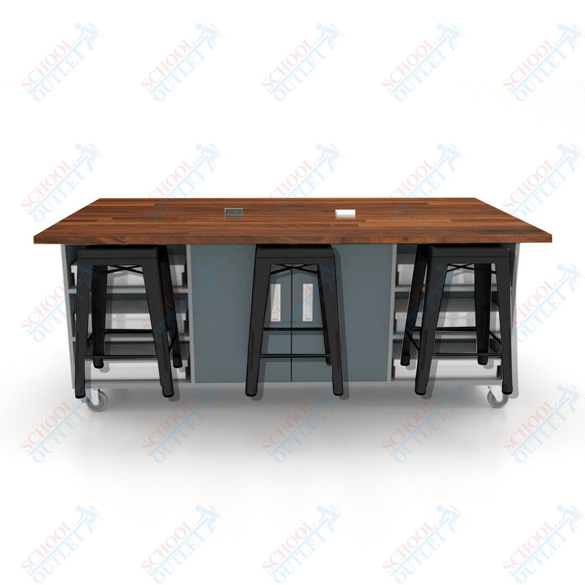 CEF ED Double Table 36"H Butcher Block Top, Laminate Base with 6 Stools, Storage bins, and Electrical Outlets Included.