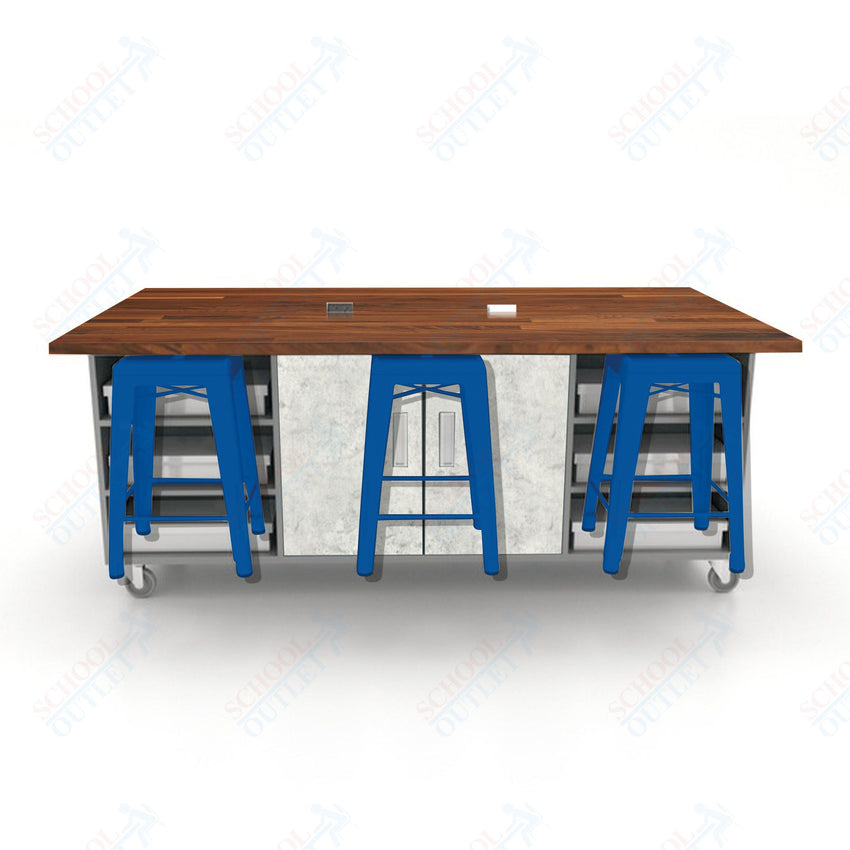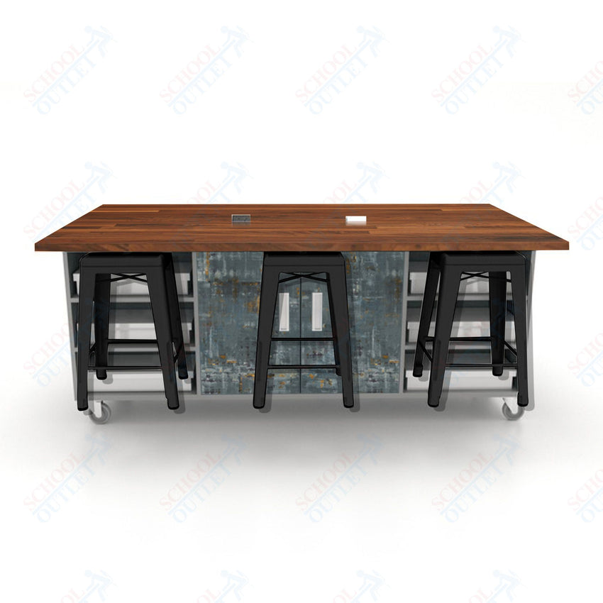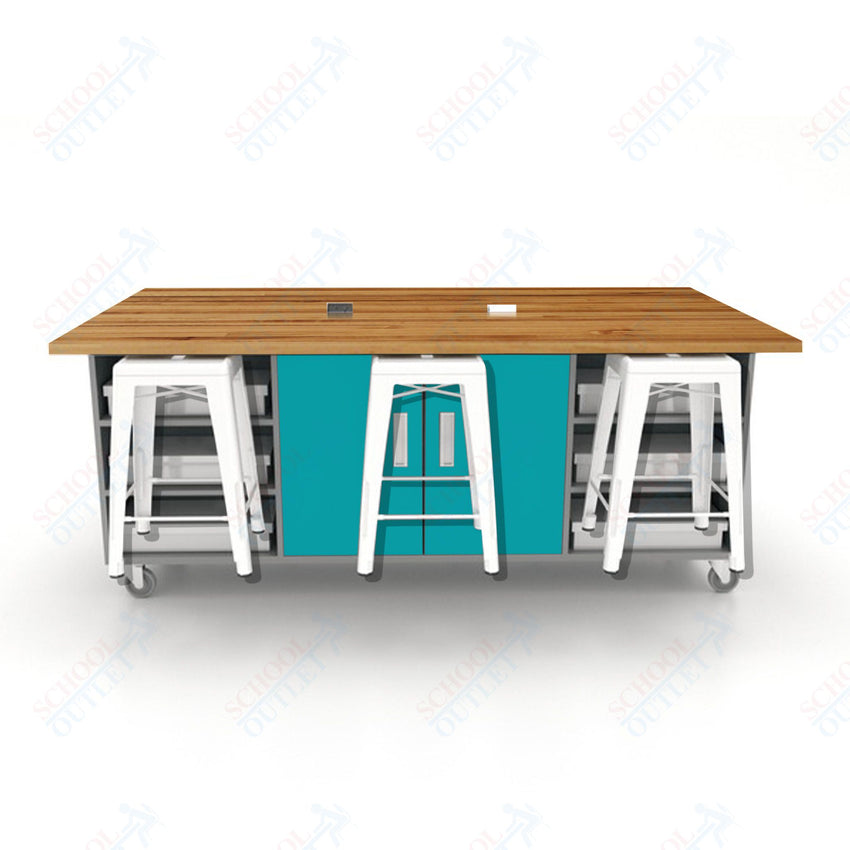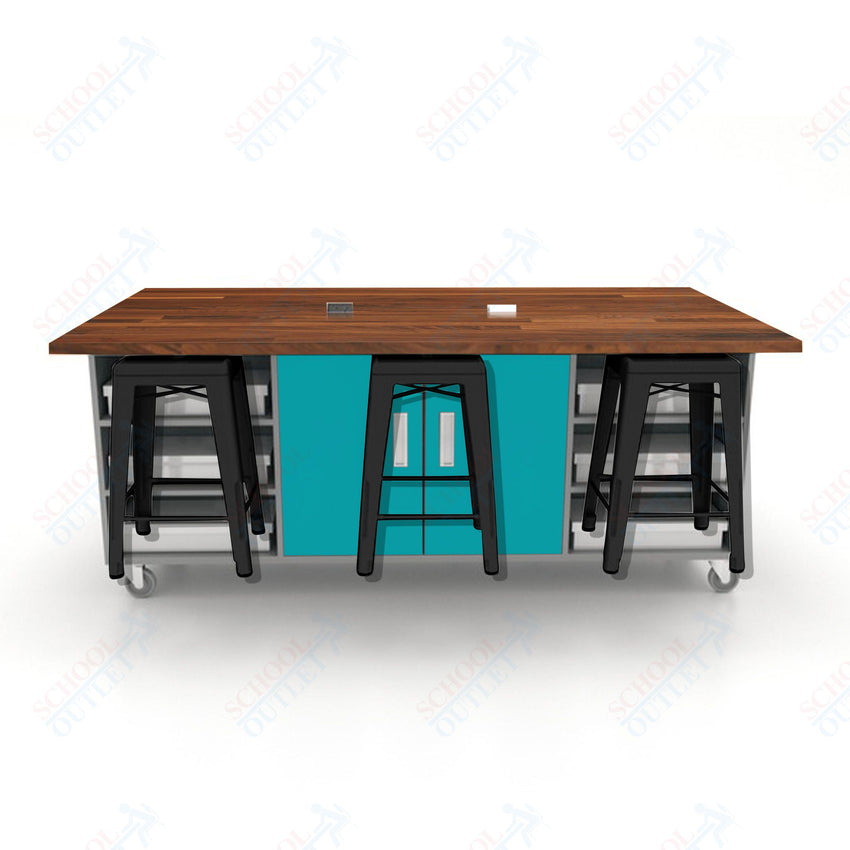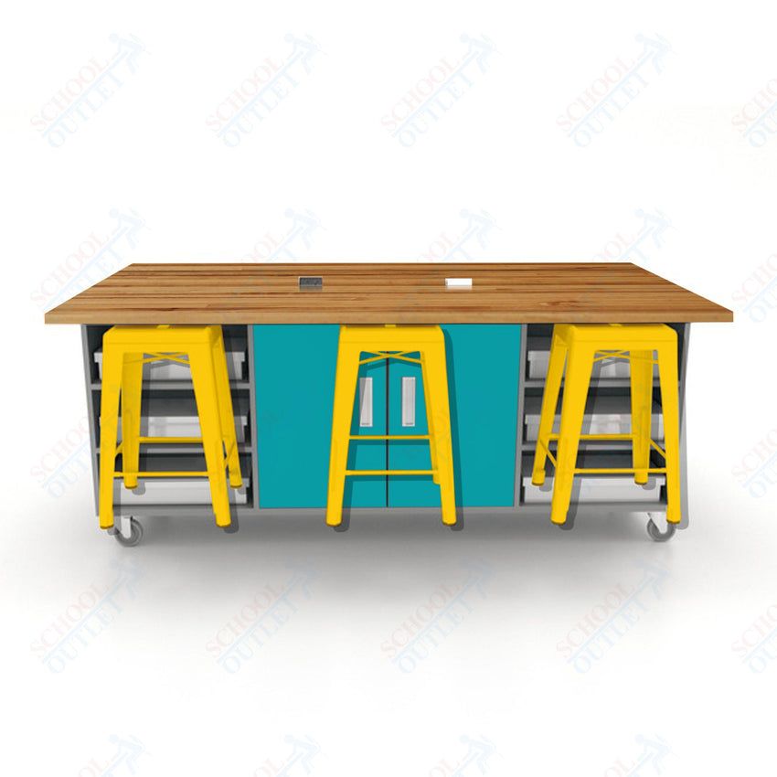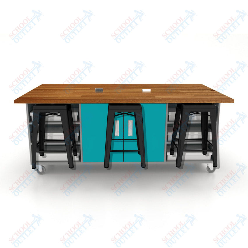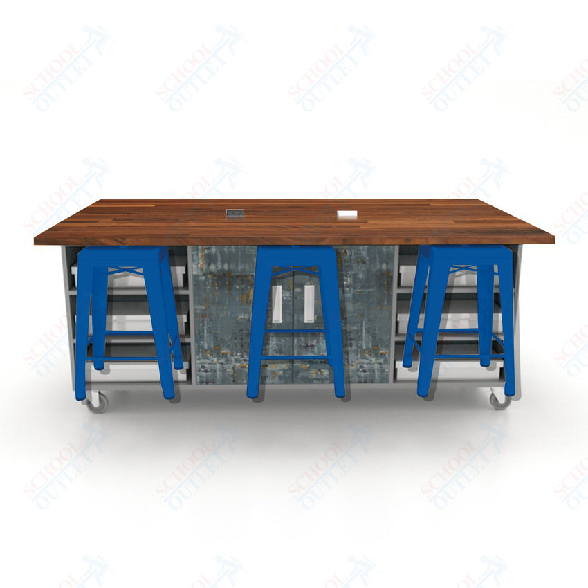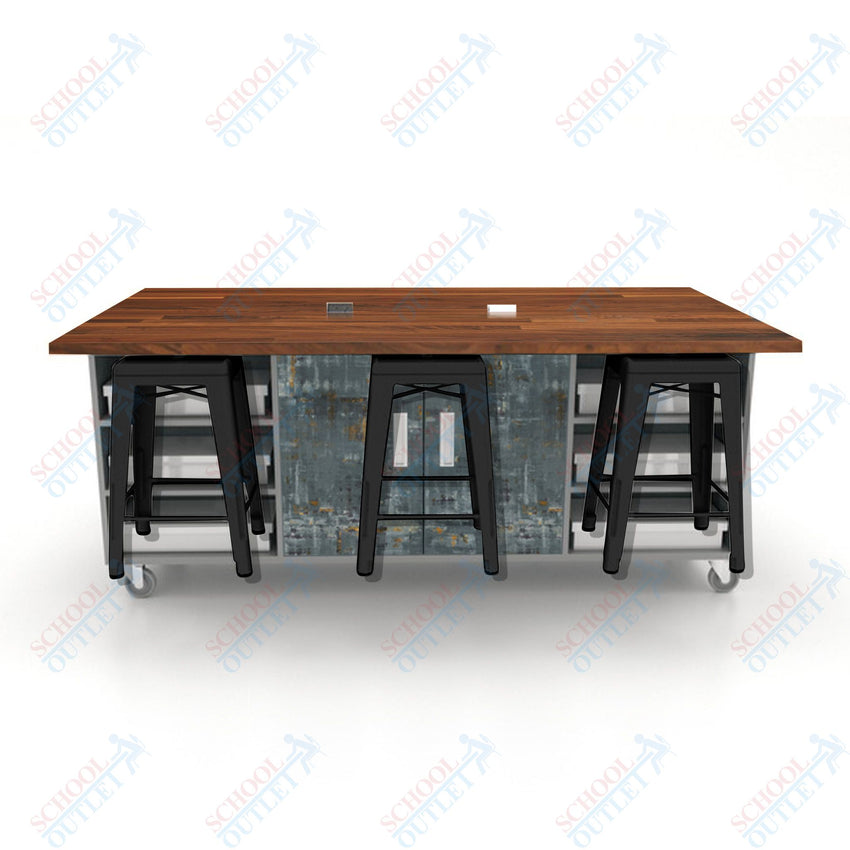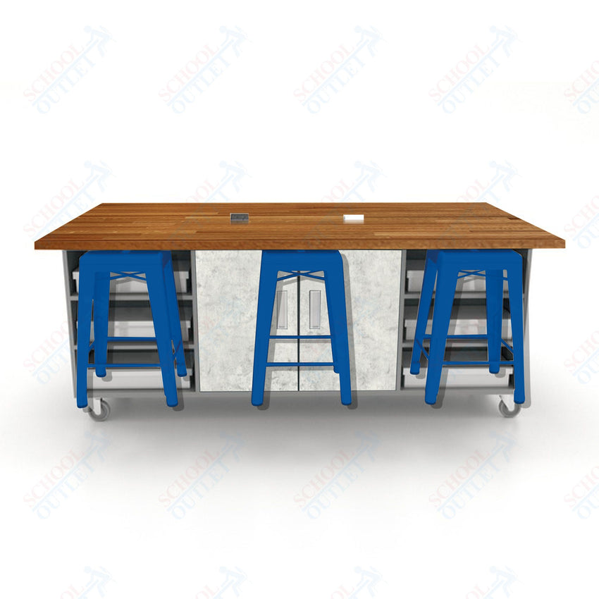 CEF ED Double Table 36"H Butcher Block Top, Laminate Base with 6 Stools, Storage bins, and Electrical Outlets Included.