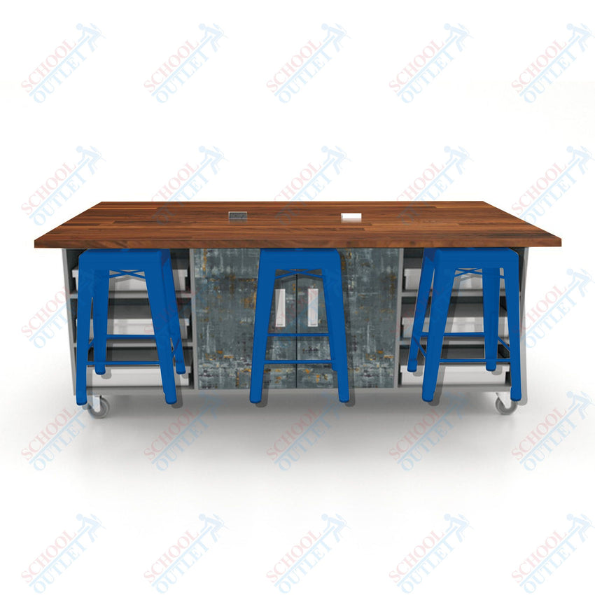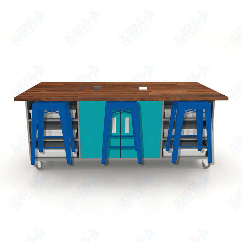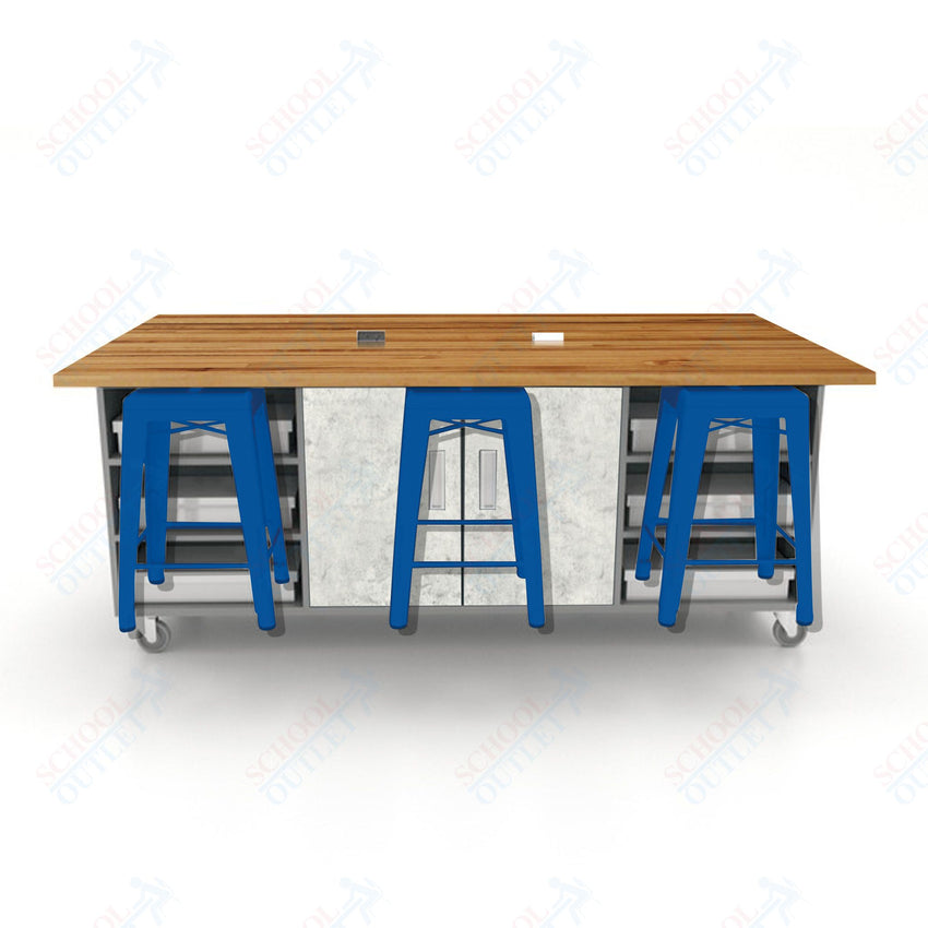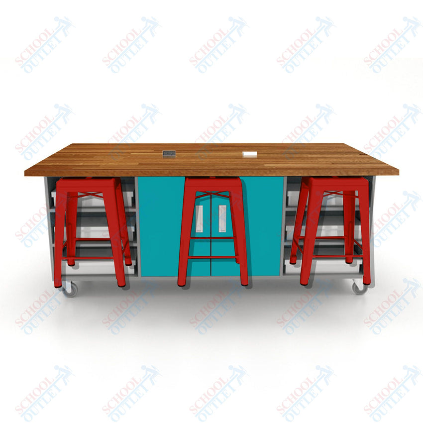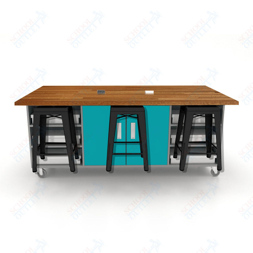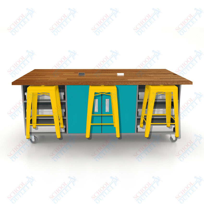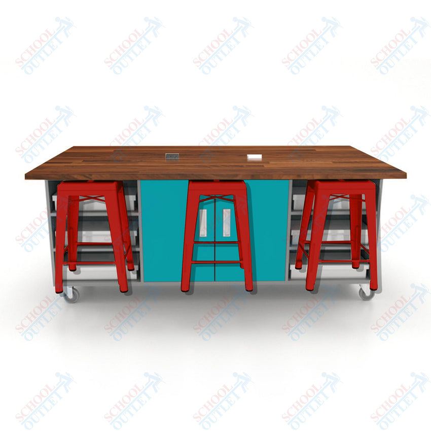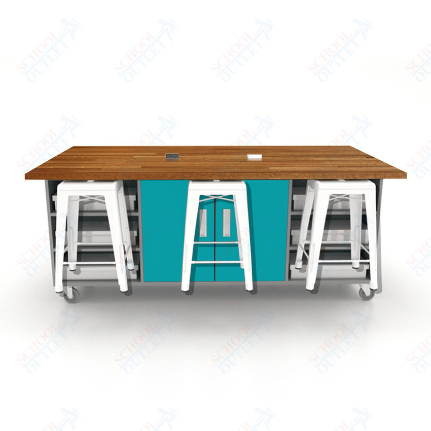 CEF ED Double Table 36"H Butcher Block Top, Laminate Base with 6 Stools, Storage bins, and Electrical Outlets Included.