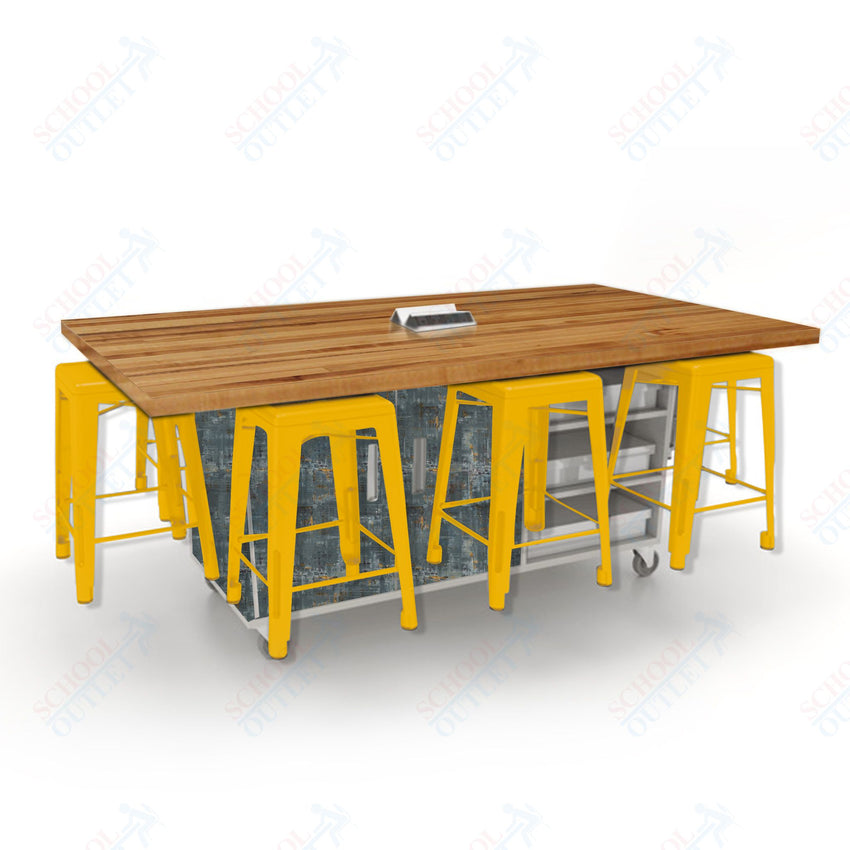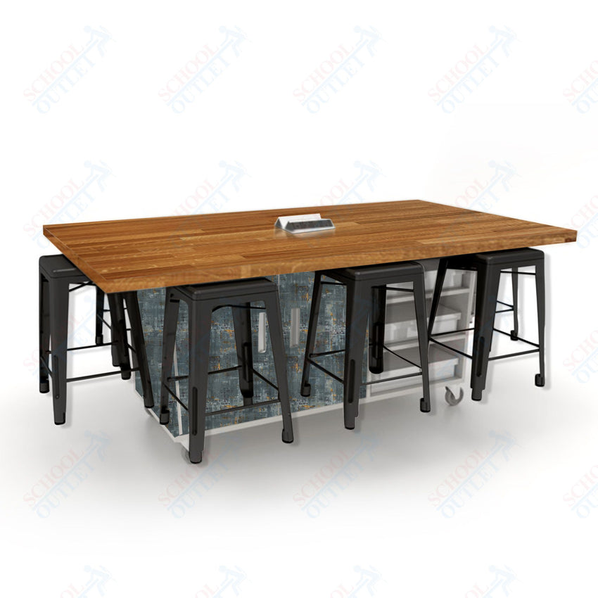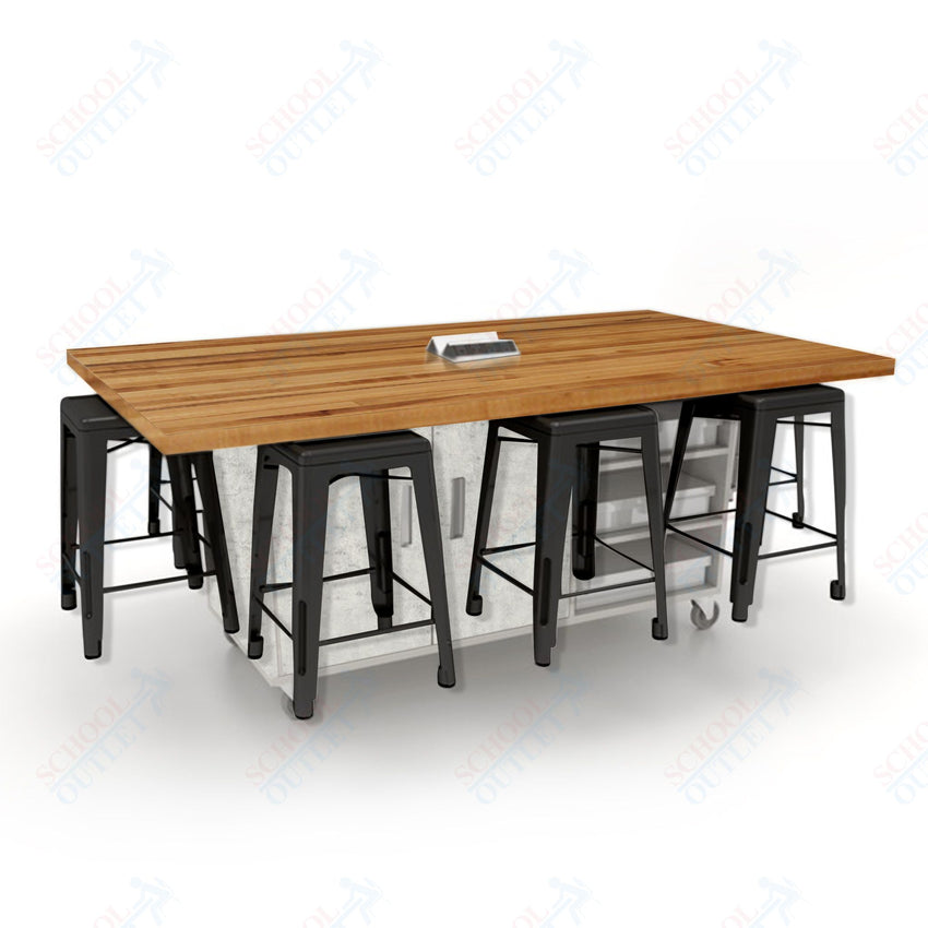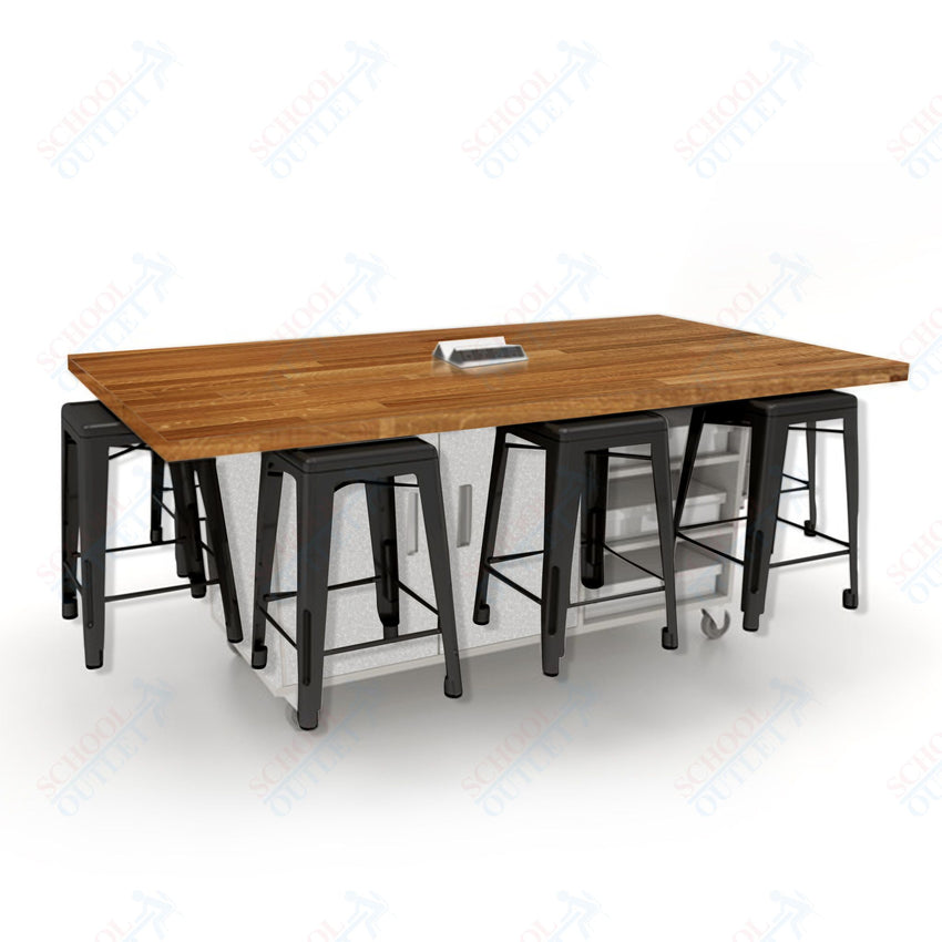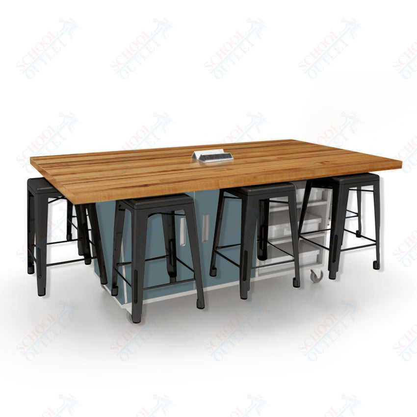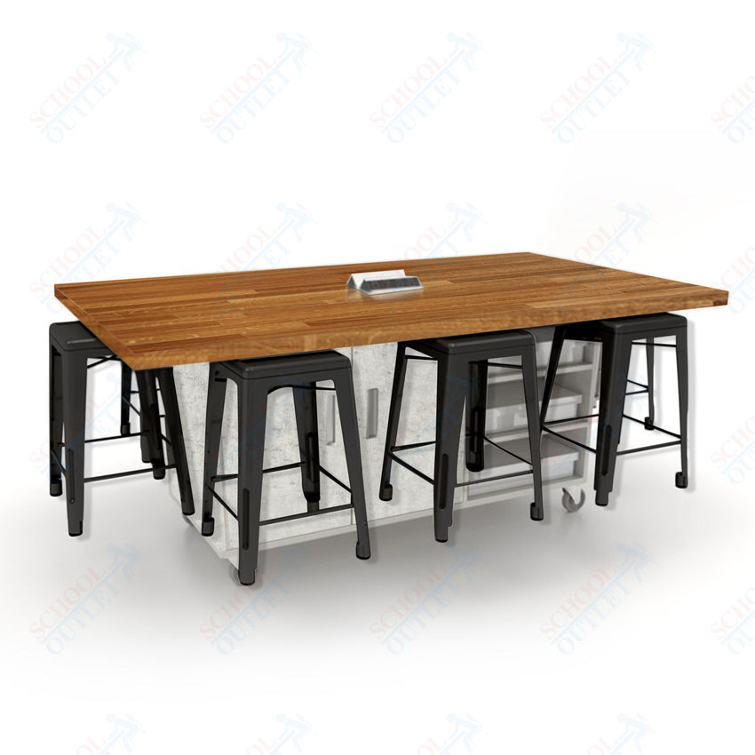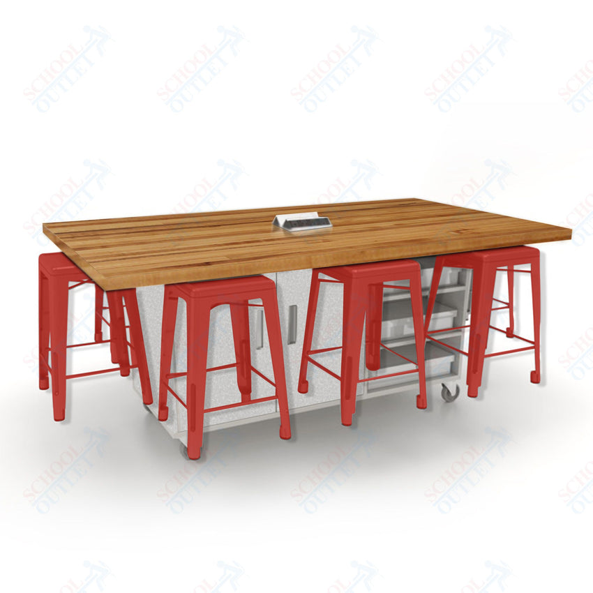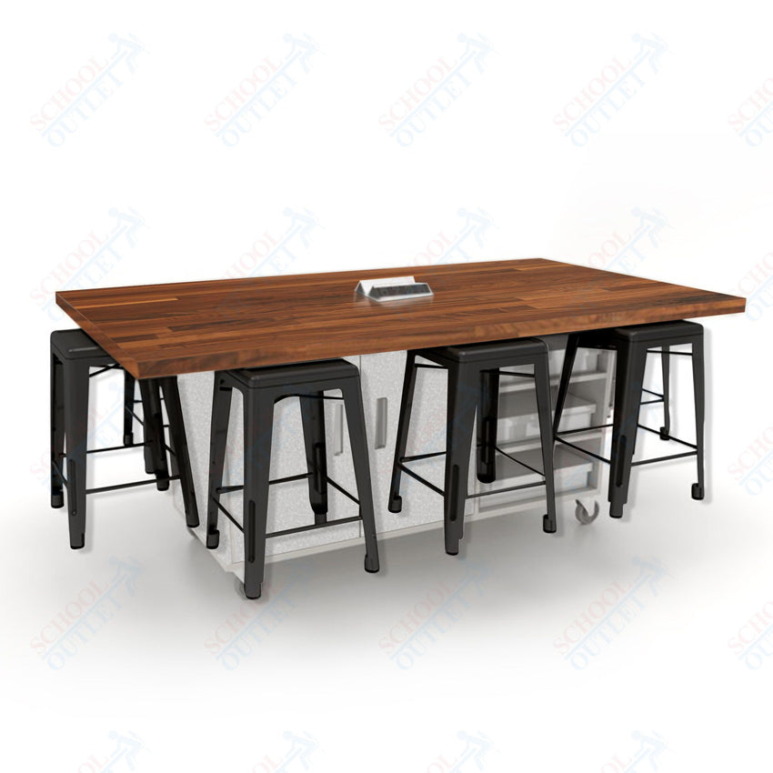CEF ED8 Table 36"H Butcher Block Top, Laminate Base with 8 Stools, Storage bins, and Electrical Outlets Included.