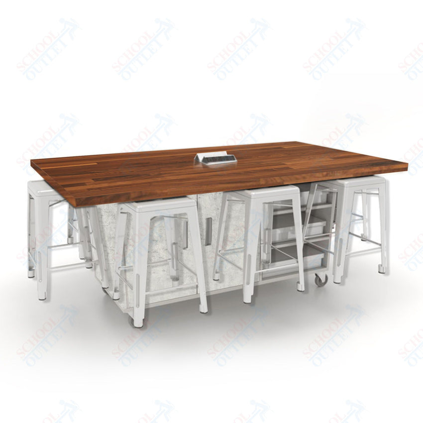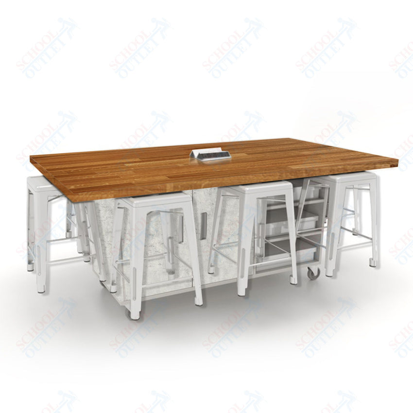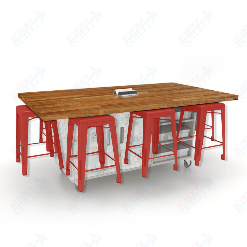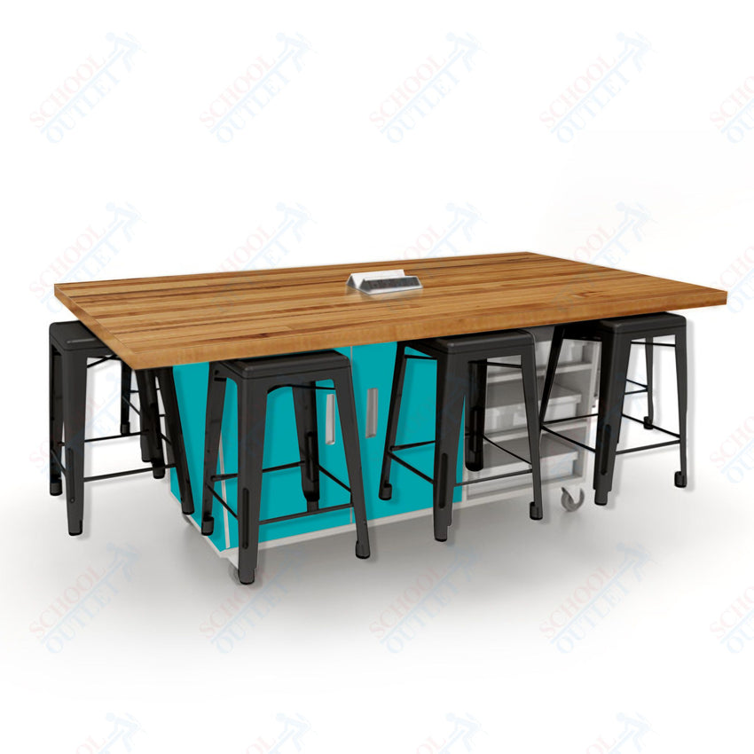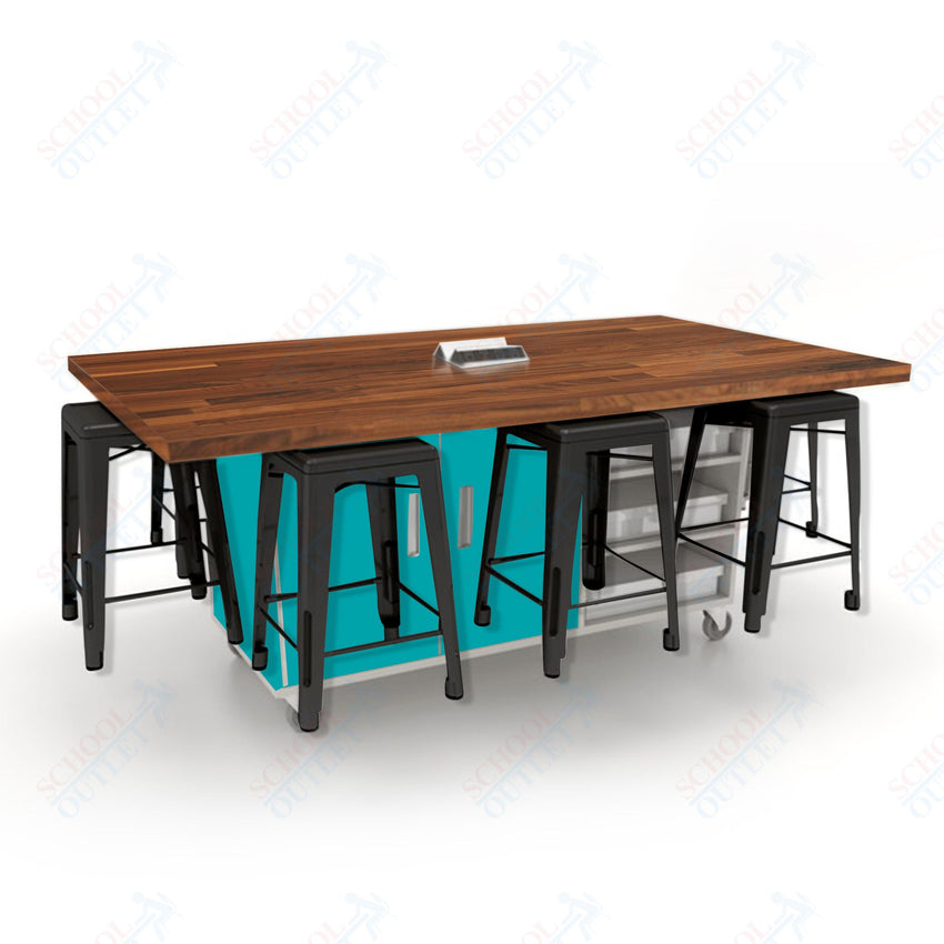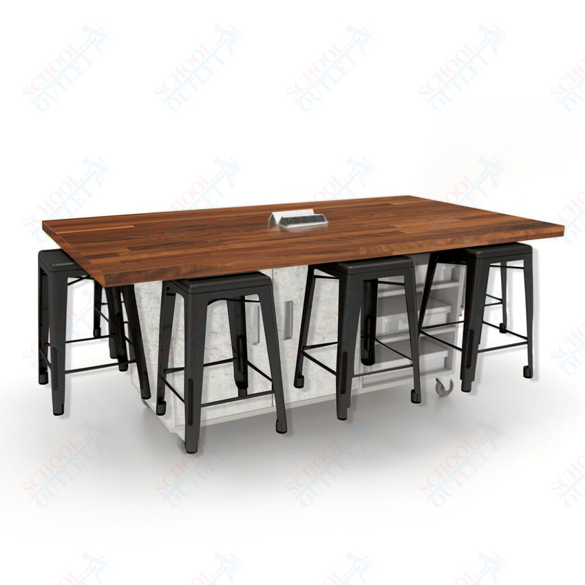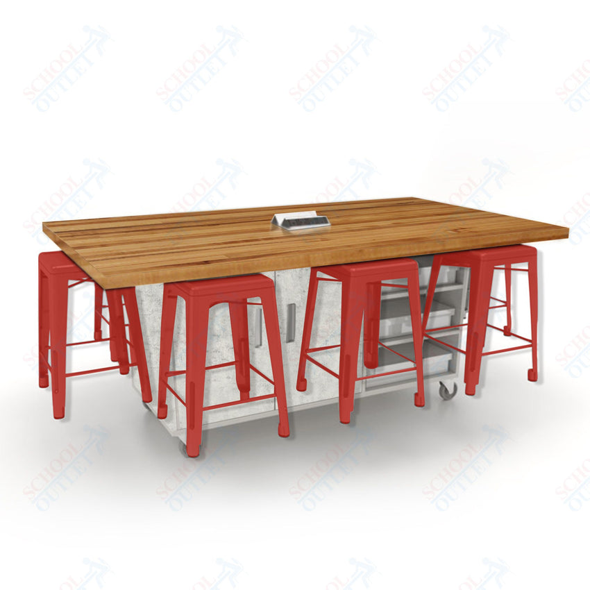 CEF ED8 Table 36"H Butcher Block Top, Laminate Base with 8 Stools, Storage bins, and Electrical Outlets Included.
