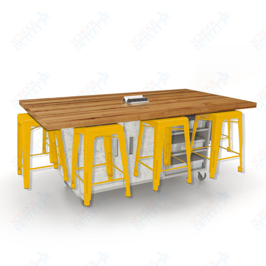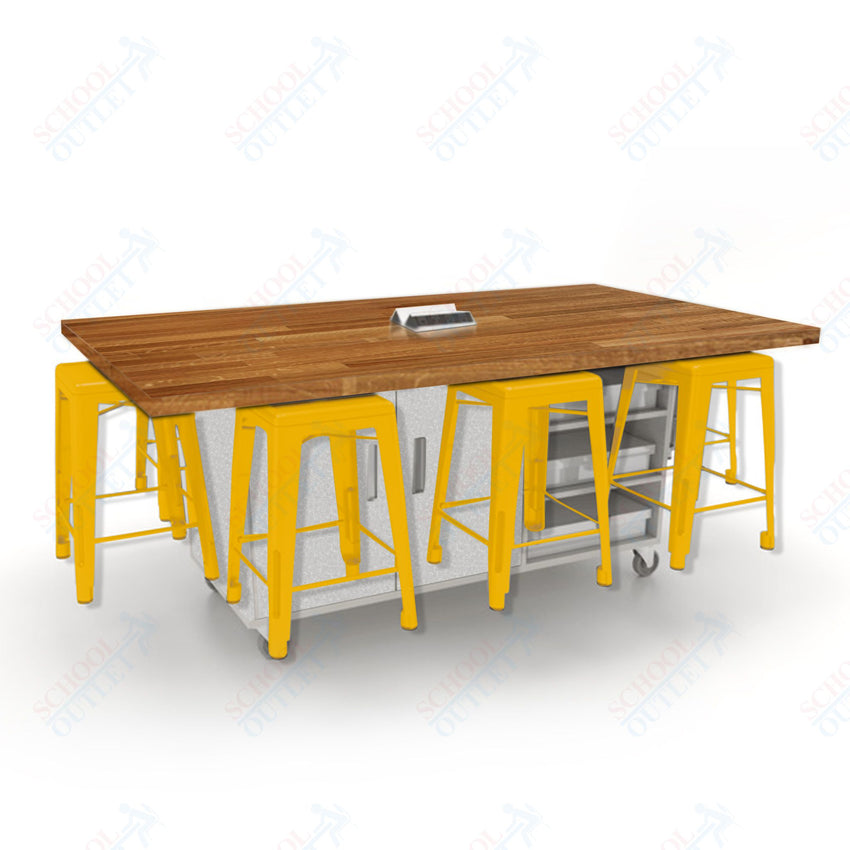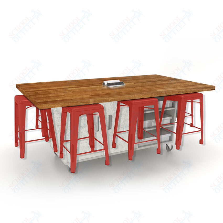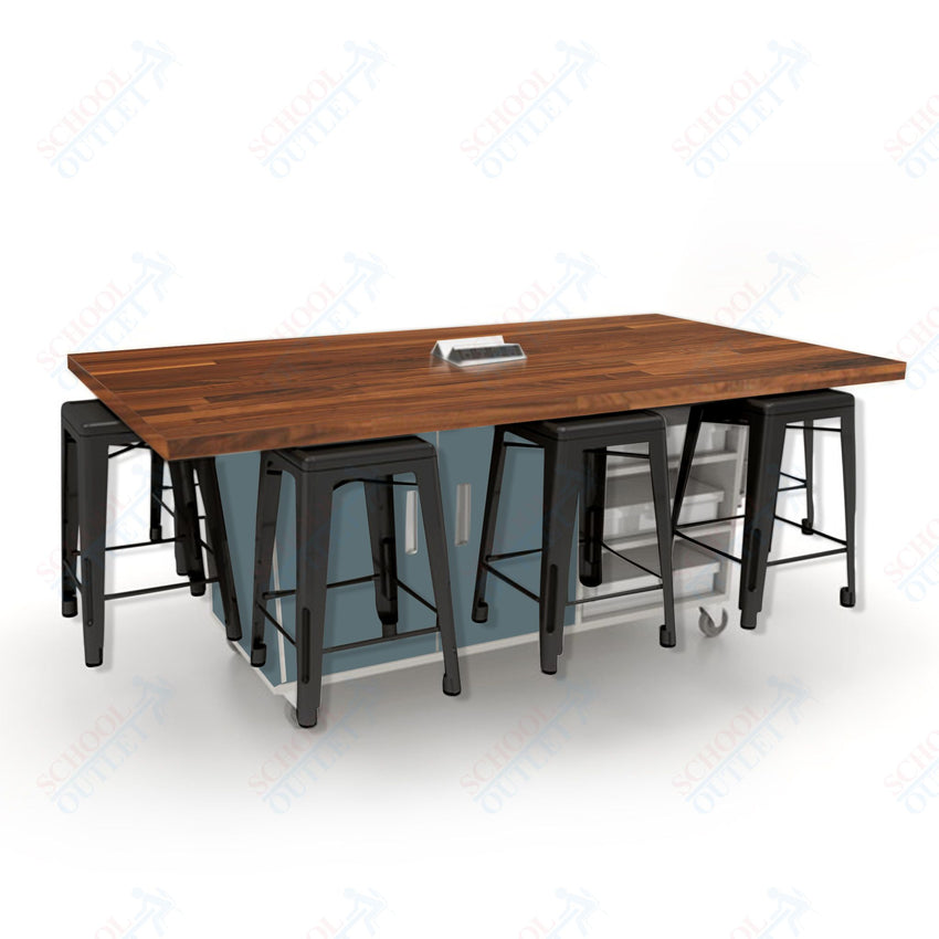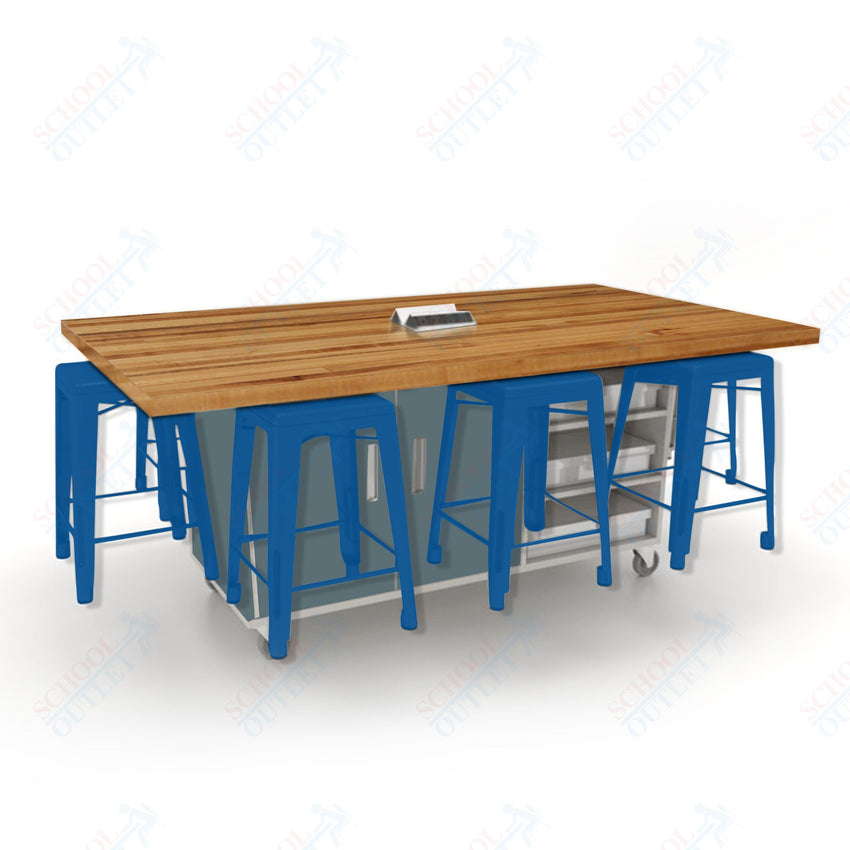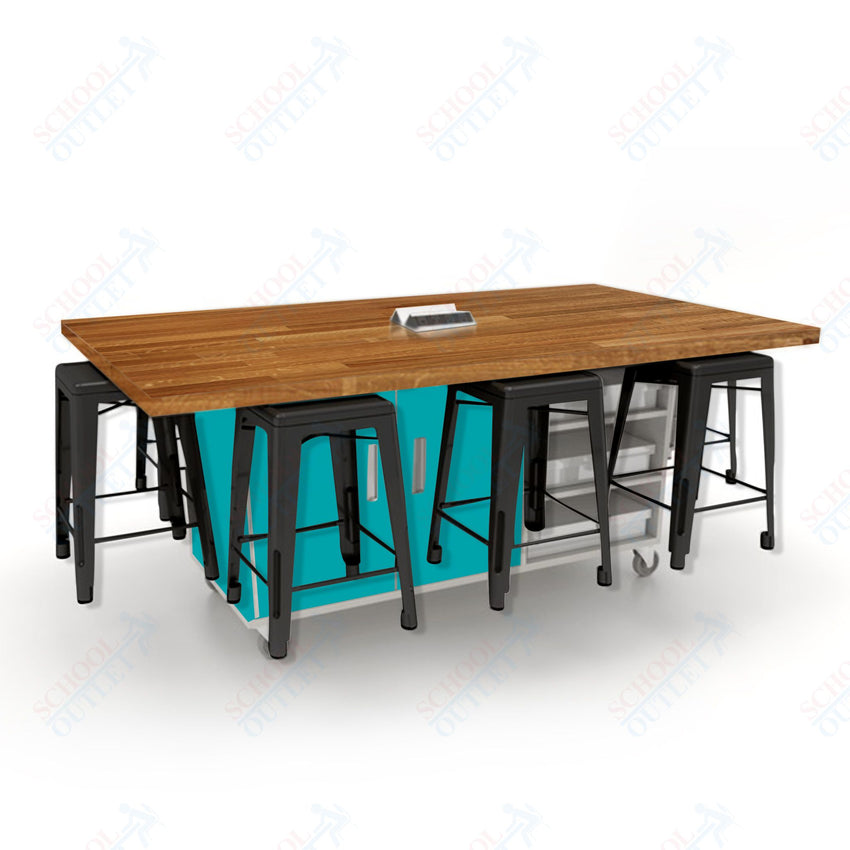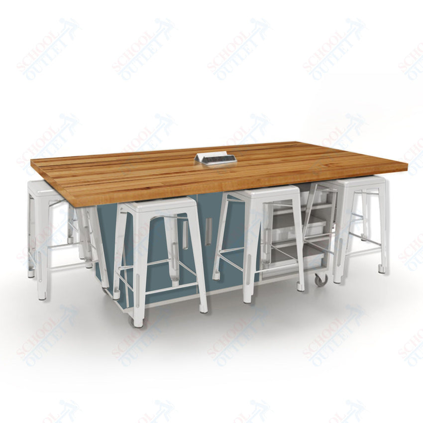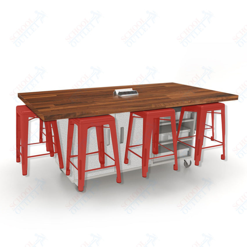 CEF ED8 Table 36"H Butcher Block Top, Laminate Base with 8 Stools, Storage bins, and Electrical Outlets Included.