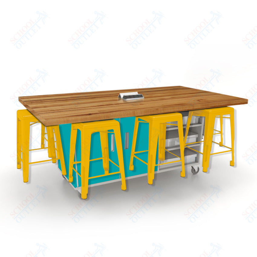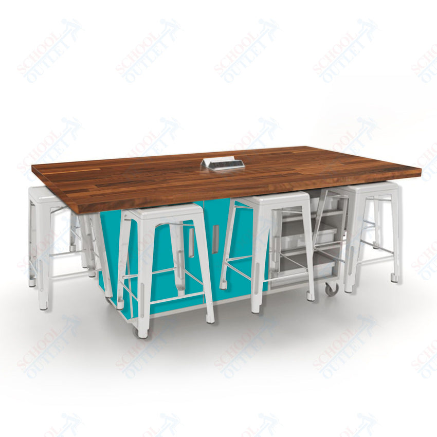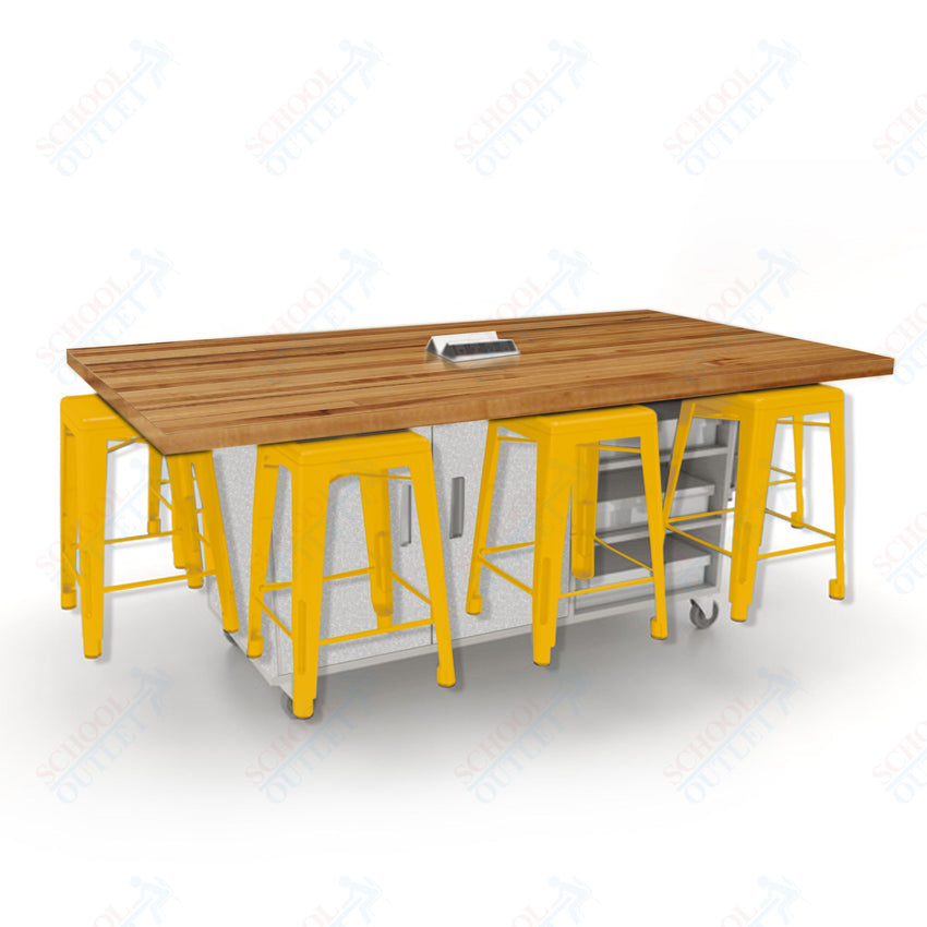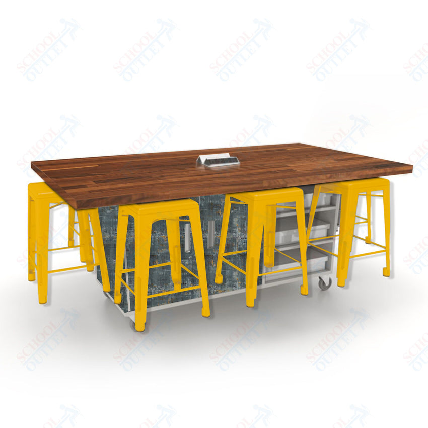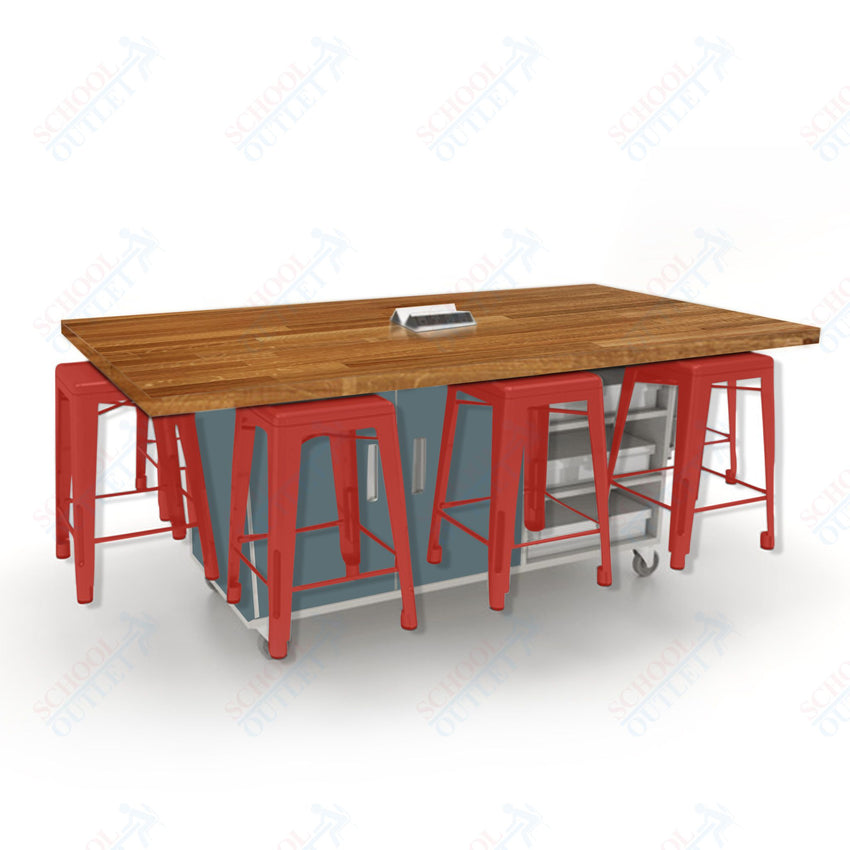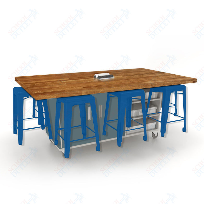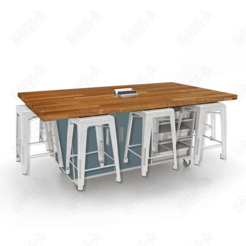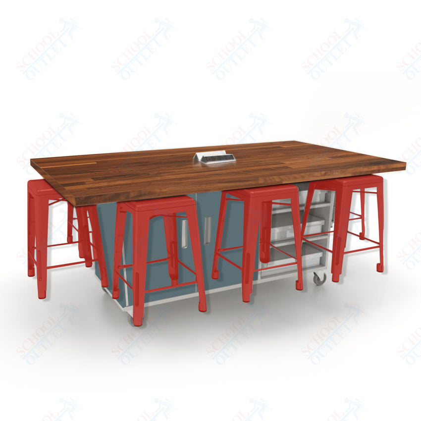 CEF ED8 Table 36"H Butcher Block Top, Laminate Base with 8 Stools, Storage bins, and Electrical Outlets Included.