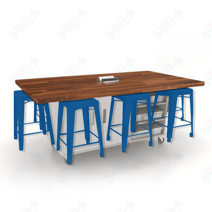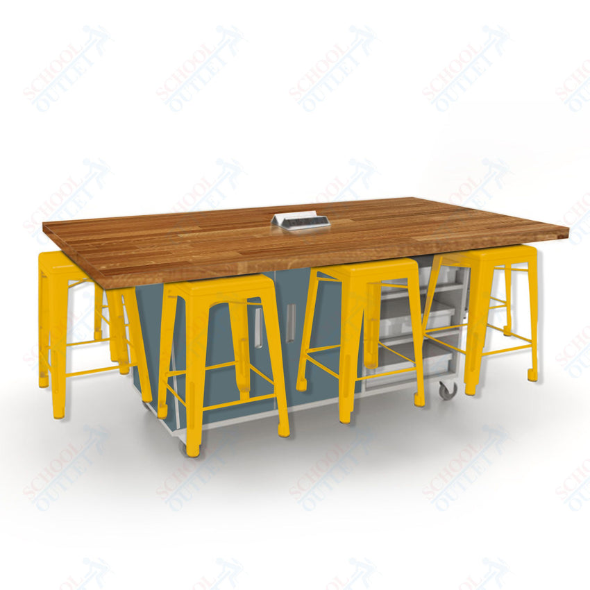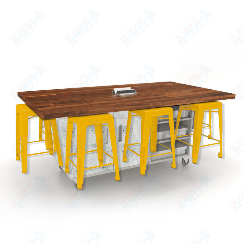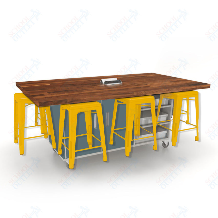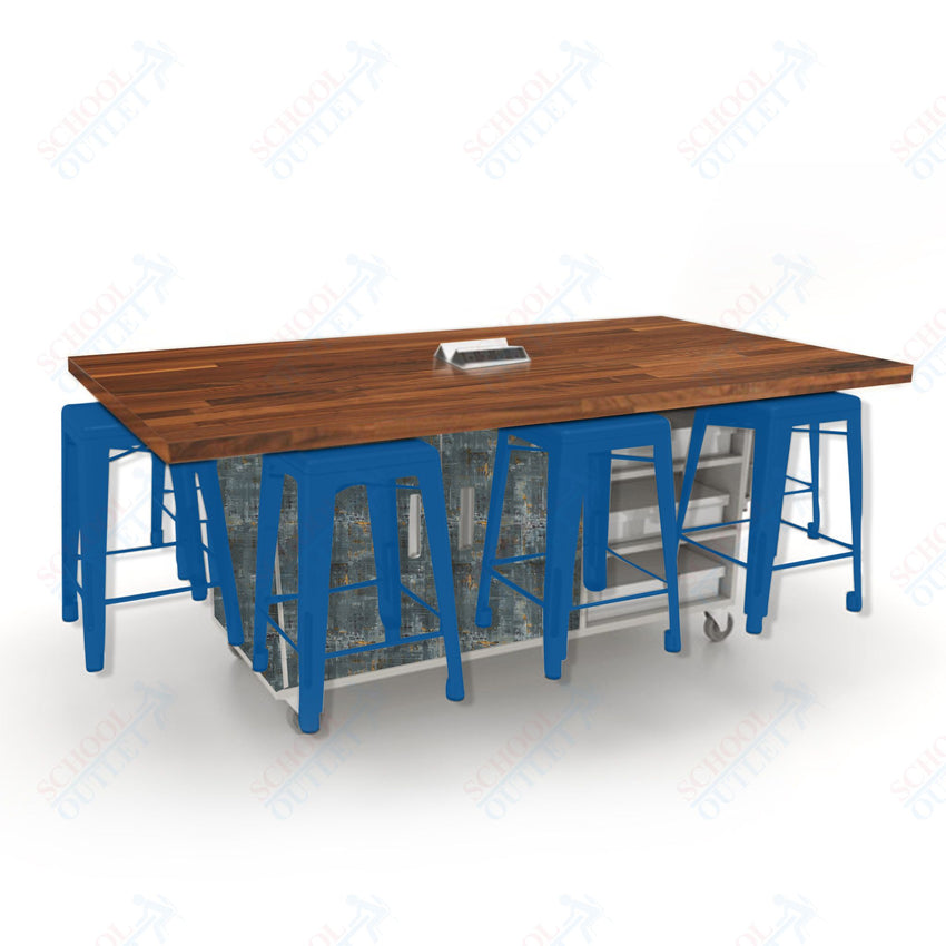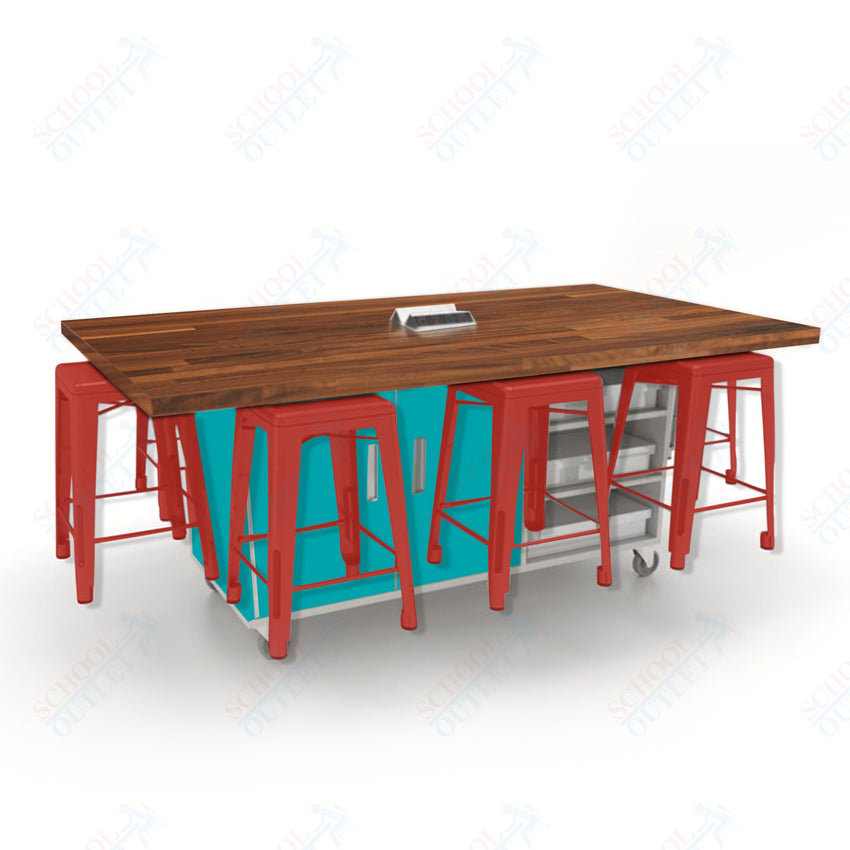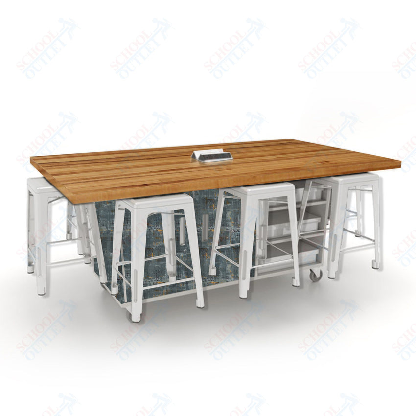 CEF ED8 Table 36"H Butcher Block Top, Laminate Base with 8 Stools, Storage bins, and Electrical Outlets Included.