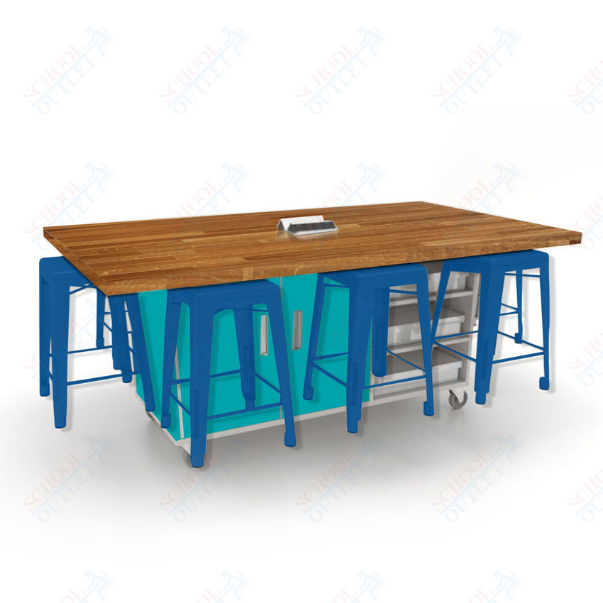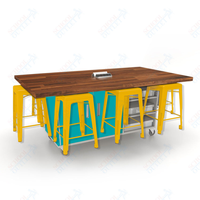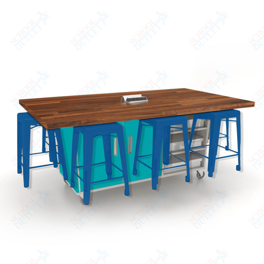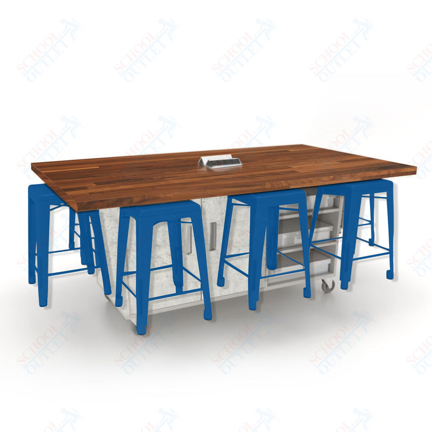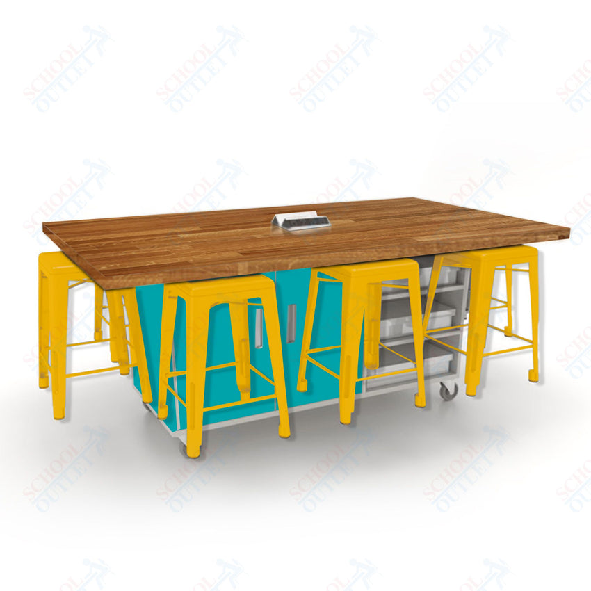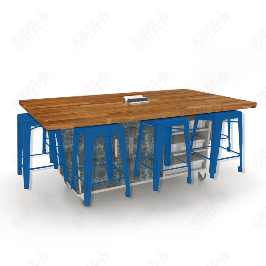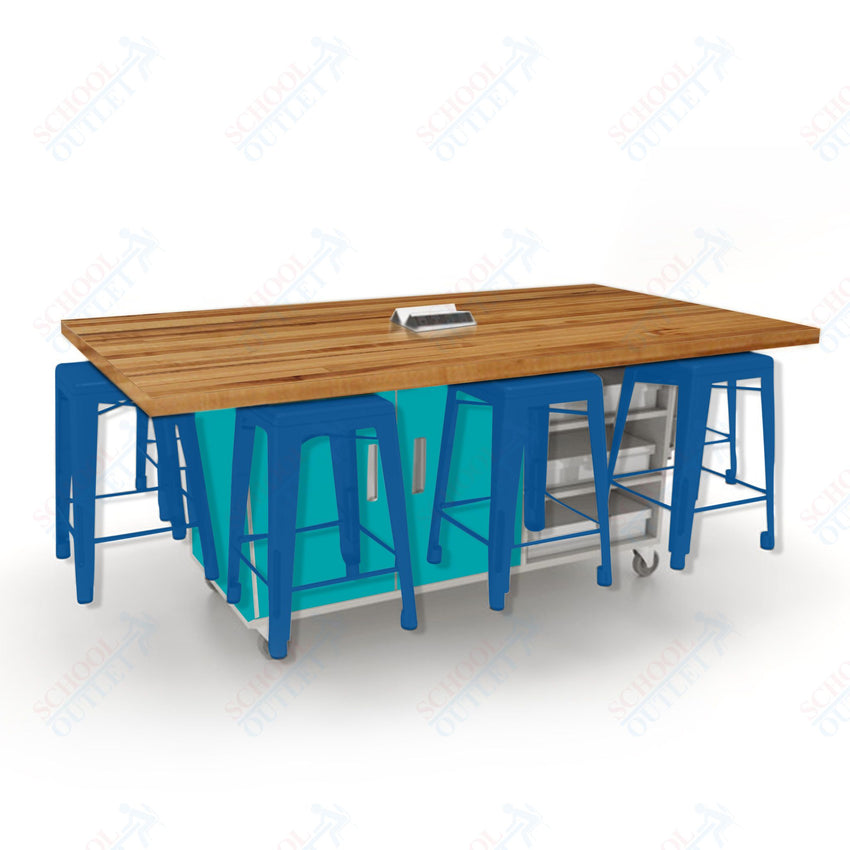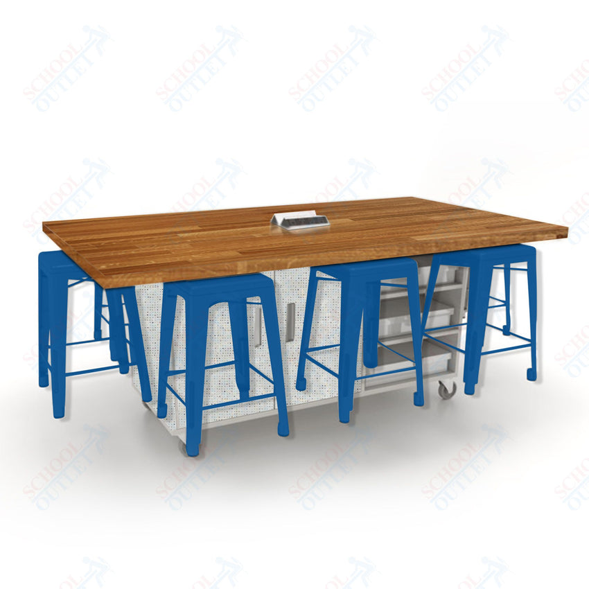 CEF ED8 Table 36"H Butcher Block Top, Laminate Base with 8 Stools, Storage bins, and Electrical Outlets Included.