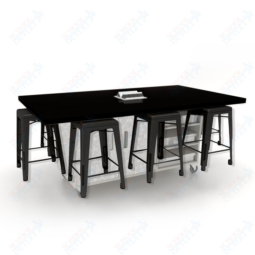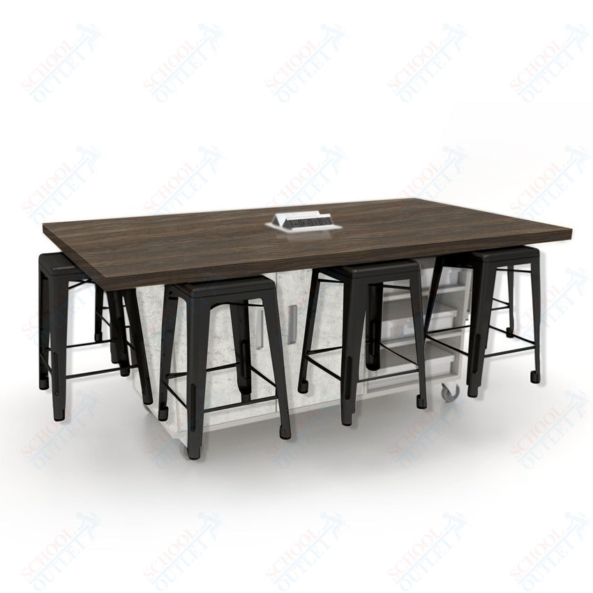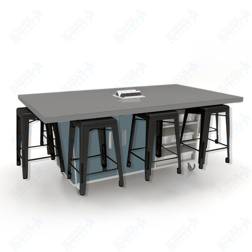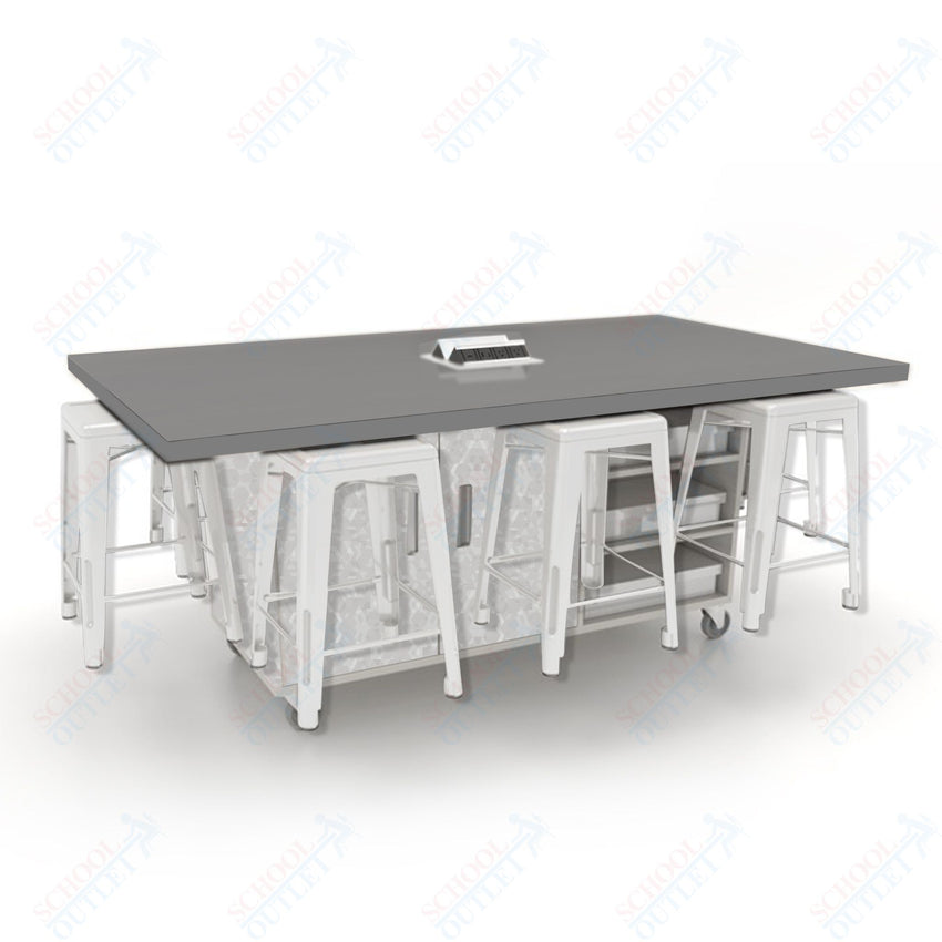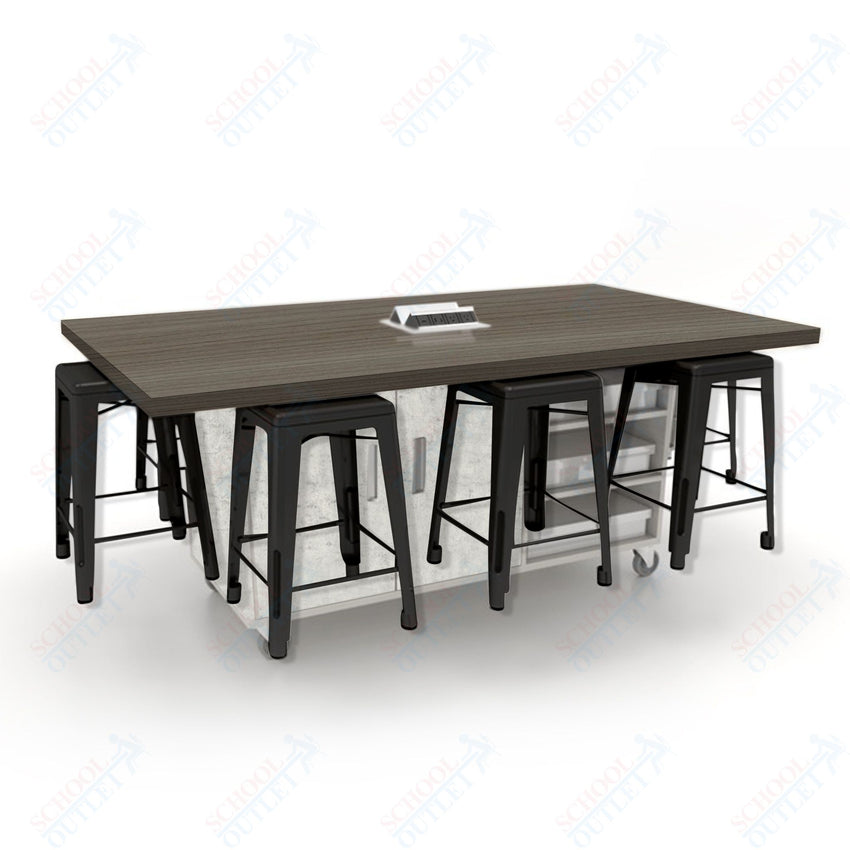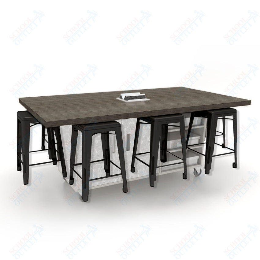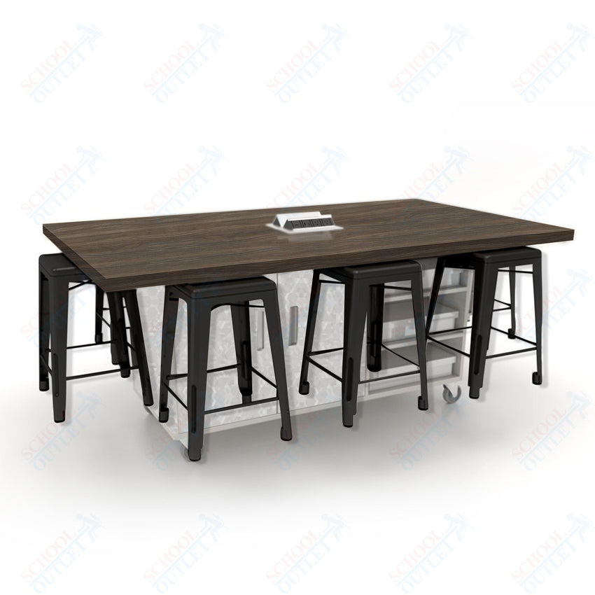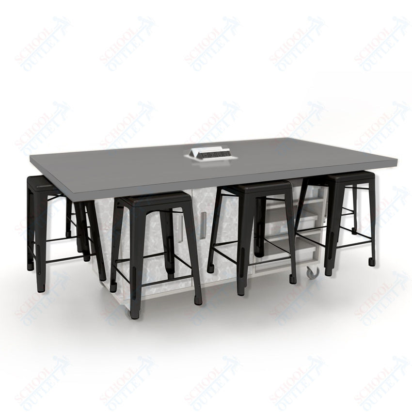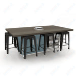 CEF ED8 Table 36"H High Pressure Laminate Top, Laminate Base with 8 Stools, Storage bins, and Electrical Outlets Included.