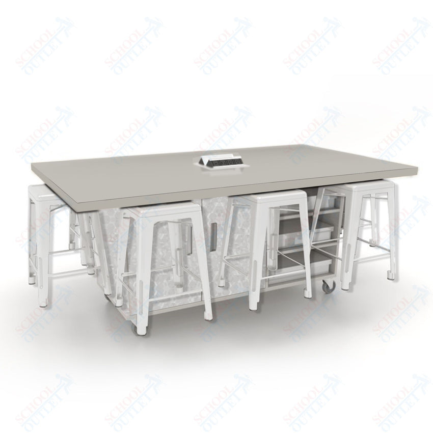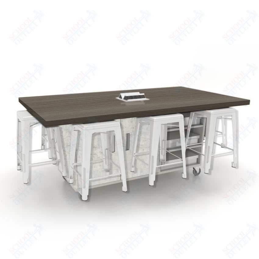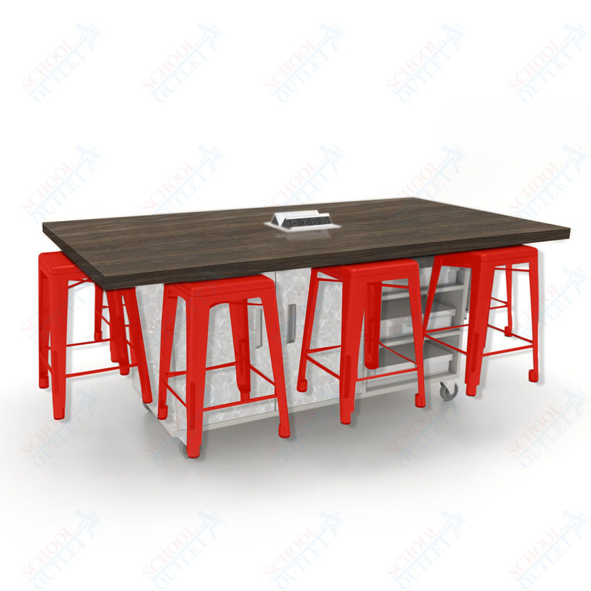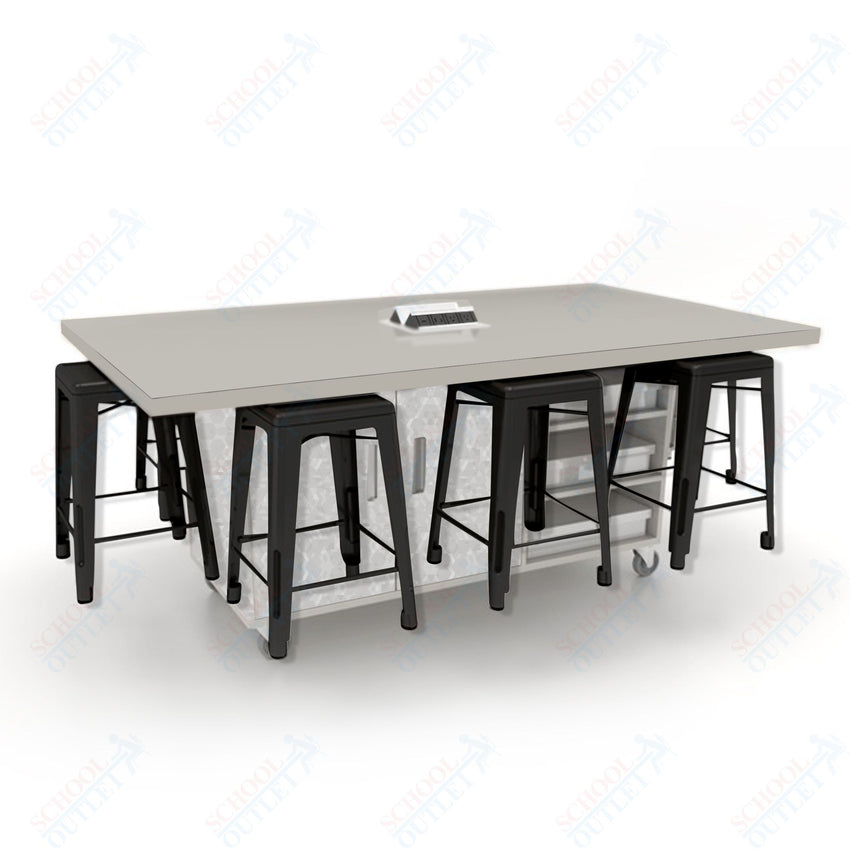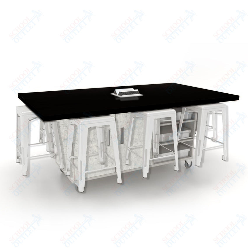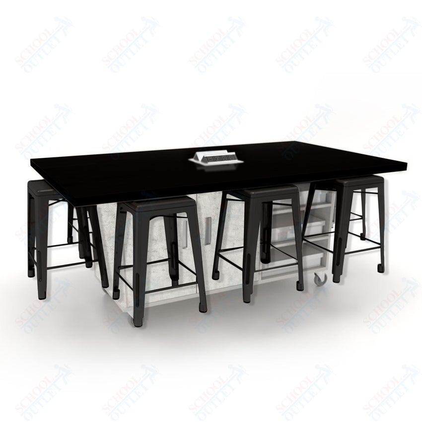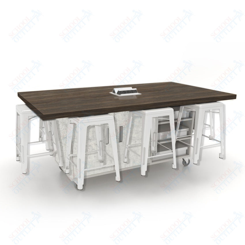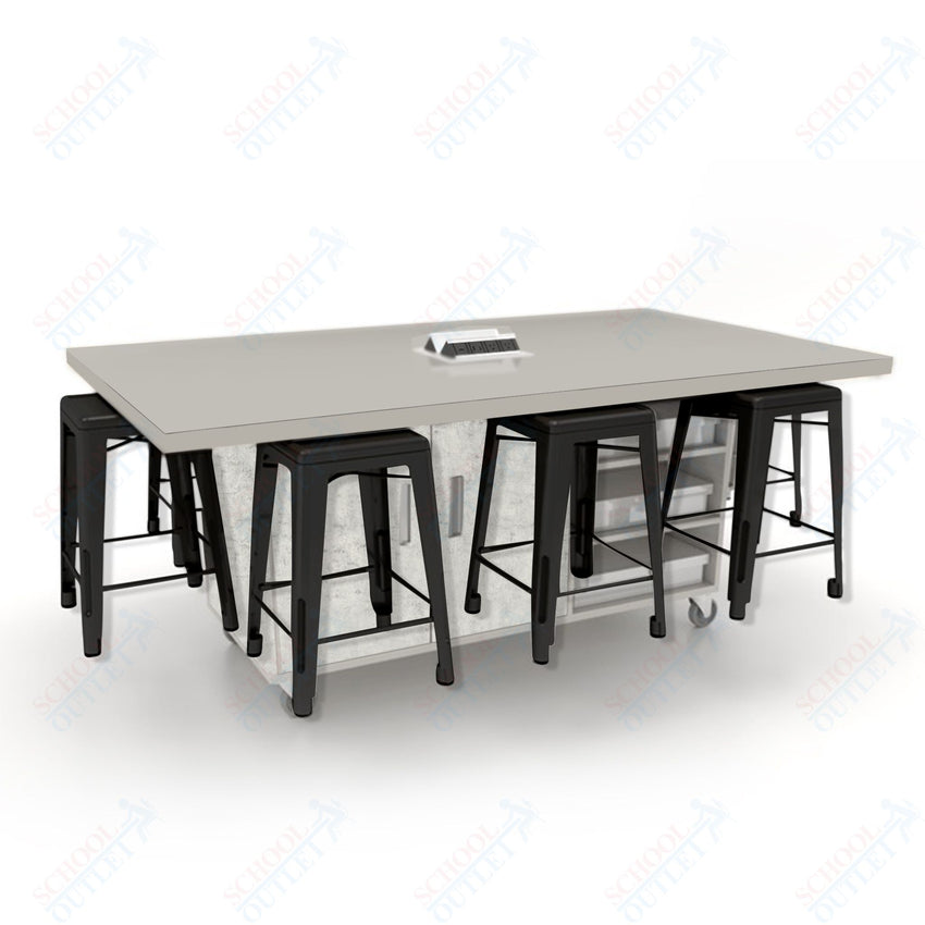 CEF ED8 Table 36"H High Pressure Laminate Top, Laminate Base with 8 Stools, Storage bins, and Electrical Outlets Included.
