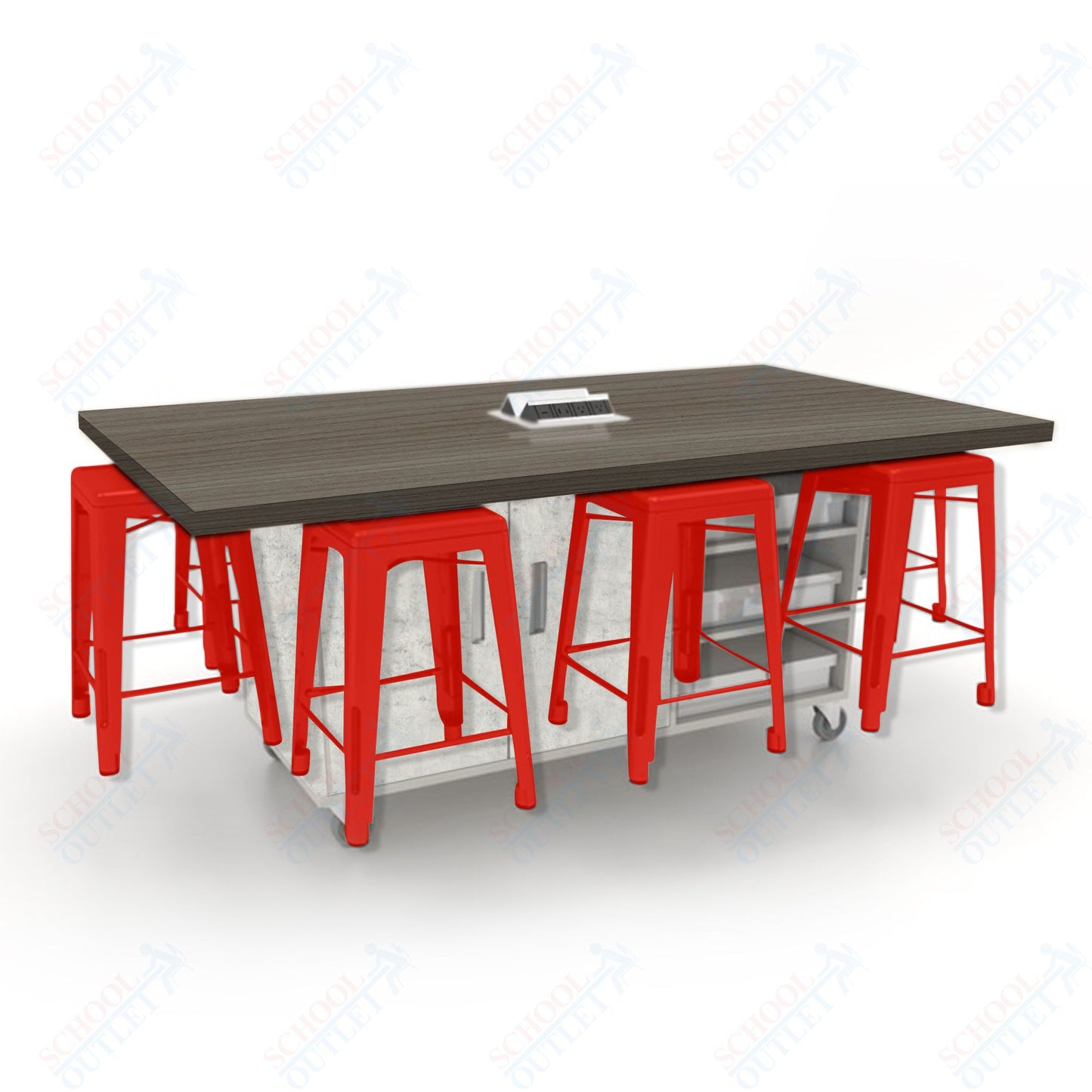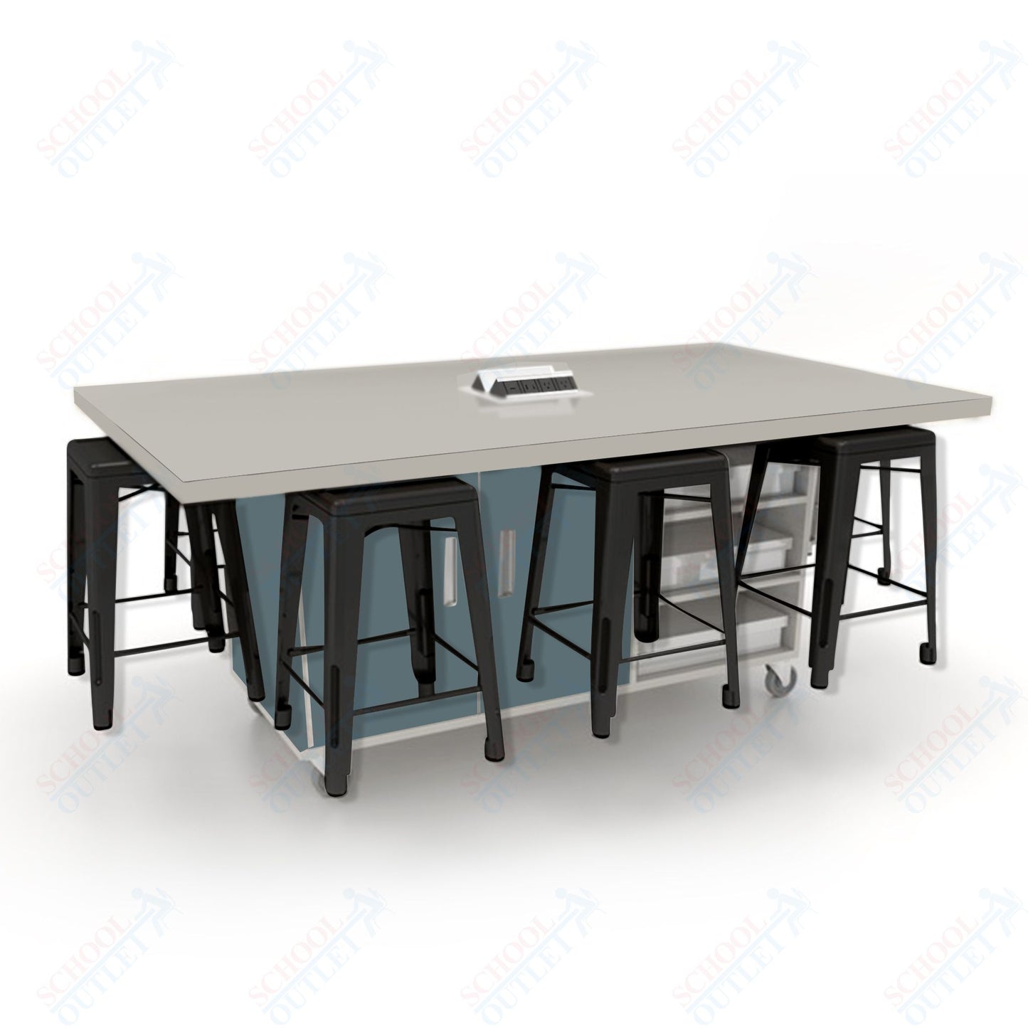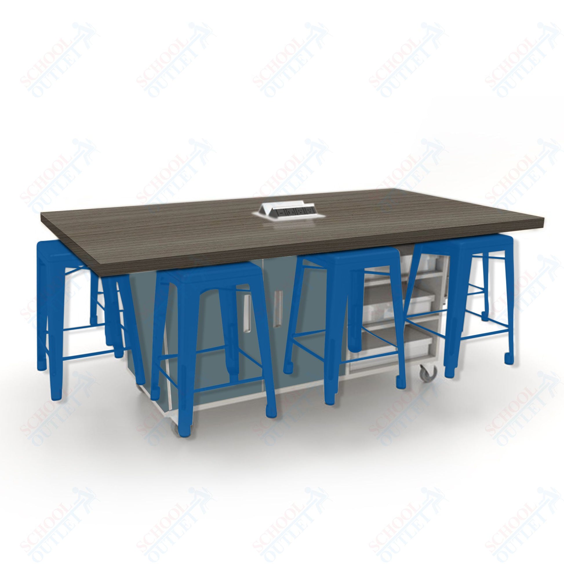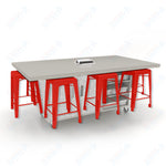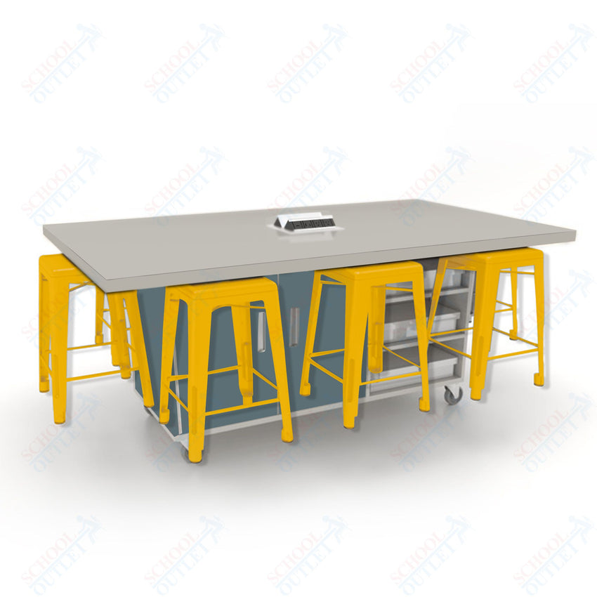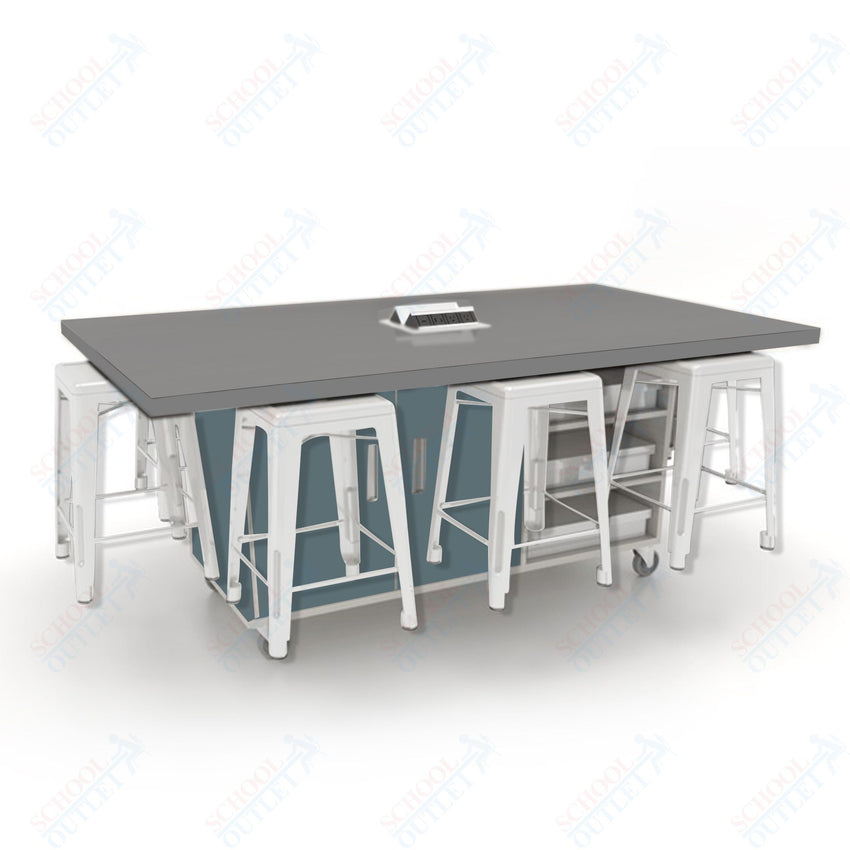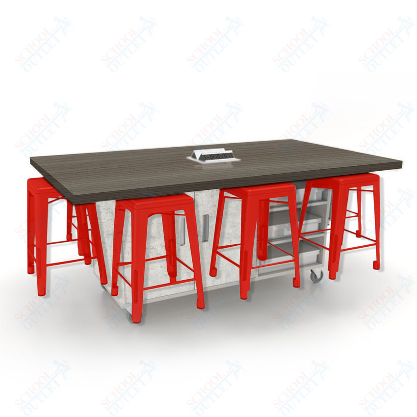 CEF ED8 Table 36"H High Pressure Laminate Top, Laminate Base with 8 Stools, Storage bins, and Electrical Outlets Included.