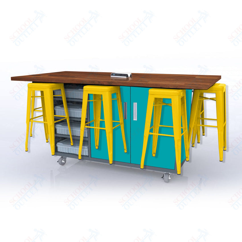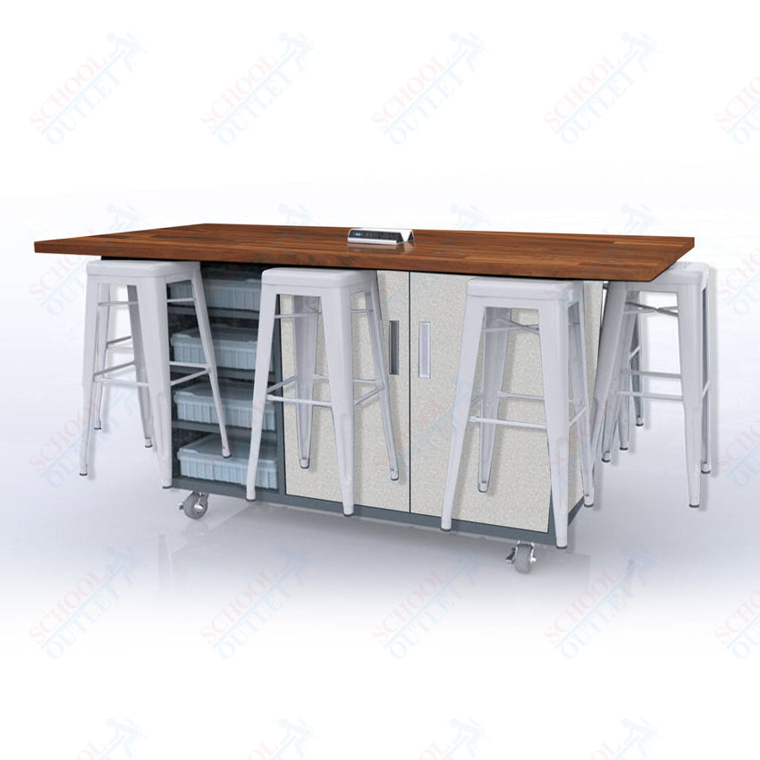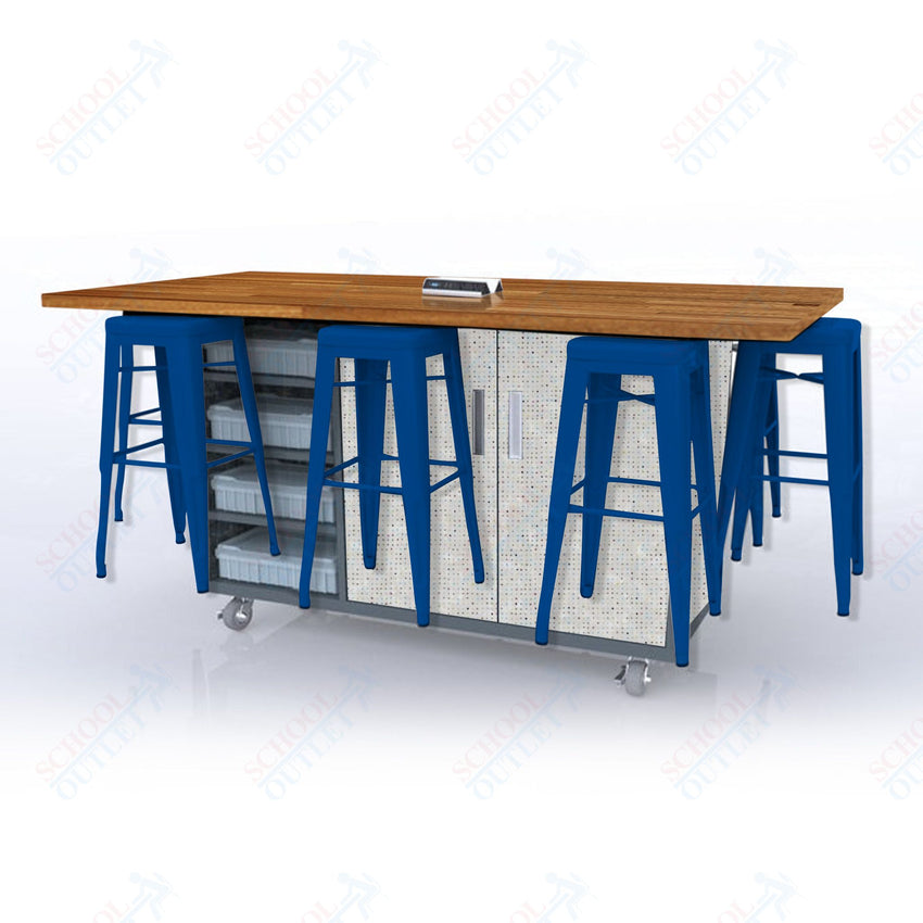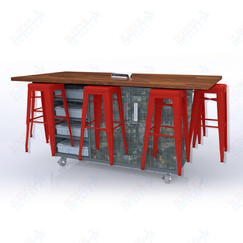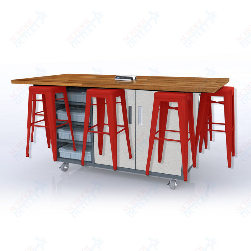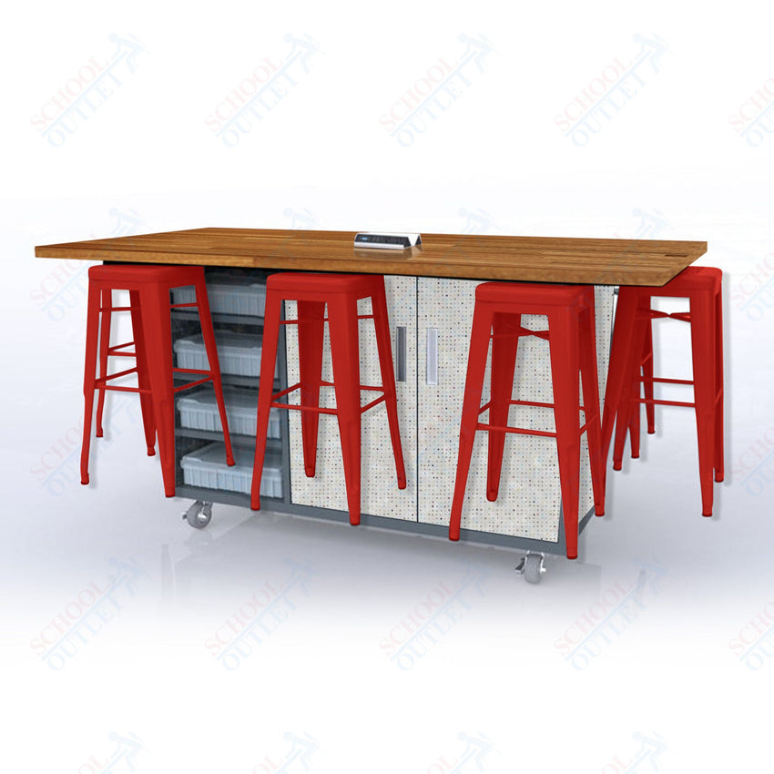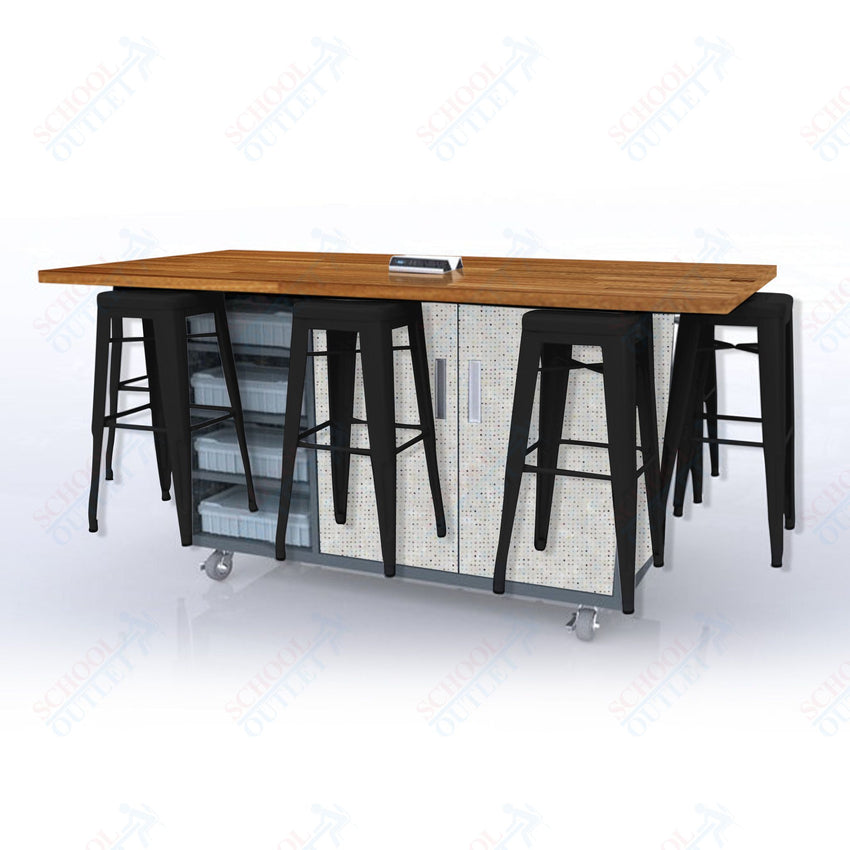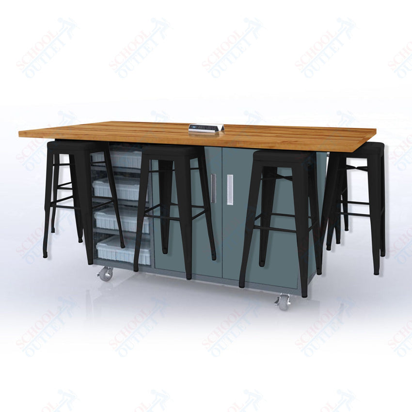 CEF ED8 Table 42"H Butcher Block Top, Laminate Base with 8 Stools, Storage bins, and Electrical Outlets Included.