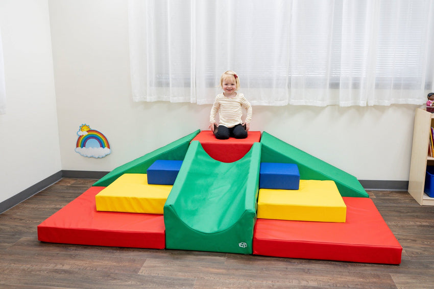 The Highlands Climber is designed to enhance toddlers' gross motor skills featuring a colorful trio of ramps and gentle steps to explore. The center ramp has a round sculpted shape that adds to the excitement.