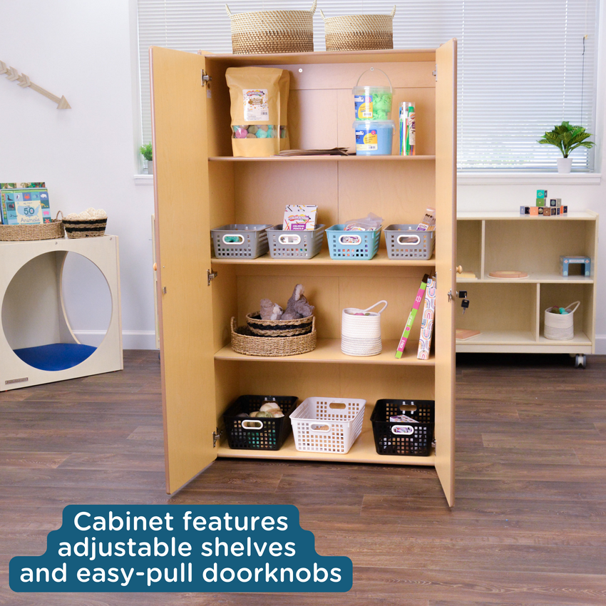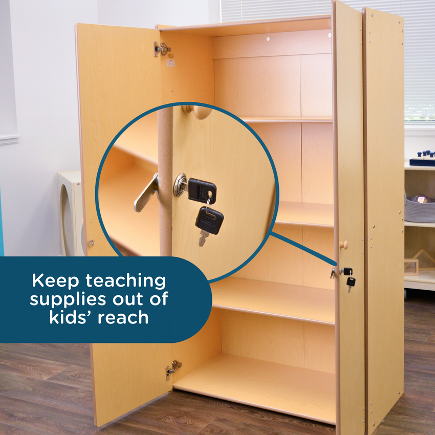 When teachers need a secure and versatile storage solution for their classroom, the Angeles Value Line™ Teacher’s Storage Cabinet is the perfect choice. This cabinet is designed to keep painting supplies, personal items, and other materials safely locked away from curious little hands. Constructed from durable, melamine laminate, it's built to withstand the rigors of a busy classroom, while its rounded corners ensure maximum safety for all children. The cabinet features three separate shelves, two of which are adjustable in five-inch increments, allowing you to customize the space to fit various items, from art supplies to confidential documents.