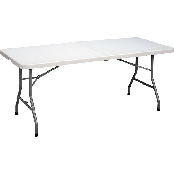 Correll's Plastic Fold-In-Half Table offers exceptional convenience and portability for any gathering. Its innovative design allows it to fold compactly to just 30" wide x 36" long, making transportation and storage a breeze. Imagine easily fitting this table into your car trunk, or even behind the front seat, ready for your next event. The lightweight blow-molded top is not only easy to handle but also resists stains and scratches, ensuring it looks great use after use.