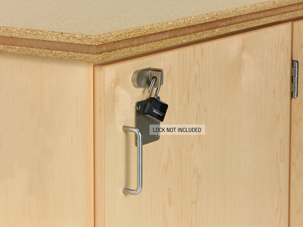 Robotic team storage for three robots and supplies. The maple plywood workbench provides three separate storage compartments. Each compartment has a rollout shelf which holds up to an 18" square robot. Also, within the compartment is a separate drawer with a customizable foam insert (included) to store tools (not included). Each compartment is outfitted to accept a combination lock. The top is ShopTop(R), which sandwiches a medium-density fiberboard between two layers of 1/2" high-density particleboard, creating a non-conductive and splinter proof top. The top is 1-1/4" thick and can be extended an extra 8" by raising it and locking. Lowering the extension allows the unit to fit through standard doorways and moves easily on six 4" heavy-duty, locking casters.