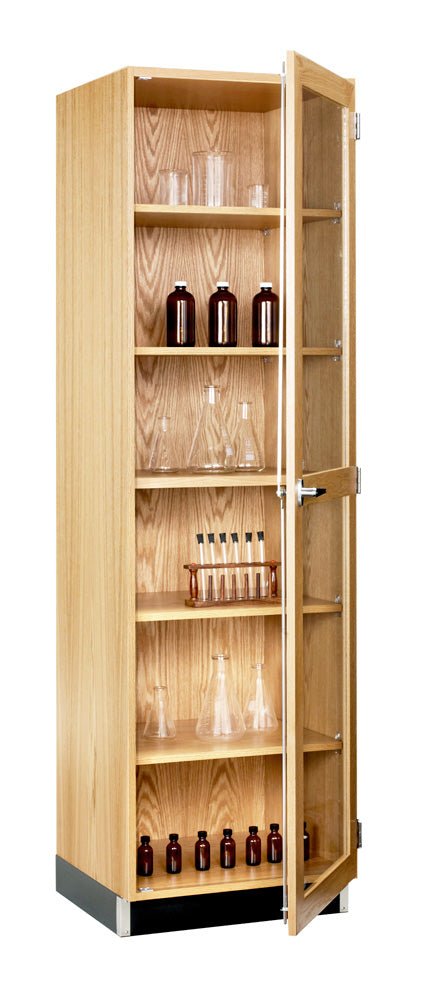Tall Storage cabinet constructed of solid oak, hardwood and oak veneers, with a clear chemical resistant UV finish. Cabinet is hinged right and has one oak framed door with 3/16" tempered glass and a three-point locking system. Unit has two fixed and four adjustable shelves. Shelves are 1"thick and the weight capacity for each shelf is 40 lbs. per sq. ft.