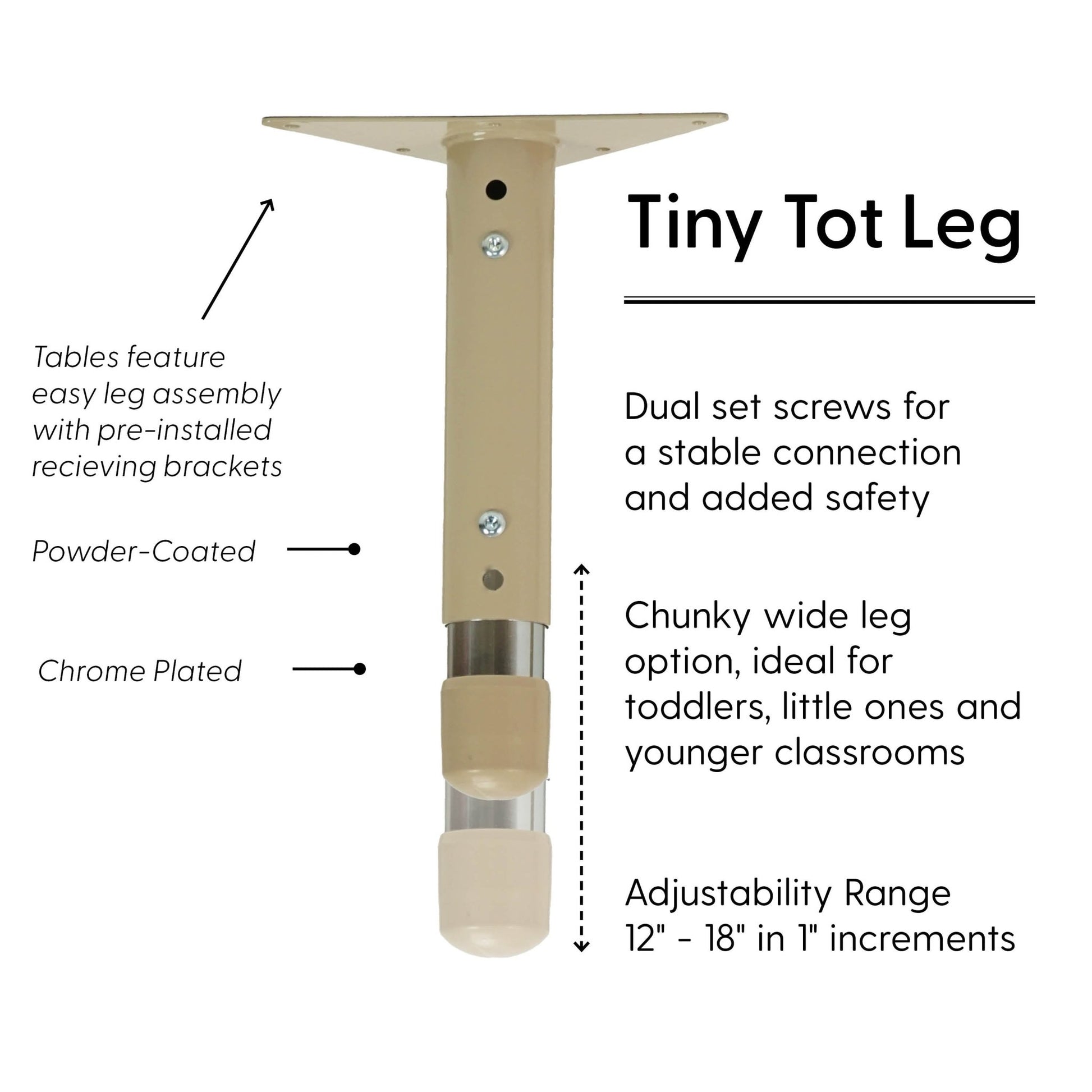 Ideal for use in daycares, playrooms, churches, recreational centers, and at home, T-Molding Activity Tables with Adjustable Tiny Tot Legs provide a durable, versatile space for toddlers to explore and play. The laminate tabletop is easy to clean between activities and features a t-molding edge band that protects from everyday wear and tear; remember to completely dry chrome table legs and glides after cleaning for safety and to maintain luster. Table legs adjust from 12-inch to 18-inch in 1-inch increments to accommodate growing toddlers. Complementary 8" Stack Chairs sold separately. NOTE: Item ships and arrives in multiple boxes. Delivery times may vary with each box.