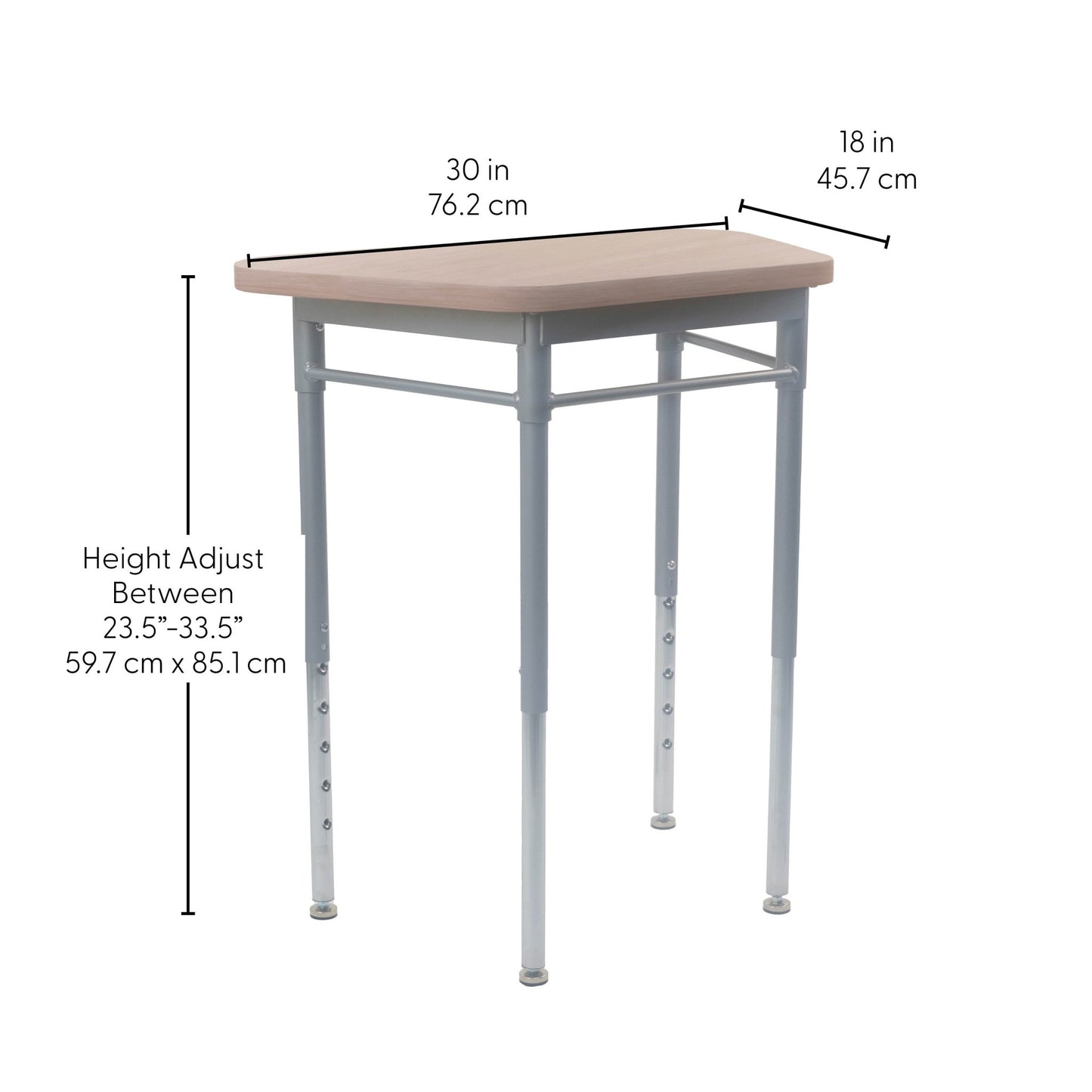 Factory Direct Partners Collaborative Trap Desks are designed to enhance any learning environment. The laminate top is stain and scratch-resistant and offers a flat writing surface that measures 30 x 18 inches. Legs adjust in 1" increments for desktop heights from 23 1/2" to 33 1/2" high. Table legs come with full sets of stationary glides and mobile casters and adjust in 1-inch increments to accommodate different uses and age groups. Available in a variety of woodgrain hues.