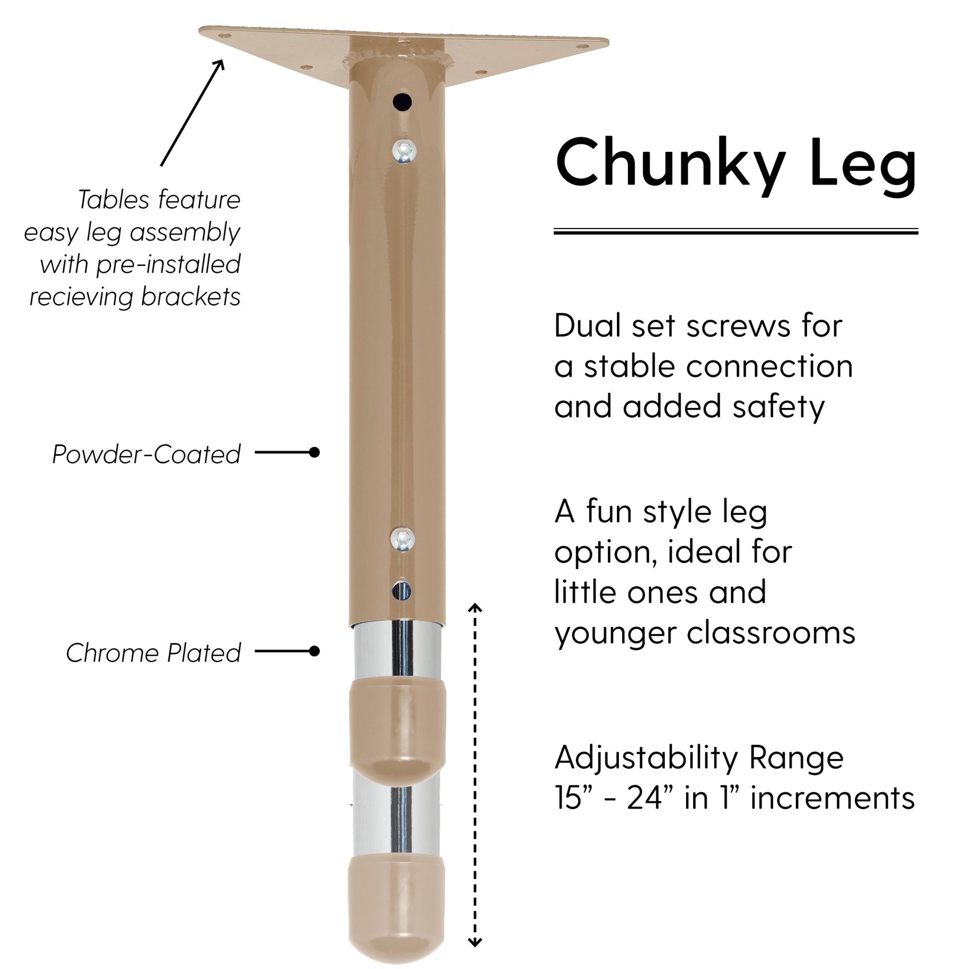 - Adjustable height: chunky table legs adjust in 1" increments for table top heights from 15" to 24" to accommodate growing children