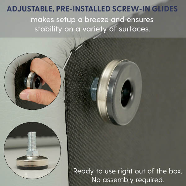 - Pre-installed Adjustable Glides: Includes adjustable glides that come pre-installed, allowing for leveling on uneven floors and protecting the base/floor.