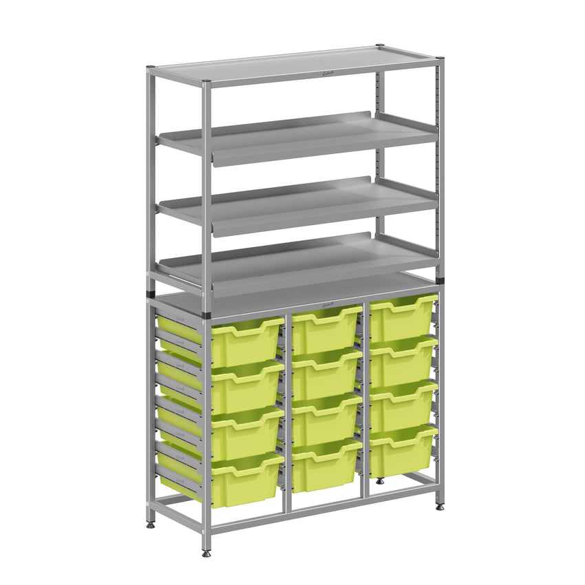 The Dynamis Combo Cart range from Gratnells is a flexible, cost-effective storage system, compatible with the award-winning Gratnells tray range. With both static frame and cart options available, the Dynamis range is perfect for any classroom environment. Gratnells trays are interchangeable between cart and frame options. You can easily move equipment around the school as needed. Dyamis Combo Cart Set 12 Silver (44) with feet 3 shelves 12-6 inch deep Trays