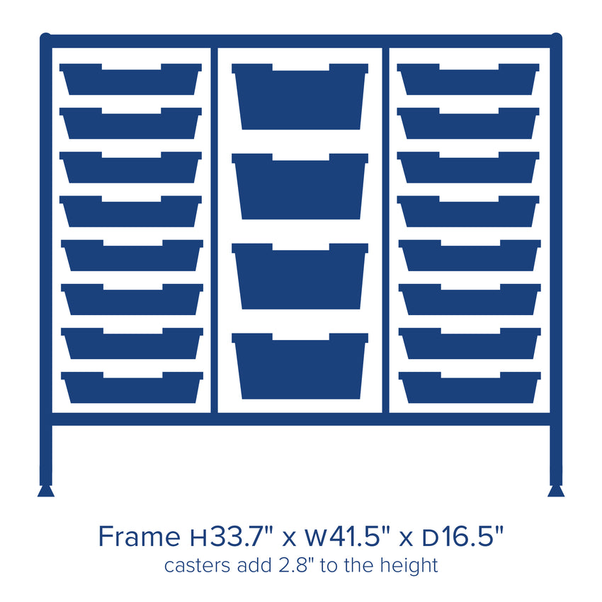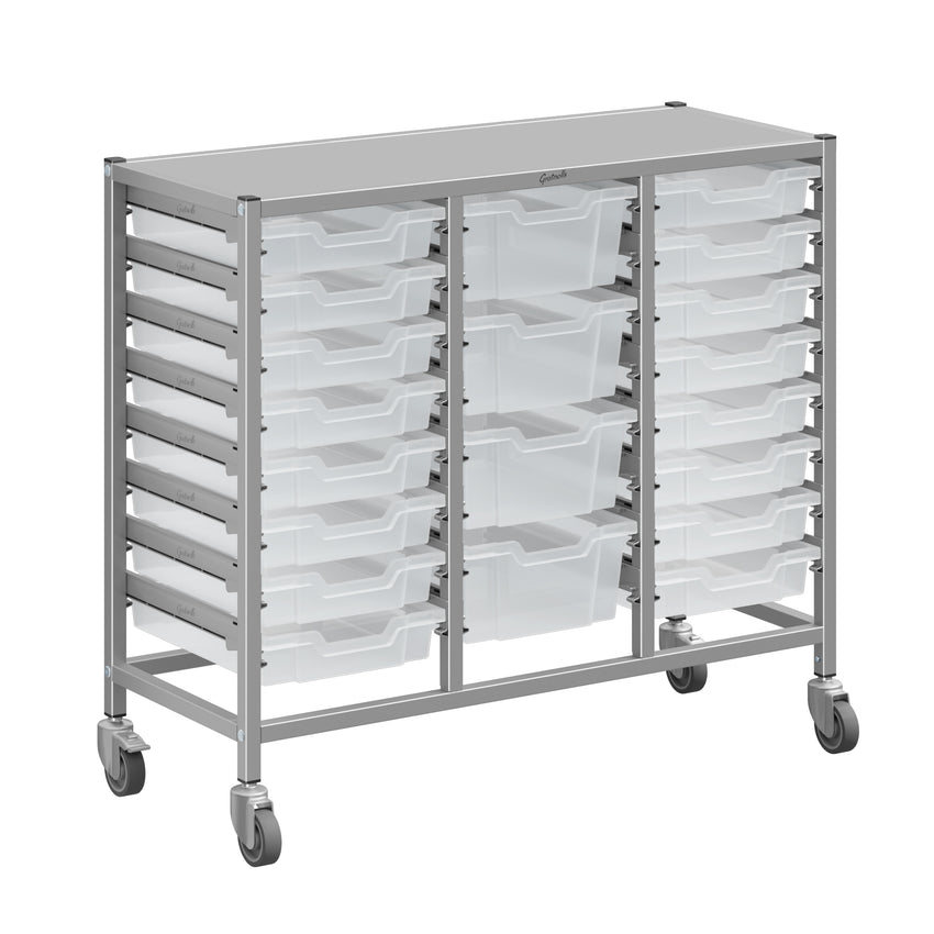 The Dynamis Triple Cart range from Gratnells is a flexible, cost-effective storage system, compatible with the award-winning Gratnells tray range. With both static frame and cart options available, the Dynamis range is perfect for any classroom environment. Gratnells trays are interchangeable between cart and frame options. You can easily move equipment around the school as needed. Dynamis Triple Cart Set 9 Silver (44) with 3" 2 Braked Casters & Optional Feet and 16-3 inch deep and 4-6 inch deep Trays